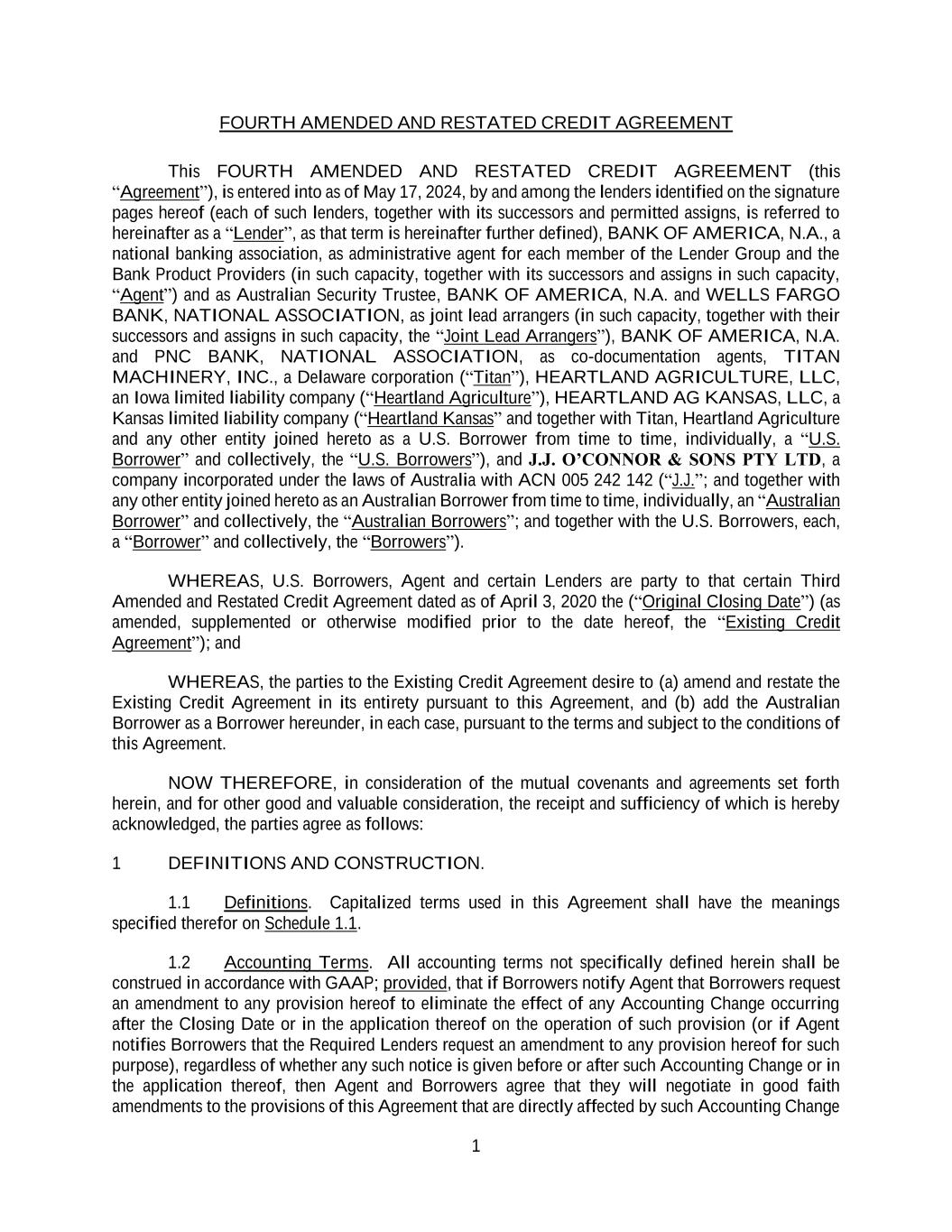 1 FOURTH AMENDED AND RESTATED CREDIT AGREEMENT This FOURTH AMENDED AND RESTATED CREDIT AGREEMENT (this “Agreement”), is entered into as of May 17, 2024, by and among the lenders identified on the signature pages hereof (each of such lenders, together with its successors and permitted assigns, is referred to hereinafter as a “Lender”, as that term is hereinafter further defined), BANK OF AMERICA, N.A., a national banking association, as administrative agent for each member of the Lender Group and the Bank Product Providers (in such capacity, together with its successors and assigns in such capacity, “Agent”) and as Australian Security Trustee, BANK OF AMERICA, N.A. and WELLS FARGO BANK, NATIONAL ASSOCIATION, as joint lead arrangers (in such capacity, together with their successors and assigns in such capacity, the “Joint Lead Arrangers”), BANK OF AMERICA, N.A. and PNC BANK, NATIONAL ASSOCIATION, as co-documentation agents, TITAN MACHINERY, INC., a Delaware corporation (“Titan”), HEARTLAND AGRICULTURE, LLC, an Iowa limited liability company (“Heartland Agriculture”), HEARTLAND AG KANSAS, LLC, a Kansas limited liability company (“Heartland Kansas” and together with Titan, Heartland Agriculture and any other entity joined hereto as a U.S. Borrower from time to time, individually, a “U.S. Borrower” and collectively, the “U.S. Borrowers”), and J.J. O’CONNOR & SONS PTY LTD, a company incorporated under the laws of Australia with ACN 005 242 142 (“J.J.”; and together with any other entity joined hereto as an Australian Borrower from time to time, individually, an “Australian Borrower” and collectively, the “Australian Borrowers”; and together with the U.S. Borrowers, each, a “Borrower” and collectively, the “Borrowers”). WHEREAS, U.S. Borrowers, Agent and certain Lenders are party to that certain Third Amended and Restated Credit Agreement dated as of April 3, 2020 the (“Original Closing Date”) (as amended, supplemented or otherwise modified prior to the date hereof, the “Existing Credit Agreement”); and WHEREAS, the parties to the Existing Credit Agreement desire to (a) amend and restate the Existing Credit Agreement in its entirety pursuant to this Agreement, and (b) add the Australian Borrower as a Borrower hereunder, in each case, pursuant to the terms and subject to the conditions of this Agreement. NOW THEREFORE, in consideration of the mutual covenants and agreements set forth herein, and for other good and valuable consideration, the receipt and sufficiency of which is hereby acknowledged, the parties agree as follows: 1 DEFINITIONS AND CONSTRUCTION. 1.1 Definitions. Capitalized terms used in this Agreement shall have the meanings specified therefor on Schedule 1.1. 1.2 Accounting Terms. All accounting terms not specifically defined herein shall be construed in accordance with GAAP; provided, that if Borrowers notify Agent that Borrowers request an amendment to any provision hereof to eliminate the effect of any Accounting Change occurring after the Closing Date or in the application thereof on the operation of such provision (or if Agent notifies Borrowers that the Required Lenders request an amendment to any provision hereof for such purpose), regardless of whether any such notice is given before or after such Accounting Change or in the application thereof, then Agent and Borrowers agree that they will negotiate in good faith amendments to the provisions of this Agreement that are directly affected by such Accounting Change