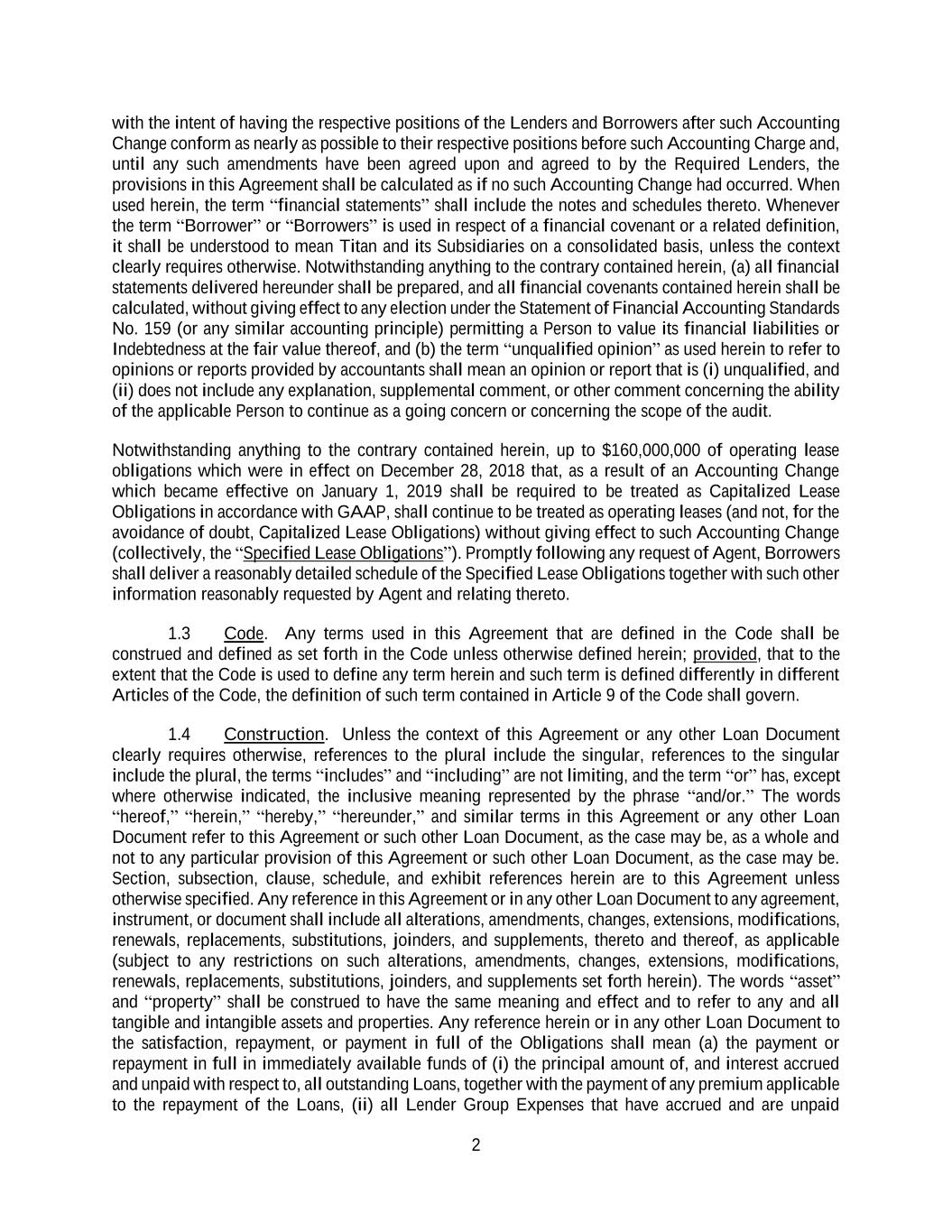 2 with the intent of having the respective positions of the Lenders and Borrowers after such Accounting Change conform as nearly as possible to their respective positions before such Accounting Charge and, until any such amendments have been agreed upon and agreed to by the Required Lenders, the provisions in this Agreement shall be calculated as if no such Accounting Change had occurred. When used herein, the term “financial statements” shall include the notes and schedules thereto. Whenever the term “Borrower” or “Borrowers” is used in respect of a financial covenant or a related definition, it shall be understood to mean Titan and its Subsidiaries on a consolidated basis, unless the context clearly requires otherwise. Notwithstanding anything to the contrary contained herein, (a) all financial statements delivered hereunder shall be prepared, and all financial covenants contained herein shall be calculated, without giving effect to any election under the Statement of Financial Accounting Standards No. 159 (or any similar accounting principle) permitting a Person to value its financial liabilities or Indebtedness at the fair value thereof, and (b) the term “unqualified opinion” as used herein to refer to opinions or reports provided by accountants shall mean an opinion or report that is (i) unqualified, and (ii) does not include any explanation, supplemental comment, or other comment concerning the ability of the applicable Person to continue as a going concern or concerning the scope of the audit. Notwithstanding anything to the contrary contained herein, up to $160,000,000 of operating lease obligations which were in effect on December 28, 2018 that, as a result of an Accounting Change which became effective on January 1, 2019 shall be required to be treated as Capitalized Lease Obligations in accordance with GAAP, shall continue to be treated as operating leases (and not, for the avoidance of doubt, Capitalized Lease Obligations) without giving effect to such Accounting Change (collectively, the “Specified Lease Obligations”). Promptly following any request of Agent, Borrowers shall deliver a reasonably detailed schedule of the Specified Lease Obligations together with such other information reasonably requested by Agent and relating thereto. 1.3 Code. Any terms used in this Agreement that are defined in the Code shall be construed and defined as set forth in the Code unless otherwise defined herein; provided, that to the extent that the Code is used to define any term herein and such term is defined differently in different Articles of the Code, the definition of such term contained in Article 9 of the Code shall govern. 1.4 Construction. Unless the context of this Agreement or any other Loan Document clearly requires otherwise, references to the plural include the singular, references to the singular include the plural, the terms “includes” and “including” are not limiting, and the term “or” has, except where otherwise indicated, the inclusive meaning represented by the phrase “and/or.” The words “hereof,” “herein,” “hereby,” “hereunder,” and similar terms in this Agreement or any other Loan Document refer to this Agreement or such other Loan Document, as the case may be, as a whole and not to any particular provision of this Agreement or such other Loan Document, as the case may be. Section, subsection, clause, schedule, and exhibit references herein are to this Agreement unless otherwise specified. Any reference in this Agreement or in any other Loan Document to any agreement, instrument, or document shall include all alterations, amendments, changes, extensions, modifications, renewals, replacements, substitutions, joinders, and supplements, thereto and thereof, as applicable (subject to any restrictions on such alterations, amendments, changes, extensions, modifications, renewals, replacements, substitutions, joinders, and supplements set forth herein). The words “asset” and “property” shall be construed to have the same meaning and effect and to refer to any and all tangible and intangible assets and properties. Any reference herein or in any other Loan Document to the satisfaction, repayment, or payment in full of the Obligations shall mean (a) the payment or repayment in full in immediately available funds of (i) the principal amount of, and interest accrued and unpaid with respect to, all outstanding Loans, together with the payment of any premium applicable to the repayment of the Loans, (ii) all Lender Group Expenses that have accrued and are unpaid