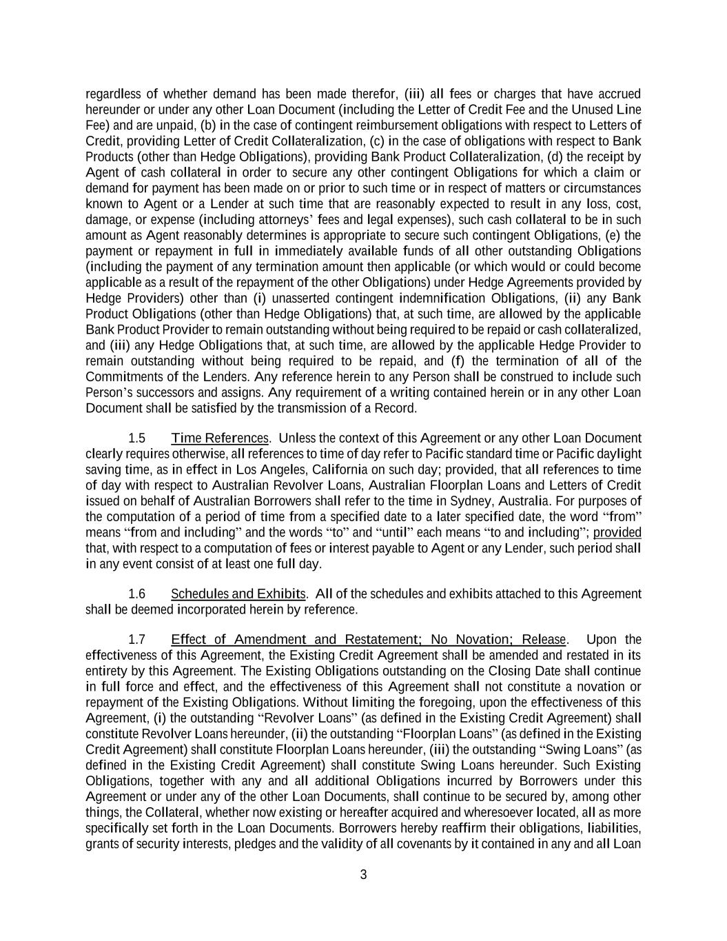 3 regardless of whether demand has been made therefor, (iii) all fees or charges that have accrued hereunder or under any other Loan Document (including the Letter of Credit Fee and the Unused Line Fee) and are unpaid, (b) in the case of contingent reimbursement obligations with respect to Letters of Credit, providing Letter of Credit Collateralization, (c) in the case of obligations with respect to Bank Products (other than Hedge Obligations), providing Bank Product Collateralization, (d) the receipt by Agent of cash collateral in order to secure any other contingent Obligations for which a claim or demand for payment has been made on or prior to such time or in respect of matters or circumstances known to Agent or a Lender at such time that are reasonably expected to result in any loss, cost, damage, or expense (including attorneys’ fees and legal expenses), such cash collateral to be in such amount as Agent reasonably determines is appropriate to secure such contingent Obligations, (e) the payment or repayment in full in immediately available funds of all other outstanding Obligations (including the payment of any termination amount then applicable (or which would or could become applicable as a result of the repayment of the other Obligations) under Hedge Agreements provided by Hedge Providers) other than (i) unasserted contingent indemnification Obligations, (ii) any Bank Product Obligations (other than Hedge Obligations) that, at such time, are allowed by the applicable Bank Product Provider to remain outstanding without being required to be repaid or cash collateralized, and (iii) any Hedge Obligations that, at such time, are allowed by the applicable Hedge Provider to remain outstanding without being required to be repaid, and (f) the termination of all of the Commitments of the Lenders. Any reference herein to any Person shall be construed to include such Person’s successors and assigns. Any requirement of a writing contained herein or in any other Loan Document shall be satisfied by the transmission of a Record. 1.5 Time References. Unless the context of this Agreement or any other Loan Document clearly requires otherwise, all references to time of day refer to Pacific standard time or Pacific daylight saving time, as in effect in Los Angeles, California on such day; provided, that all references to time of day with respect to Australian Revolver Loans, Australian Floorplan Loans and Letters of Credit issued on behalf of Australian Borrowers shall refer to the time in Sydney, Australia. For purposes of the computation of a period of time from a specified date to a later specified date, the word “from” means “from and including” and the words “to” and “until” each means “to and including”; provided that, with respect to a computation of fees or interest payable to Agent or any Lender, such period shall in any event consist of at least one full day. 1.6 Schedules and Exhibits. All of the schedules and exhibits attached to this Agreement shall be deemed incorporated herein by reference. 1.7 Effect of Amendment and Restatement; No Novation; Release. Upon the effectiveness of this Agreement, the Existing Credit Agreement shall be amended and restated in its entirety by this Agreement. The Existing Obligations outstanding on the Closing Date shall continue in full force and effect, and the effectiveness of this Agreement shall not constitute a novation or repayment of the Existing Obligations. Without limiting the foregoing, upon the effectiveness of this Agreement, (i) the outstanding “Revolver Loans” (as defined in the Existing Credit Agreement) shall constitute Revolver Loans hereunder, (ii) the outstanding “Floorplan Loans” (as defined in the Existing Credit Agreement) shall constitute Floorplan Loans hereunder, (iii) the outstanding “Swing Loans” (as defined in the Existing Credit Agreement) shall constitute Swing Loans hereunder. Such Existing Obligations, together with any and all additional Obligations incurred by Borrowers under this Agreement or under any of the other Loan Documents, shall continue to be secured by, among other things, the Collateral, whether now existing or hereafter acquired and wheresoever located, all as more specifically set forth in the Loan Documents. Borrowers hereby reaffirm their obligations, liabilities, grants of security interests, pledges and the validity of all covenants by it contained in any and all Loan