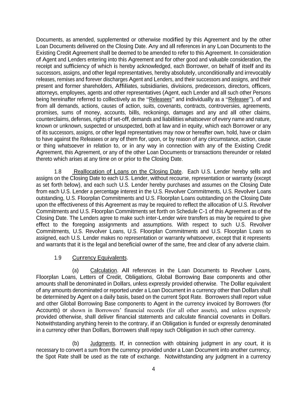 4 Documents, as amended, supplemented or otherwise modified by this Agreement and by the other Loan Documents delivered on the Closing Date. Any and all references in any Loan Documents to the Existing Credit Agreement shall be deemed to be amended to refer to this Agreement. In consideration of Agent and Lenders entering into this Agreement and for other good and valuable consideration, the receipt and sufficiency of which is hereby acknowledged, each Borrower, on behalf of itself and its successors, assigns, and other legal representatives, hereby absolutely, unconditionally and irrevocably releases, remises and forever discharges Agent and Lenders, and their successors and assigns, and their present and former shareholders, Affiliates, subsidiaries, divisions, predecessors, directors, officers, attorneys, employees, agents and other representatives (Agent, each Lender and all such other Persons being hereinafter referred to collectively as the “Releasees” and individually as a “Releasee”), of and from all demands, actions, causes of action, suits, covenants, contracts, controversies, agreements, promises, sums of money, accounts, bills, reckonings, damages and any and all other claims, counterclaims, defenses, rights of set-off, demands and liabilities whatsoever of every name and nature, known or unknown, suspected or unsuspected, both at law and in equity, which each Borrower or any of its successors, assigns, or other legal representatives may now or hereafter own, hold, have or claim to have against the Releasees or any of them for, upon, or by reason of any circumstance, action, cause or thing whatsoever in relation to, or in any way in connection with any of the Existing Credit Agreement, this Agreement, or any of the other Loan Documents or transactions thereunder or related thereto which arises at any time on or prior to the Closing Date. 1.8 Reallocation of Loans on the Closing Date. Each U.S. Lender hereby sells and assigns on the Closing Date to each U.S. Lender, without recourse, representation or warranty (except as set forth below), and each such U.S. Lender hereby purchases and assumes on the Closing Date from each U.S. Lender a percentage interest in the U.S. Revolver Commitments, U.S. Revolver Loans outstanding, U.S. Floorplan Commitments and U.S. Floorplan Loans outstanding on the Closing Date upon the effectiveness of this Agreement as may be required to reflect the allocation of U.S. Revolver Commitments and U.S. Floorplan Commitments set forth on Schedule C-1 of this Agreement as of the Closing Date. The Lenders agree to make such inter-Lender wire transfers as may be required to give effect to the foregoing assignments and assumptions. With respect to such U.S. Revolver Commitments, U.S. Revolver Loans, U.S. Floorplan Commitments and U.S. Floorplan Loans so assigned, each U.S. Lender makes no representation or warranty whatsoever, except that it represents and warrants that it is the legal and beneficial owner of the same, free and clear of any adverse claim. 1.9 Currency Equivalents. (a) Calculation. All references in the Loan Documents to Revolver Loans, Floorplan Loans, Letters of Credit, Obligations, Global Borrowing Base components and other amounts shall be denominated in Dollars, unless expressly provided otherwise. The Dollar equivalent of any amounts denominated or reported under a Loan Document in a currency other than Dollars shall be determined by Agent on a daily basis, based on the current Spot Rate. Borrowers shall report value and other Global Borrowing Base components to Agent in the currency invoiced by Borrowers (for Accounts) or shown in Borrowers’ financial records (for all other assets), and unless expressly provided otherwise, shall deliver financial statements and calculate financial covenants in Dollars. Notwithstanding anything herein to the contrary, if an Obligation is funded or expressly denominated in a currency other than Dollars, Borrowers shall repay such Obligation in such other currency. (b) Judgments. If, in connection with obtaining judgment in any court, it is necessary to convert a sum from the currency provided under a Loan Document into another currency, the Spot Rate shall be used as the rate of exchange. Notwithstanding any judgment in a currency