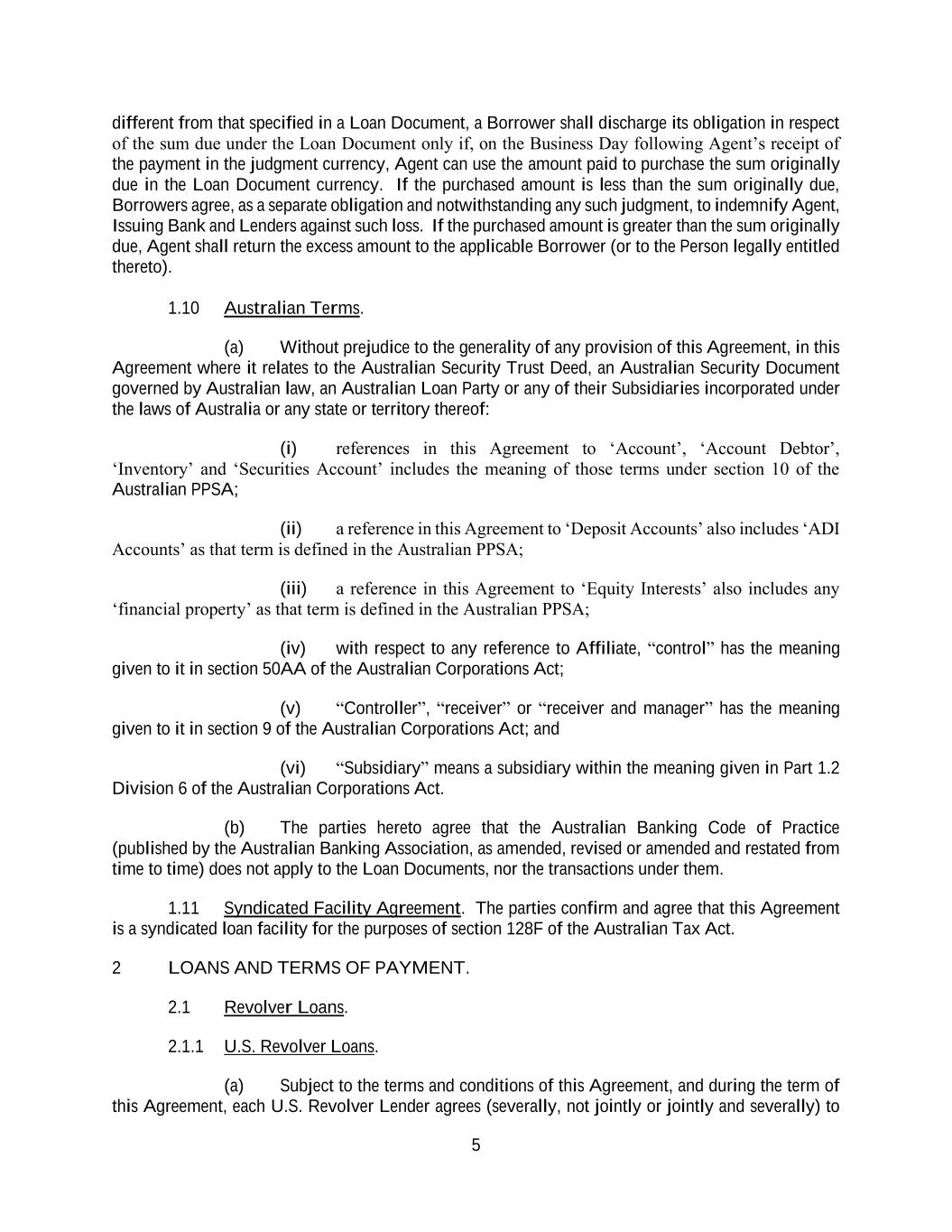 5 different from that specified in a Loan Document, a Borrower shall discharge its obligation in respect of the sum due under the Loan Document only if, on the Business Day following Agent’s receipt of the payment in the judgment currency, Agent can use the amount paid to purchase the sum originally due in the Loan Document currency. If the purchased amount is less than the sum originally due, Borrowers agree, as a separate obligation and notwithstanding any such judgment, to indemnify Agent, Issuing Bank and Lenders against such loss. If the purchased amount is greater than the sum originally due, Agent shall return the excess amount to the applicable Borrower (or to the Person legally entitled thereto). 1.10 Australian Terms. (a) Without prejudice to the generality of any provision of this Agreement, in this Agreement where it relates to the Australian Security Trust Deed, an Australian Security Document governed by Australian law, an Australian Loan Party or any of their Subsidiaries incorporated under the laws of Australia or any state or territory thereof: (i) references in this Agreement to ‘Account’, ‘Account Debtor’, ‘Inventory’ and ‘Securities Account’ includes the meaning of those terms under section 10 of the Australian PPSA; (ii) a reference in this Agreement to ‘Deposit Accounts’ also includes ‘ADI Accounts’ as that term is defined in the Australian PPSA; (iii) a reference in this Agreement to ‘Equity Interests’ also includes any ‘financial property’ as that term is defined in the Australian PPSA; (iv) with respect to any reference to Affiliate, “control” has the meaning given to it in section 50AA of the Australian Corporations Act; (v) “Controller”, “receiver” or “receiver and manager” has the meaning given to it in section 9 of the Australian Corporations Act; and (vi) “Subsidiary” means a subsidiary within the meaning given in Part 1.2 Division 6 of the Australian Corporations Act. (b) The parties hereto agree that the Australian Banking Code of Practice (published by the Australian Banking Association, as amended, revised or amended and restated from time to time) does not apply to the Loan Documents, nor the transactions under them. 1.11 Syndicated Facility Agreement. The parties confirm and agree that this Agreement is a syndicated loan facility for the purposes of section 128F of the Australian Tax Act. 2 LOANS AND TERMS OF PAYMENT. 2.1 Revolver Loans. 2.1.1 U.S. Revolver Loans. (a) Subject to the terms and conditions of this Agreement, and during the term of this Agreement, each U.S. Revolver Lender agrees (severally, not jointly or jointly and severally) to