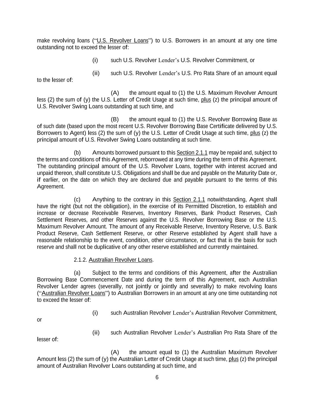 6 make revolving loans (“U.S. Revolver Loans”) to U.S. Borrowers in an amount at any one time outstanding not to exceed the lesser of: (i) such U.S. Revolver Lender’s U.S. Revolver Commitment, or (ii) such U.S. Revolver Lender’s U.S. Pro Rata Share of an amount equal to the lesser of: (A) the amount equal to (1) the U.S. Maximum Revolver Amount less (2) the sum of (y) the U.S. Letter of Credit Usage at such time, plus (z) the principal amount of U.S. Revolver Swing Loans outstanding at such time, and (B) the amount equal to (1) the U.S. Revolver Borrowing Base as of such date (based upon the most recent U.S. Revolver Borrowing Base Certificate delivered by U.S. Borrowers to Agent) less (2) the sum of (y) the U.S. Letter of Credit Usage at such time, plus (z) the principal amount of U.S. Revolver Swing Loans outstanding at such time. (b) Amounts borrowed pursuant to this Section 2.1.1 may be repaid and, subject to the terms and conditions of this Agreement, reborrowed at any time during the term of this Agreement. The outstanding principal amount of the U.S. Revolver Loans, together with interest accrued and unpaid thereon, shall constitute U.S. Obligations and shall be due and payable on the Maturity Date or, if earlier, on the date on which they are declared due and payable pursuant to the terms of this Agreement. (c) Anything to the contrary in this Section 2.1.1 notwithstanding, Agent shall have the right (but not the obligation), in the exercise of its Permitted Discretion, to establish and increase or decrease Receivable Reserves, Inventory Reserves, Bank Product Reserves, Cash Settlement Reserves, and other Reserves against the U.S. Revolver Borrowing Base or the U.S. Maximum Revolver Amount. The amount of any Receivable Reserve, Inventory Reserve, U.S. Bank Product Reserve, Cash Settlement Reserve, or other Reserve established by Agent shall have a reasonable relationship to the event, condition, other circumstance, or fact that is the basis for such reserve and shall not be duplicative of any other reserve established and currently maintained. 2.1.2. Australian Revolver Loans. (a) Subject to the terms and conditions of this Agreement, after the Australian Borrowing Base Commencement Date and during the term of this Agreement, each Australian Revolver Lender agrees (severally, not jointly or jointly and severally) to make revolving loans (“Australian Revolver Loans”) to Australian Borrowers in an amount at any one time outstanding not to exceed the lesser of: (i) such Australian Revolver Lender’s Australian Revolver Commitment, or (ii) such Australian Revolver Lender’s Australian Pro Rata Share of the lesser of: (A) the amount equal to (1) the Australian Maximum Revolver Amount less (2) the sum of (y) the Australian Letter of Credit Usage at such time, plus (z) the principal amount of Australian Revolver Loans outstanding at such time, and