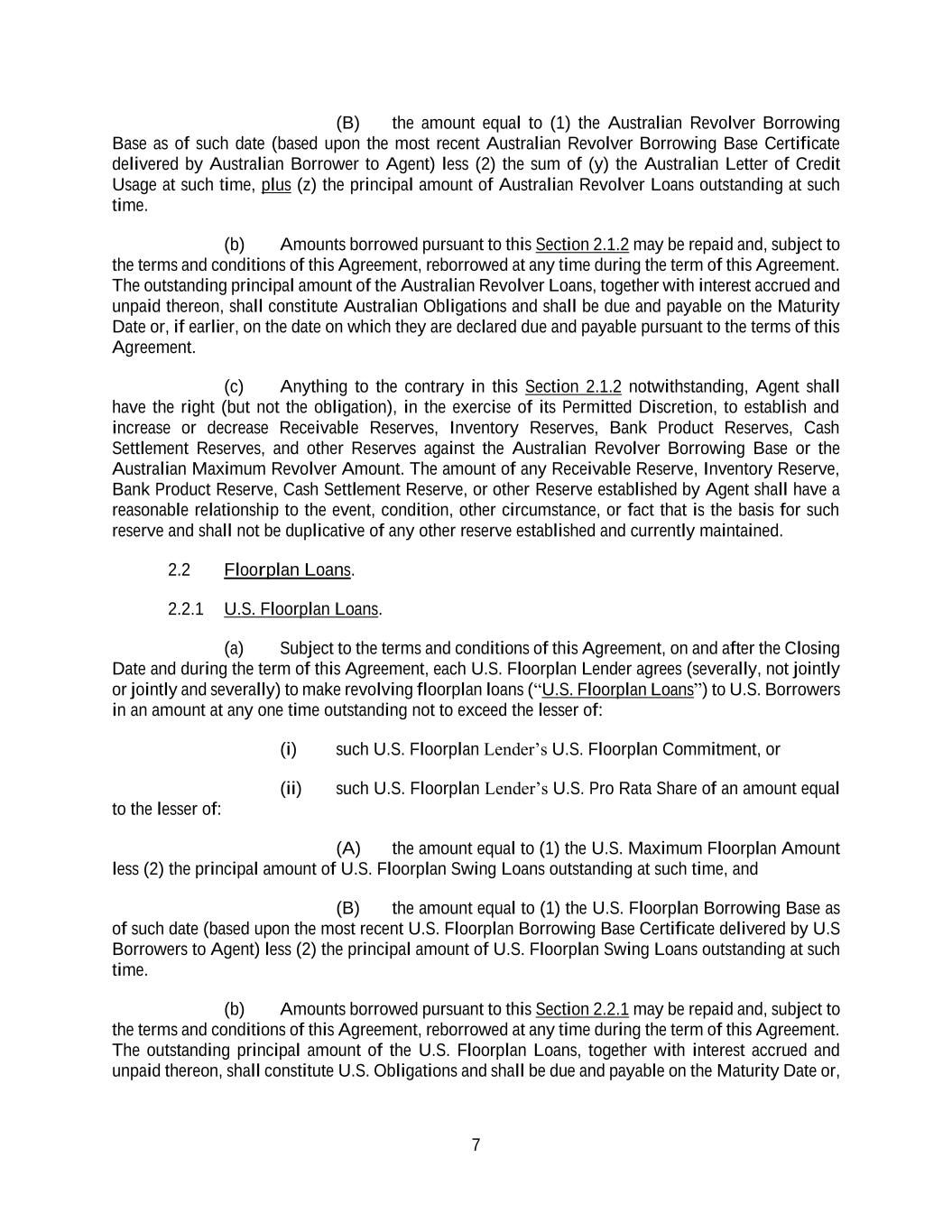 7 (B) the amount equal to (1) the Australian Revolver Borrowing Base as of such date (based upon the most recent Australian Revolver Borrowing Base Certificate delivered by Australian Borrower to Agent) less (2) the sum of (y) the Australian Letter of Credit Usage at such time, plus (z) the principal amount of Australian Revolver Loans outstanding at such time. (b) Amounts borrowed pursuant to this Section 2.1.2 may be repaid and, subject to the terms and conditions of this Agreement, reborrowed at any time during the term of this Agreement. The outstanding principal amount of the Australian Revolver Loans, together with interest accrued and unpaid thereon, shall constitute Australian Obligations and shall be due and payable on the Maturity Date or, if earlier, on the date on which they are declared due and payable pursuant to the terms of this Agreement. (c) Anything to the contrary in this Section 2.1.2 notwithstanding, Agent shall have the right (but not the obligation), in the exercise of its Permitted Discretion, to establish and increase or decrease Receivable Reserves, Inventory Reserves, Bank Product Reserves, Cash Settlement Reserves, and other Reserves against the Australian Revolver Borrowing Base or the Australian Maximum Revolver Amount. The amount of any Receivable Reserve, Inventory Reserve, Bank Product Reserve, Cash Settlement Reserve, or other Reserve established by Agent shall have a reasonable relationship to the event, condition, other circumstance, or fact that is the basis for such reserve and shall not be duplicative of any other reserve established and currently maintained. 2.2 Floorplan Loans. 2.2.1 U.S. Floorplan Loans. (a) Subject to the terms and conditions of this Agreement, on and after the Closing Date and during the term of this Agreement, each U.S. Floorplan Lender agrees (severally, not jointly or jointly and severally) to make revolving floorplan loans (“U.S. Floorplan Loans”) to U.S. Borrowers in an amount at any one time outstanding not to exceed the lesser of: (i) such U.S. Floorplan Lender’s U.S. Floorplan Commitment, or (ii) such U.S. Floorplan Lender’s U.S. Pro Rata Share of an amount equal to the lesser of: (A) the amount equal to (1) the U.S. Maximum Floorplan Amount less (2) the principal amount of U.S. Floorplan Swing Loans outstanding at such time, and (B) the amount equal to (1) the U.S. Floorplan Borrowing Base as of such date (based upon the most recent U.S. Floorplan Borrowing Base Certificate delivered by U.S Borrowers to Agent) less (2) the principal amount of U.S. Floorplan Swing Loans outstanding at such time. (b) Amounts borrowed pursuant to this Section 2.2.1 may be repaid and, subject to the terms and conditions of this Agreement, reborrowed at any time during the term of this Agreement. The outstanding principal amount of the U.S. Floorplan Loans, together with interest accrued and unpaid thereon, shall constitute U.S. Obligations and shall be due and payable on the Maturity Date or,