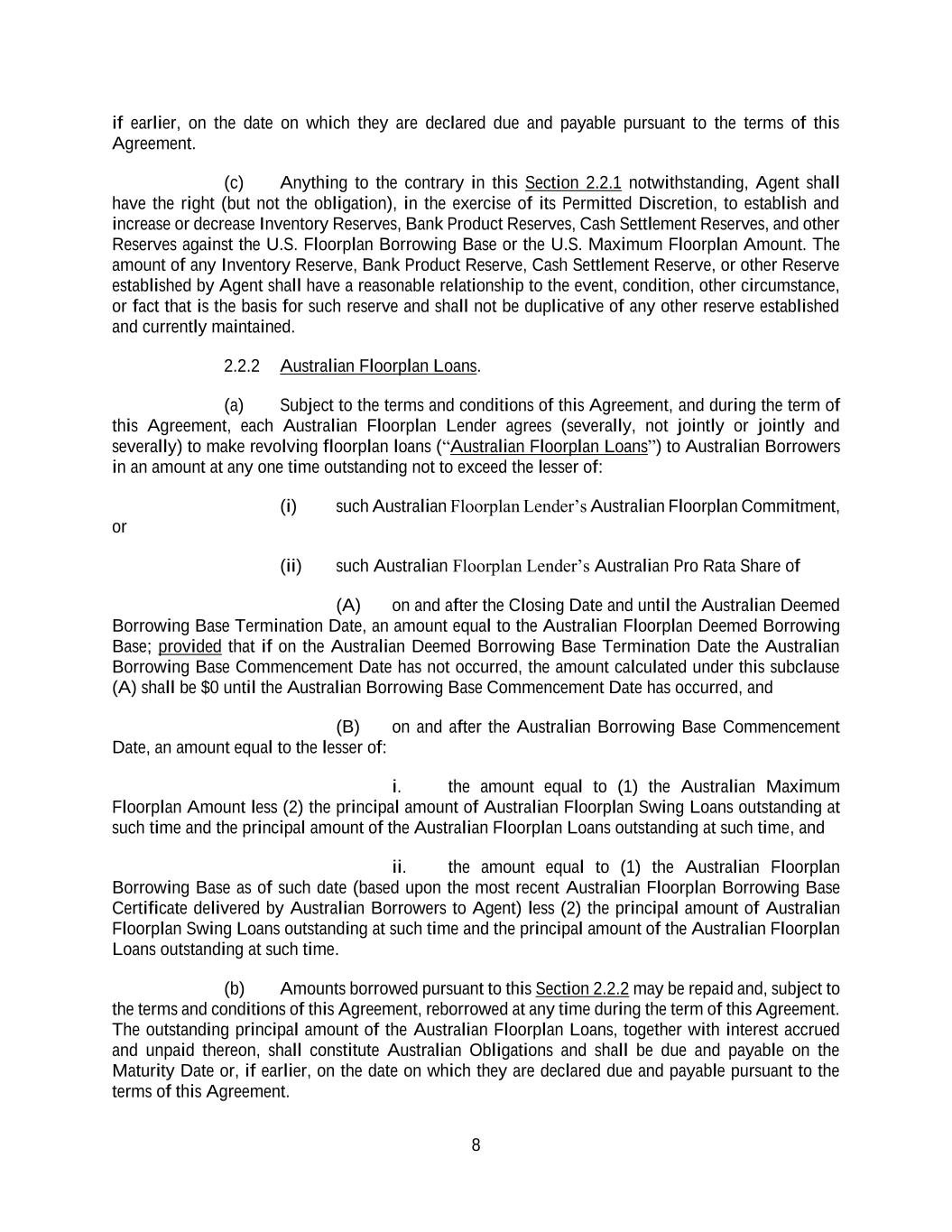 8 if earlier, on the date on which they are declared due and payable pursuant to the terms of this Agreement. (c) Anything to the contrary in this Section 2.2.1 notwithstanding, Agent shall have the right (but not the obligation), in the exercise of its Permitted Discretion, to establish and increase or decrease Inventory Reserves, Bank Product Reserves, Cash Settlement Reserves, and other Reserves against the U.S. Floorplan Borrowing Base or the U.S. Maximum Floorplan Amount. The amount of any Inventory Reserve, Bank Product Reserve, Cash Settlement Reserve, or other Reserve established by Agent shall have a reasonable relationship to the event, condition, other circumstance, or fact that is the basis for such reserve and shall not be duplicative of any other reserve established and currently maintained. 2.2.2 Australian Floorplan Loans. (a) Subject to the terms and conditions of this Agreement, and during the term of this Agreement, each Australian Floorplan Lender agrees (severally, not jointly or jointly and severally) to make revolving floorplan loans (“Australian Floorplan Loans”) to Australian Borrowers in an amount at any one time outstanding not to exceed the lesser of: (i) such Australian Floorplan Lender’s Australian Floorplan Commitment, or (ii) such Australian Floorplan Lender’s Australian Pro Rata Share of (A) on and after the Closing Date and until the Australian Deemed Borrowing Base Termination Date, an amount equal to the Australian Floorplan Deemed Borrowing Base; provided that if on the Australian Deemed Borrowing Base Termination Date the Australian Borrowing Base Commencement Date has not occurred, the amount calculated under this subclause (A) shall be $0 until the Australian Borrowing Base Commencement Date has occurred, and (B) on and after the Australian Borrowing Base Commencement Date, an amount equal to the lesser of: i. the amount equal to (1) the Australian Maximum Floorplan Amount less (2) the principal amount of Australian Floorplan Swing Loans outstanding at such time and the principal amount of the Australian Floorplan Loans outstanding at such time, and ii. the amount equal to (1) the Australian Floorplan Borrowing Base as of such date (based upon the most recent Australian Floorplan Borrowing Base Certificate delivered by Australian Borrowers to Agent) less (2) the principal amount of Australian Floorplan Swing Loans outstanding at such time and the principal amount of the Australian Floorplan Loans outstanding at such time. (b) Amounts borrowed pursuant to this Section 2.2.2 may be repaid and, subject to the terms and conditions of this Agreement, reborrowed at any time during the term of this Agreement. The outstanding principal amount of the Australian Floorplan Loans, together with interest accrued and unpaid thereon, shall constitute Australian Obligations and shall be due and payable on the Maturity Date or, if earlier, on the date on which they are declared due and payable pursuant to the terms of this Agreement.