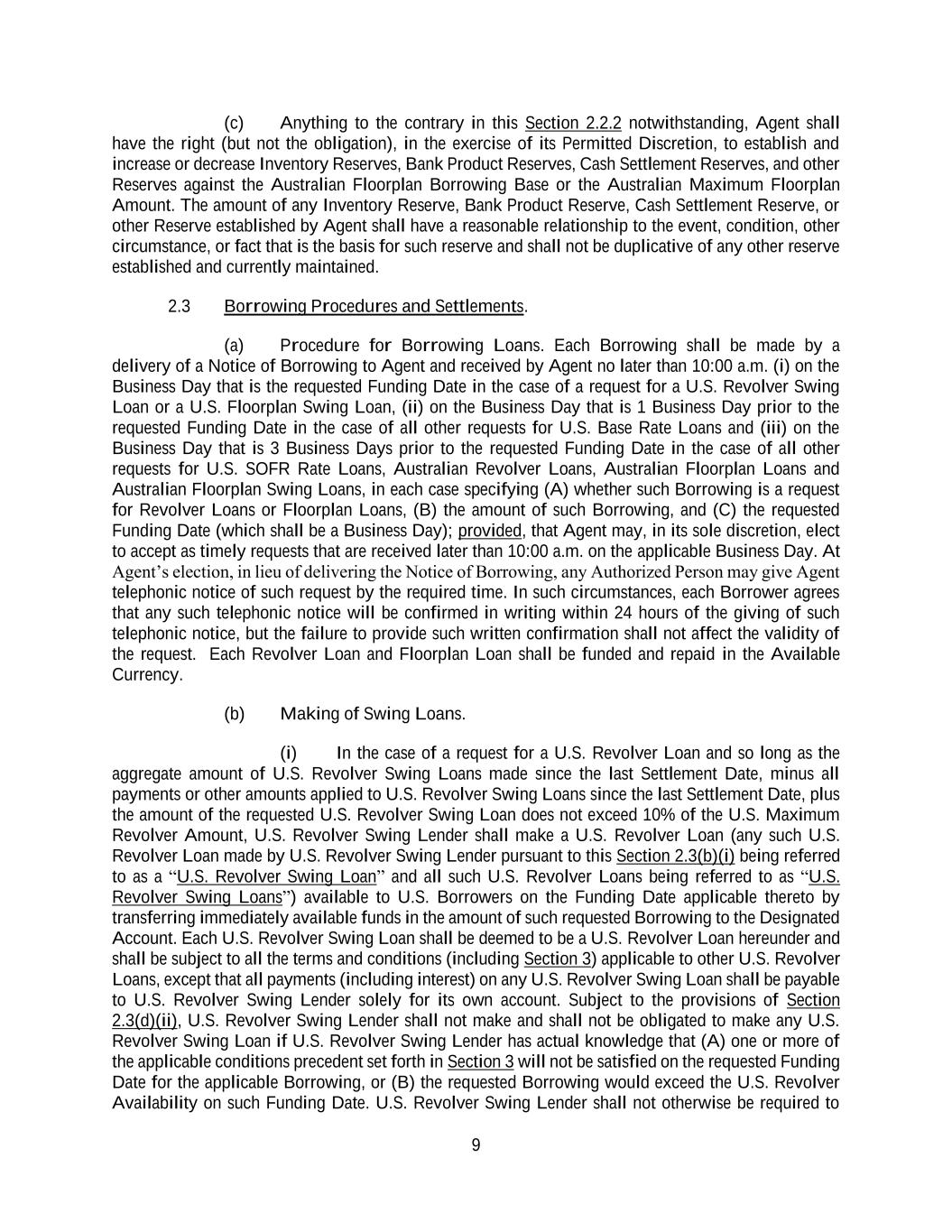 9 (c) Anything to the contrary in this Section 2.2.2 notwithstanding, Agent shall have the right (but not the obligation), in the exercise of its Permitted Discretion, to establish and increase or decrease Inventory Reserves, Bank Product Reserves, Cash Settlement Reserves, and other Reserves against the Australian Floorplan Borrowing Base or the Australian Maximum Floorplan Amount. The amount of any Inventory Reserve, Bank Product Reserve, Cash Settlement Reserve, or other Reserve established by Agent shall have a reasonable relationship to the event, condition, other circumstance, or fact that is the basis for such reserve and shall not be duplicative of any other reserve established and currently maintained. 2.3 Borrowing Procedures and Settlements. (a) Procedure for Borrowing Loans. Each Borrowing shall be made by a delivery of a Notice of Borrowing to Agent and received by Agent no later than 10:00 a.m. (i) on the Business Day that is the requested Funding Date in the case of a request for a U.S. Revolver Swing Loan or a U.S. Floorplan Swing Loan, (ii) on the Business Day that is 1 Business Day prior to the requested Funding Date in the case of all other requests for U.S. Base Rate Loans and (iii) on the Business Day that is 3 Business Days prior to the requested Funding Date in the case of all other requests for U.S. SOFR Rate Loans, Australian Revolver Loans, Australian Floorplan Loans and Australian Floorplan Swing Loans, in each case specifying (A) whether such Borrowing is a request for Revolver Loans or Floorplan Loans, (B) the amount of such Borrowing, and (C) the requested Funding Date (which shall be a Business Day); provided, that Agent may, in its sole discretion, elect to accept as timely requests that are received later than 10:00 a.m. on the applicable Business Day. At Agent’s election, in lieu of delivering the Notice of Borrowing, any Authorized Person may give Agent telephonic notice of such request by the required time. In such circumstances, each Borrower agrees that any such telephonic notice will be confirmed in writing within 24 hours of the giving of such telephonic notice, but the failure to provide such written confirmation shall not affect the validity of the request. Each Revolver Loan and Floorplan Loan shall be funded and repaid in the Available Currency. (b) Making of Swing Loans. (i) In the case of a request for a U.S. Revolver Loan and so long as the aggregate amount of U.S. Revolver Swing Loans made since the last Settlement Date, minus all payments or other amounts applied to U.S. Revolver Swing Loans since the last Settlement Date, plus the amount of the requested U.S. Revolver Swing Loan does not exceed 10% of the U.S. Maximum Revolver Amount, U.S. Revolver Swing Lender shall make a U.S. Revolver Loan (any such U.S. Revolver Loan made by U.S. Revolver Swing Lender pursuant to this Section 2.3(b)(i) being referred to as a “U.S. Revolver Swing Loan” and all such U.S. Revolver Loans being referred to as “U.S. Revolver Swing Loans”) available to U.S. Borrowers on the Funding Date applicable thereto by transferring immediately available funds in the amount of such requested Borrowing to the Designated Account. Each U.S. Revolver Swing Loan shall be deemed to be a U.S. Revolver Loan hereunder and shall be subject to all the terms and conditions (including Section 3) applicable to other U.S. Revolver Loans, except that all payments (including interest) on any U.S. Revolver Swing Loan shall be payable to U.S. Revolver Swing Lender solely for its own account. Subject to the provisions of Section 2.3(d)(ii), U.S. Revolver Swing Lender shall not make and shall not be obligated to make any U.S. Revolver Swing Loan if U.S. Revolver Swing Lender has actual knowledge that (A) one or more of the applicable conditions precedent set forth in Section 3 will not be satisfied on the requested Funding Date for the applicable Borrowing, or (B) the requested Borrowing would exceed the U.S. Revolver Availability on such Funding Date. U.S. Revolver Swing Lender shall not otherwise be required to
