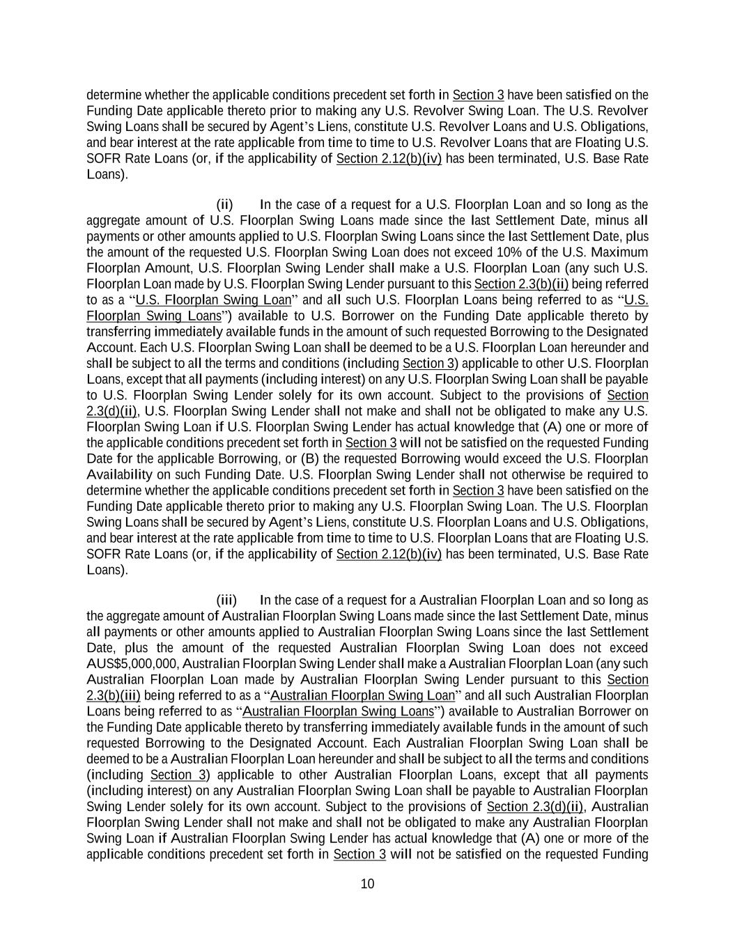10 determine whether the applicable conditions precedent set forth in Section 3 have been satisfied on the Funding Date applicable thereto prior to making any U.S. Revolver Swing Loan. The U.S. Revolver Swing Loans shall be secured by Agent’s Liens, constitute U.S. Revolver Loans and U.S. Obligations, and bear interest at the rate applicable from time to time to U.S. Revolver Loans that are Floating U.S. SOFR Rate Loans (or, if the applicability of Section 2.12(b)(iv) has been terminated, U.S. Base Rate Loans). (ii) In the case of a request for a U.S. Floorplan Loan and so long as the aggregate amount of U.S. Floorplan Swing Loans made since the last Settlement Date, minus all payments or other amounts applied to U.S. Floorplan Swing Loans since the last Settlement Date, plus the amount of the requested U.S. Floorplan Swing Loan does not exceed 10% of the U.S. Maximum Floorplan Amount, U.S. Floorplan Swing Lender shall make a U.S. Floorplan Loan (any such U.S. Floorplan Loan made by U.S. Floorplan Swing Lender pursuant to this Section 2.3(b)(ii) being referred to as a “U.S. Floorplan Swing Loan” and all such U.S. Floorplan Loans being referred to as “U.S. Floorplan Swing Loans”) available to U.S. Borrower on the Funding Date applicable thereto by transferring immediately available funds in the amount of such requested Borrowing to the Designated Account. Each U.S. Floorplan Swing Loan shall be deemed to be a U.S. Floorplan Loan hereunder and shall be subject to all the terms and conditions (including Section 3) applicable to other U.S. Floorplan Loans, except that all payments (including interest) on any U.S. Floorplan Swing Loan shall be payable to U.S. Floorplan Swing Lender solely for its own account. Subject to the provisions of Section 2.3(d)(ii), U.S. Floorplan Swing Lender shall not make and shall not be obligated to make any U.S. Floorplan Swing Loan if U.S. Floorplan Swing Lender has actual knowledge that (A) one or more of the applicable conditions precedent set forth in Section 3 will not be satisfied on the requested Funding Date for the applicable Borrowing, or (B) the requested Borrowing would exceed the U.S. Floorplan Availability on such Funding Date. U.S. Floorplan Swing Lender shall not otherwise be required to determine whether the applicable conditions precedent set forth in Section 3 have been satisfied on the Funding Date applicable thereto prior to making any U.S. Floorplan Swing Loan. The U.S. Floorplan Swing Loans shall be secured by Agent’s Liens, constitute U.S. Floorplan Loans and U.S. Obligations, and bear interest at the rate applicable from time to time to U.S. Floorplan Loans that are Floating U.S. SOFR Rate Loans (or, if the applicability of Section 2.12(b)(iv) has been terminated, U.S. Base Rate Loans). (iii) In the case of a request for a Australian Floorplan Loan and so long as the aggregate amount of Australian Floorplan Swing Loans made since the last Settlement Date, minus all payments or other amounts applied to Australian Floorplan Swing Loans since the last Settlement Date, plus the amount of the requested Australian Floorplan Swing Loan does not exceed AUS$5,000,000, Australian Floorplan Swing Lender shall make a Australian Floorplan Loan (any such Australian Floorplan Loan made by Australian Floorplan Swing Lender pursuant to this Section 2.3(b)(iii) being referred to as a “Australian Floorplan Swing Loan” and all such Australian Floorplan Loans being referred to as “Australian Floorplan Swing Loans”) available to Australian Borrower on the Funding Date applicable thereto by transferring immediately available funds in the amount of such requested Borrowing to the Designated Account. Each Australian Floorplan Swing Loan shall be deemed to be a Australian Floorplan Loan hereunder and shall be subject to all the terms and conditions (including Section 3) applicable to other Australian Floorplan Loans, except that all payments (including interest) on any Australian Floorplan Swing Loan shall be payable to Australian Floorplan Swing Lender solely for its own account. Subject to the provisions of Section 2.3(d)(ii), Australian Floorplan Swing Lender shall not make and shall not be obligated to make any Australian Floorplan Swing Loan if Australian Floorplan Swing Lender has actual knowledge that (A) one or more of the applicable conditions precedent set forth in Section 3 will not be satisfied on the requested Funding