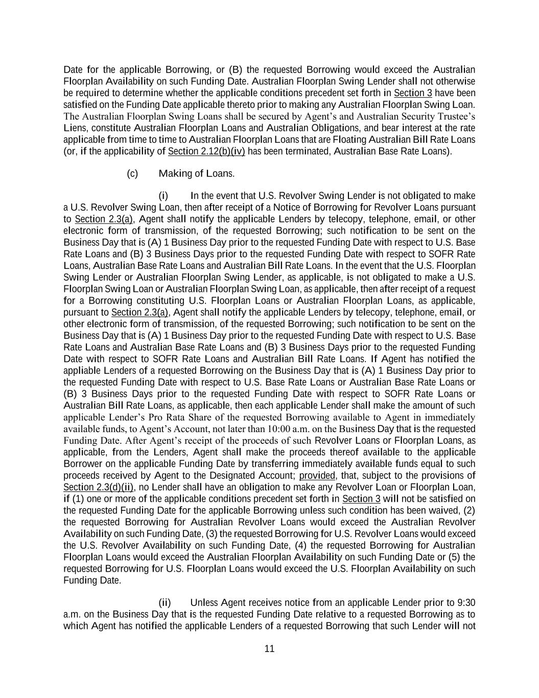 11 Date for the applicable Borrowing, or (B) the requested Borrowing would exceed the Australian Floorplan Availability on such Funding Date. Australian Floorplan Swing Lender shall not otherwise be required to determine whether the applicable conditions precedent set forth in Section 3 have been satisfied on the Funding Date applicable thereto prior to making any Australian Floorplan Swing Loan. The Australian Floorplan Swing Loans shall be secured by Agent’s and Australian Security Trustee’s Liens, constitute Australian Floorplan Loans and Australian Obligations, and bear interest at the rate applicable from time to time to Australian Floorplan Loans that are Floating Australian Bill Rate Loans (or, if the applicability of Section 2.12(b)(iv) has been terminated, Australian Base Rate Loans). (c) Making of Loans. (i) In the event that U.S. Revolver Swing Lender is not obligated to make a U.S. Revolver Swing Loan, then after receipt of a Notice of Borrowing for Revolver Loans pursuant to Section 2.3(a), Agent shall notify the applicable Lenders by telecopy, telephone, email, or other electronic form of transmission, of the requested Borrowing; such notification to be sent on the Business Day that is (A) 1 Business Day prior to the requested Funding Date with respect to U.S. Base Rate Loans and (B) 3 Business Days prior to the requested Funding Date with respect to SOFR Rate Loans, Australian Base Rate Loans and Australian Bill Rate Loans. In the event that the U.S. Floorplan Swing Lender or Australian Floorplan Swing Lender, as applicable, is not obligated to make a U.S. Floorplan Swing Loan or Australian Floorplan Swing Loan, as applicable, then after receipt of a request for a Borrowing constituting U.S. Floorplan Loans or Australian Floorplan Loans, as applicable, pursuant to Section 2.3(a), Agent shall notify the applicable Lenders by telecopy, telephone, email, or other electronic form of transmission, of the requested Borrowing; such notification to be sent on the Business Day that is (A) 1 Business Day prior to the requested Funding Date with respect to U.S. Base Rate Loans and Australian Base Rate Loans and (B) 3 Business Days prior to the requested Funding Date with respect to SOFR Rate Loans and Australian Bill Rate Loans. If Agent has notified the appliable Lenders of a requested Borrowing on the Business Day that is (A) 1 Business Day prior to the requested Funding Date with respect to U.S. Base Rate Loans or Australian Base Rate Loans or (B) 3 Business Days prior to the requested Funding Date with respect to SOFR Rate Loans or Australian Bill Rate Loans, as applicable, then each applicable Lender shall make the amount of such applicable Lender’s Pro Rata Share of the requested Borrowing available to Agent in immediately available funds, to Agent’s Account, not later than 10:00 a.m. on the Business Day that is the requested Funding Date. After Agent’s receipt of the proceeds of such Revolver Loans or Floorplan Loans, as applicable, from the Lenders, Agent shall make the proceeds thereof available to the applicable Borrower on the applicable Funding Date by transferring immediately available funds equal to such proceeds received by Agent to the Designated Account; provided, that, subject to the provisions of Section 2.3(d)(ii), no Lender shall have an obligation to make any Revolver Loan or Floorplan Loan, if (1) one or more of the applicable conditions precedent set forth in Section 3 will not be satisfied on the requested Funding Date for the applicable Borrowing unless such condition has been waived, (2) the requested Borrowing for Australian Revolver Loans would exceed the Australian Revolver Availability on such Funding Date, (3) the requested Borrowing for U.S. Revolver Loans would exceed the U.S. Revolver Availability on such Funding Date, (4) the requested Borrowing for Australian Floorplan Loans would exceed the Australian Floorplan Availability on such Funding Date or (5) the requested Borrowing for U.S. Floorplan Loans would exceed the U.S. Floorplan Availability on such Funding Date. (ii) Unless Agent receives notice from an applicable Lender prior to 9:30 a.m. on the Business Day that is the requested Funding Date relative to a requested Borrowing as to which Agent has notified the applicable Lenders of a requested Borrowing that such Lender will not