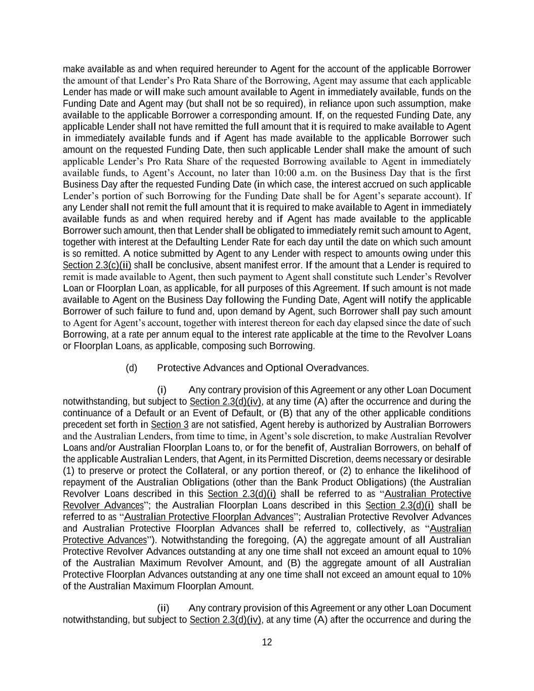 12 make available as and when required hereunder to Agent for the account of the applicable Borrower the amount of that Lender’s Pro Rata Share of the Borrowing, Agent may assume that each applicable Lender has made or will make such amount available to Agent in immediately available, funds on the Funding Date and Agent may (but shall not be so required), in reliance upon such assumption, make available to the applicable Borrower a corresponding amount. If, on the requested Funding Date, any applicable Lender shall not have remitted the full amount that it is required to make available to Agent in immediately available funds and if Agent has made available to the applicable Borrower such amount on the requested Funding Date, then such applicable Lender shall make the amount of such applicable Lender’s Pro Rata Share of the requested Borrowing available to Agent in immediately available funds, to Agent’s Account, no later than 10:00 a.m. on the Business Day that is the first Business Day after the requested Funding Date (in which case, the interest accrued on such applicable Lender’s portion of such Borrowing for the Funding Date shall be for Agent’s separate account). If any Lender shall not remit the full amount that it is required to make available to Agent in immediately available funds as and when required hereby and if Agent has made available to the applicable Borrower such amount, then that Lender shall be obligated to immediately remit such amount to Agent, together with interest at the Defaulting Lender Rate for each day until the date on which such amount is so remitted. A notice submitted by Agent to any Lender with respect to amounts owing under this Section 2.3(c)(ii) shall be conclusive, absent manifest error. If the amount that a Lender is required to remit is made available to Agent, then such payment to Agent shall constitute such Lender’s Revolver Loan or Floorplan Loan, as applicable, for all purposes of this Agreement. If such amount is not made available to Agent on the Business Day following the Funding Date, Agent will notify the applicable Borrower of such failure to fund and, upon demand by Agent, such Borrower shall pay such amount to Agent for Agent’s account, together with interest thereon for each day elapsed since the date of such Borrowing, at a rate per annum equal to the interest rate applicable at the time to the Revolver Loans or Floorplan Loans, as applicable, composing such Borrowing. (d) Protective Advances and Optional Overadvances. (i) Any contrary provision of this Agreement or any other Loan Document notwithstanding, but subject to Section 2.3(d)(iv), at any time (A) after the occurrence and during the continuance of a Default or an Event of Default, or (B) that any of the other applicable conditions precedent set forth in Section 3 are not satisfied, Agent hereby is authorized by Australian Borrowers and the Australian Lenders, from time to time, in Agent’s sole discretion, to make Australian Revolver Loans and/or Australian Floorplan Loans to, or for the benefit of, Australian Borrowers, on behalf of the applicable Australian Lenders, that Agent, in its Permitted Discretion, deems necessary or desirable (1) to preserve or protect the Collateral, or any portion thereof, or (2) to enhance the likelihood of repayment of the Australian Obligations (other than the Bank Product Obligations) (the Australian Revolver Loans described in this Section 2.3(d)(i) shall be referred to as “Australian Protective Revolver Advances”; the Australian Floorplan Loans described in this Section 2.3(d)(i) shall be referred to as “Australian Protective Floorplan Advances”; Australian Protective Revolver Advances and Australian Protective Floorplan Advances shall be referred to, collectively, as “Australian Protective Advances”). Notwithstanding the foregoing, (A) the aggregate amount of all Australian Protective Revolver Advances outstanding at any one time shall not exceed an amount equal to 10% of the Australian Maximum Revolver Amount, and (B) the aggregate amount of all Australian Protective Floorplan Advances outstanding at any one time shall not exceed an amount equal to 10% of the Australian Maximum Floorplan Amount. (ii) Any contrary provision of this Agreement or any other Loan Document notwithstanding, but subject to Section 2.3(d)(iv), at any time (A) after the occurrence and during the