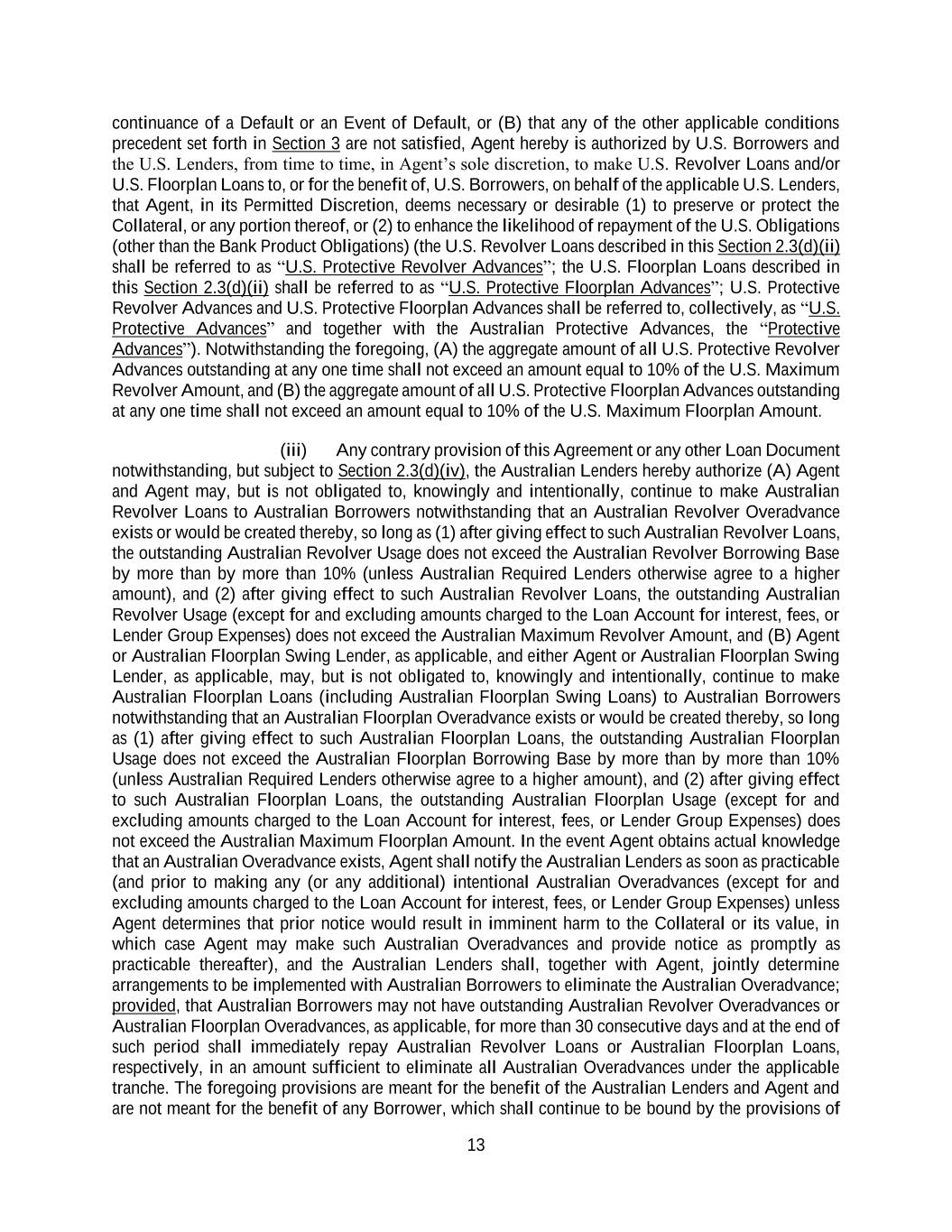 13 continuance of a Default or an Event of Default, or (B) that any of the other applicable conditions precedent set forth in Section 3 are not satisfied, Agent hereby is authorized by U.S. Borrowers and the U.S. Lenders, from time to time, in Agent’s sole discretion, to make U.S. Revolver Loans and/or U.S. Floorplan Loans to, or for the benefit of, U.S. Borrowers, on behalf of the applicable U.S. Lenders, that Agent, in its Permitted Discretion, deems necessary or desirable (1) to preserve or protect the Collateral, or any portion thereof, or (2) to enhance the likelihood of repayment of the U.S. Obligations (other than the Bank Product Obligations) (the U.S. Revolver Loans described in this Section 2.3(d)(ii) shall be referred to as “U.S. Protective Revolver Advances”; the U.S. Floorplan Loans described in this Section 2.3(d)(ii) shall be referred to as “U.S. Protective Floorplan Advances”; U.S. Protective Revolver Advances and U.S. Protective Floorplan Advances shall be referred to, collectively, as “U.S. Protective Advances” and together with the Australian Protective Advances, the “Protective Advances”). Notwithstanding the foregoing, (A) the aggregate amount of all U.S. Protective Revolver Advances outstanding at any one time shall not exceed an amount equal to 10% of the U.S. Maximum Revolver Amount, and (B) the aggregate amount of all U.S. Protective Floorplan Advances outstanding at any one time shall not exceed an amount equal to 10% of the U.S. Maximum Floorplan Amount. (iii) Any contrary provision of this Agreement or any other Loan Document notwithstanding, but subject to Section 2.3(d)(iv), the Australian Lenders hereby authorize (A) Agent and Agent may, but is not obligated to, knowingly and intentionally, continue to make Australian Revolver Loans to Australian Borrowers notwithstanding that an Australian Revolver Overadvance exists or would be created thereby, so long as (1) after giving effect to such Australian Revolver Loans, the outstanding Australian Revolver Usage does not exceed the Australian Revolver Borrowing Base by more than by more than 10% (unless Australian Required Lenders otherwise agree to a higher amount), and (2) after giving effect to such Australian Revolver Loans, the outstanding Australian Revolver Usage (except for and excluding amounts charged to the Loan Account for interest, fees, or Lender Group Expenses) does not exceed the Australian Maximum Revolver Amount, and (B) Agent or Australian Floorplan Swing Lender, as applicable, and either Agent or Australian Floorplan Swing Lender, as applicable, may, but is not obligated to, knowingly and intentionally, continue to make Australian Floorplan Loans (including Australian Floorplan Swing Loans) to Australian Borrowers notwithstanding that an Australian Floorplan Overadvance exists or would be created thereby, so long as (1) after giving effect to such Australian Floorplan Loans, the outstanding Australian Floorplan Usage does not exceed the Australian Floorplan Borrowing Base by more than by more than 10% (unless Australian Required Lenders otherwise agree to a higher amount), and (2) after giving effect to such Australian Floorplan Loans, the outstanding Australian Floorplan Usage (except for and excluding amounts charged to the Loan Account for interest, fees, or Lender Group Expenses) does not exceed the Australian Maximum Floorplan Amount. In the event Agent obtains actual knowledge that an Australian Overadvance exists, Agent shall notify the Australian Lenders as soon as practicable (and prior to making any (or any additional) intentional Australian Overadvances (except for and excluding amounts charged to the Loan Account for interest, fees, or Lender Group Expenses) unless Agent determines that prior notice would result in imminent harm to the Collateral or its value, in which case Agent may make such Australian Overadvances and provide notice as promptly as practicable thereafter), and the Australian Lenders shall, together with Agent, jointly determine arrangements to be implemented with Australian Borrowers to eliminate the Australian Overadvance; provided, that Australian Borrowers may not have outstanding Australian Revolver Overadvances or Australian Floorplan Overadvances, as applicable, for more than 30 consecutive days and at the end of such period shall immediately repay Australian Revolver Loans or Australian Floorplan Loans, respectively, in an amount sufficient to eliminate all Australian Overadvances under the applicable tranche. The foregoing provisions are meant for the benefit of the Australian Lenders and Agent and are not meant for the benefit of any Borrower, which shall continue to be bound by the provisions of