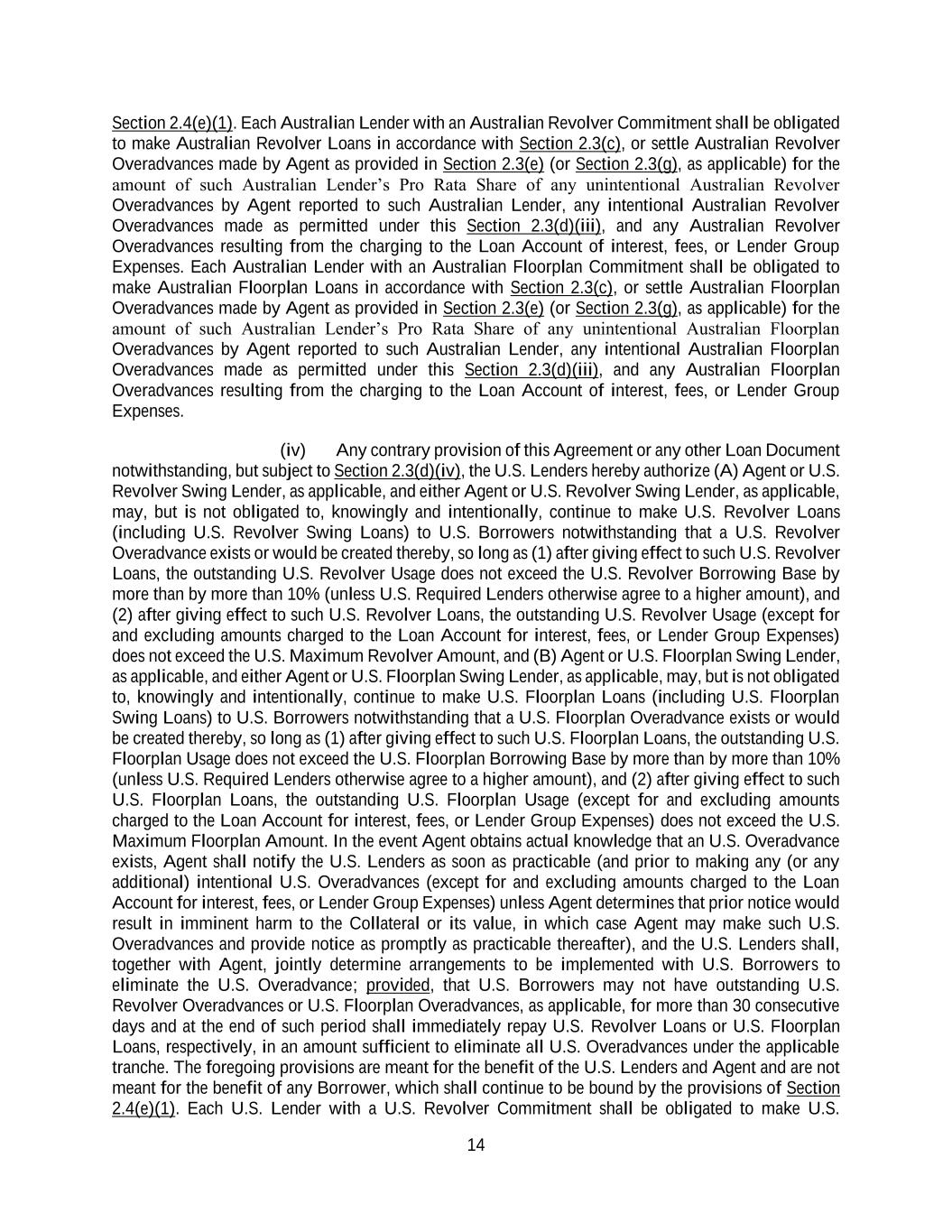 14 Section 2.4(e)(1). Each Australian Lender with an Australian Revolver Commitment shall be obligated to make Australian Revolver Loans in accordance with Section 2.3(c), or settle Australian Revolver Overadvances made by Agent as provided in Section 2.3(e) (or Section 2.3(g), as applicable) for the amount of such Australian Lender’s Pro Rata Share of any unintentional Australian Revolver Overadvances by Agent reported to such Australian Lender, any intentional Australian Revolver Overadvances made as permitted under this Section 2.3(d)(iii), and any Australian Revolver Overadvances resulting from the charging to the Loan Account of interest, fees, or Lender Group Expenses. Each Australian Lender with an Australian Floorplan Commitment shall be obligated to make Australian Floorplan Loans in accordance with Section 2.3(c), or settle Australian Floorplan Overadvances made by Agent as provided in Section 2.3(e) (or Section 2.3(g), as applicable) for the amount of such Australian Lender’s Pro Rata Share of any unintentional Australian Floorplan Overadvances by Agent reported to such Australian Lender, any intentional Australian Floorplan Overadvances made as permitted under this Section 2.3(d)(iii), and any Australian Floorplan Overadvances resulting from the charging to the Loan Account of interest, fees, or Lender Group Expenses. (iv) Any contrary provision of this Agreement or any other Loan Document notwithstanding, but subject to Section 2.3(d)(iv), the U.S. Lenders hereby authorize (A) Agent or U.S. Revolver Swing Lender, as applicable, and either Agent or U.S. Revolver Swing Lender, as applicable, may, but is not obligated to, knowingly and intentionally, continue to make U.S. Revolver Loans (including U.S. Revolver Swing Loans) to U.S. Borrowers notwithstanding that a U.S. Revolver Overadvance exists or would be created thereby, so long as (1) after giving effect to such U.S. Revolver Loans, the outstanding U.S. Revolver Usage does not exceed the U.S. Revolver Borrowing Base by more than by more than 10% (unless U.S. Required Lenders otherwise agree to a higher amount), and (2) after giving effect to such U.S. Revolver Loans, the outstanding U.S. Revolver Usage (except for and excluding amounts charged to the Loan Account for interest, fees, or Lender Group Expenses) does not exceed the U.S. Maximum Revolver Amount, and (B) Agent or U.S. Floorplan Swing Lender, as applicable, and either Agent or U.S. Floorplan Swing Lender, as applicable, may, but is not obligated to, knowingly and intentionally, continue to make U.S. Floorplan Loans (including U.S. Floorplan Swing Loans) to U.S. Borrowers notwithstanding that a U.S. Floorplan Overadvance exists or would be created thereby, so long as (1) after giving effect to such U.S. Floorplan Loans, the outstanding U.S. Floorplan Usage does not exceed the U.S. Floorplan Borrowing Base by more than by more than 10% (unless U.S. Required Lenders otherwise agree to a higher amount), and (2) after giving effect to such U.S. Floorplan Loans, the outstanding U.S. Floorplan Usage (except for and excluding amounts charged to the Loan Account for interest, fees, or Lender Group Expenses) does not exceed the U.S. Maximum Floorplan Amount. In the event Agent obtains actual knowledge that an U.S. Overadvance exists, Agent shall notify the U.S. Lenders as soon as practicable (and prior to making any (or any additional) intentional U.S. Overadvances (except for and excluding amounts charged to the Loan Account for interest, fees, or Lender Group Expenses) unless Agent determines that prior notice would result in imminent harm to the Collateral or its value, in which case Agent may make such U.S. Overadvances and provide notice as promptly as practicable thereafter), and the U.S. Lenders shall, together with Agent, jointly determine arrangements to be implemented with U.S. Borrowers to eliminate the U.S. Overadvance; provided, that U.S. Borrowers may not have outstanding U.S. Revolver Overadvances or U.S. Floorplan Overadvances, as applicable, for more than 30 consecutive days and at the end of such period shall immediately repay U.S. Revolver Loans or U.S. Floorplan Loans, respectively, in an amount sufficient to eliminate all U.S. Overadvances under the applicable tranche. The foregoing provisions are meant for the benefit of the U.S. Lenders and Agent and are not meant for the benefit of any Borrower, which shall continue to be bound by the provisions of Section 2.4(e)(1). Each U.S. Lender with a U.S. Revolver Commitment shall be obligated to make U.S.