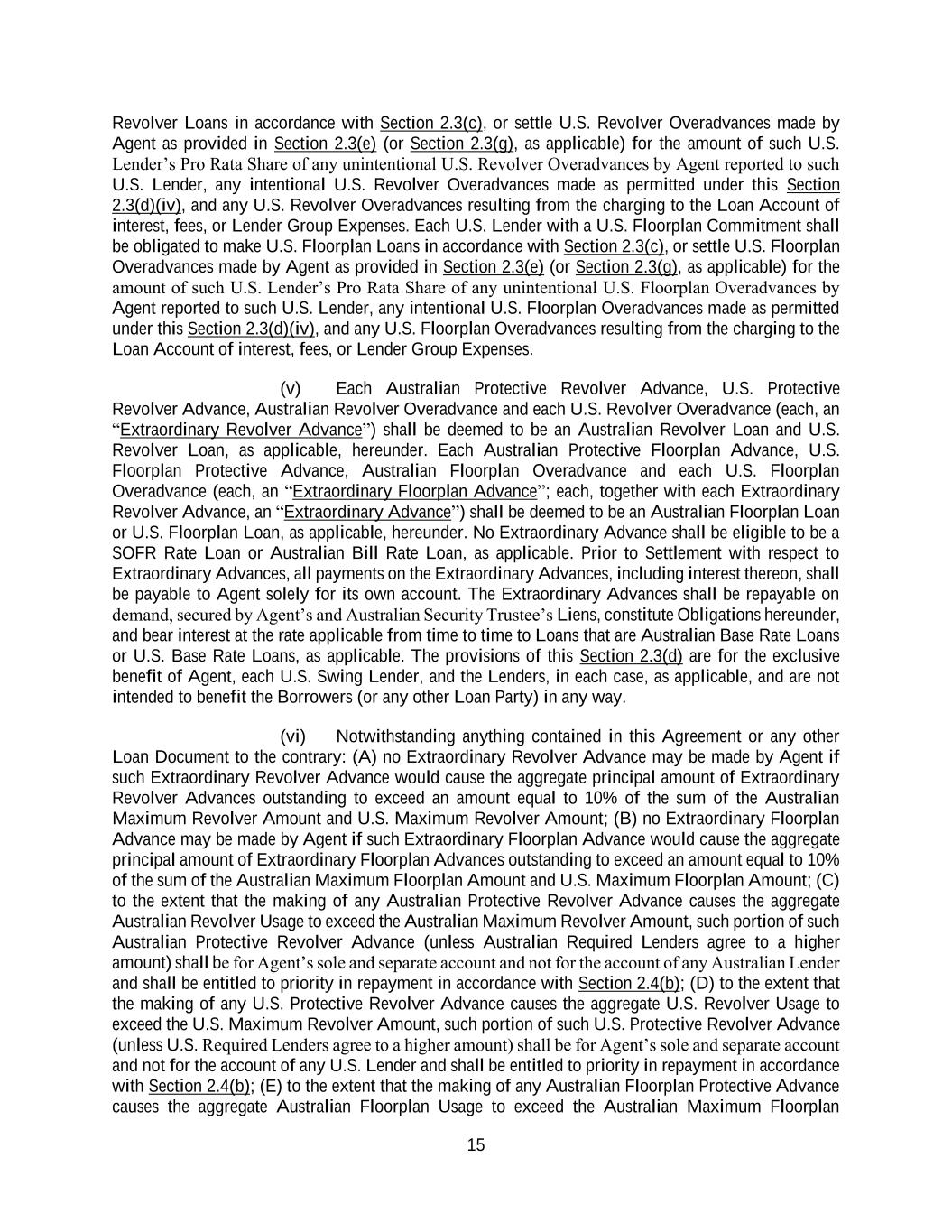 15 Revolver Loans in accordance with Section 2.3(c), or settle U.S. Revolver Overadvances made by Agent as provided in Section 2.3(e) (or Section 2.3(g), as applicable) for the amount of such U.S. Lender’s Pro Rata Share of any unintentional U.S. Revolver Overadvances by Agent reported to such U.S. Lender, any intentional U.S. Revolver Overadvances made as permitted under this Section 2.3(d)(iv), and any U.S. Revolver Overadvances resulting from the charging to the Loan Account of interest, fees, or Lender Group Expenses. Each U.S. Lender with a U.S. Floorplan Commitment shall be obligated to make U.S. Floorplan Loans in accordance with Section 2.3(c), or settle U.S. Floorplan Overadvances made by Agent as provided in Section 2.3(e) (or Section 2.3(g), as applicable) for the amount of such U.S. Lender’s Pro Rata Share of any unintentional U.S. Floorplan Overadvances by Agent reported to such U.S. Lender, any intentional U.S. Floorplan Overadvances made as permitted under this Section 2.3(d)(iv), and any U.S. Floorplan Overadvances resulting from the charging to the Loan Account of interest, fees, or Lender Group Expenses. (v) Each Australian Protective Revolver Advance, U.S. Protective Revolver Advance, Australian Revolver Overadvance and each U.S. Revolver Overadvance (each, an “Extraordinary Revolver Advance”) shall be deemed to be an Australian Revolver Loan and U.S. Revolver Loan, as applicable, hereunder. Each Australian Protective Floorplan Advance, U.S. Floorplan Protective Advance, Australian Floorplan Overadvance and each U.S. Floorplan Overadvance (each, an “Extraordinary Floorplan Advance”; each, together with each Extraordinary Revolver Advance, an “Extraordinary Advance”) shall be deemed to be an Australian Floorplan Loan or U.S. Floorplan Loan, as applicable, hereunder. No Extraordinary Advance shall be eligible to be a SOFR Rate Loan or Australian Bill Rate Loan, as applicable. Prior to Settlement with respect to Extraordinary Advances, all payments on the Extraordinary Advances, including interest thereon, shall be payable to Agent solely for its own account. The Extraordinary Advances shall be repayable on demand, secured by Agent’s and Australian Security Trustee’s Liens, constitute Obligations hereunder, and bear interest at the rate applicable from time to time to Loans that are Australian Base Rate Loans or U.S. Base Rate Loans, as applicable. The provisions of this Section 2.3(d) are for the exclusive benefit of Agent, each U.S. Swing Lender, and the Lenders, in each case, as applicable, and are not intended to benefit the Borrowers (or any other Loan Party) in any way. (vi) Notwithstanding anything contained in this Agreement or any other Loan Document to the contrary: (A) no Extraordinary Revolver Advance may be made by Agent if such Extraordinary Revolver Advance would cause the aggregate principal amount of Extraordinary Revolver Advances outstanding to exceed an amount equal to 10% of the sum of the Australian Maximum Revolver Amount and U.S. Maximum Revolver Amount; (B) no Extraordinary Floorplan Advance may be made by Agent if such Extraordinary Floorplan Advance would cause the aggregate principal amount of Extraordinary Floorplan Advances outstanding to exceed an amount equal to 10% of the sum of the Australian Maximum Floorplan Amount and U.S. Maximum Floorplan Amount; (C) to the extent that the making of any Australian Protective Revolver Advance causes the aggregate Australian Revolver Usage to exceed the Australian Maximum Revolver Amount, such portion of such Australian Protective Revolver Advance (unless Australian Required Lenders agree to a higher amount) shall be for Agent’s sole and separate account and not for the account of any Australian Lender and shall be entitled to priority in repayment in accordance with Section 2.4(b); (D) to the extent that the making of any U.S. Protective Revolver Advance causes the aggregate U.S. Revolver Usage to exceed the U.S. Maximum Revolver Amount, such portion of such U.S. Protective Revolver Advance (unless U.S. Required Lenders agree to a higher amount) shall be for Agent’s sole and separate account and not for the account of any U.S. Lender and shall be entitled to priority in repayment in accordance with Section 2.4(b); (E) to the extent that the making of any Australian Floorplan Protective Advance causes the aggregate Australian Floorplan Usage to exceed the Australian Maximum Floorplan