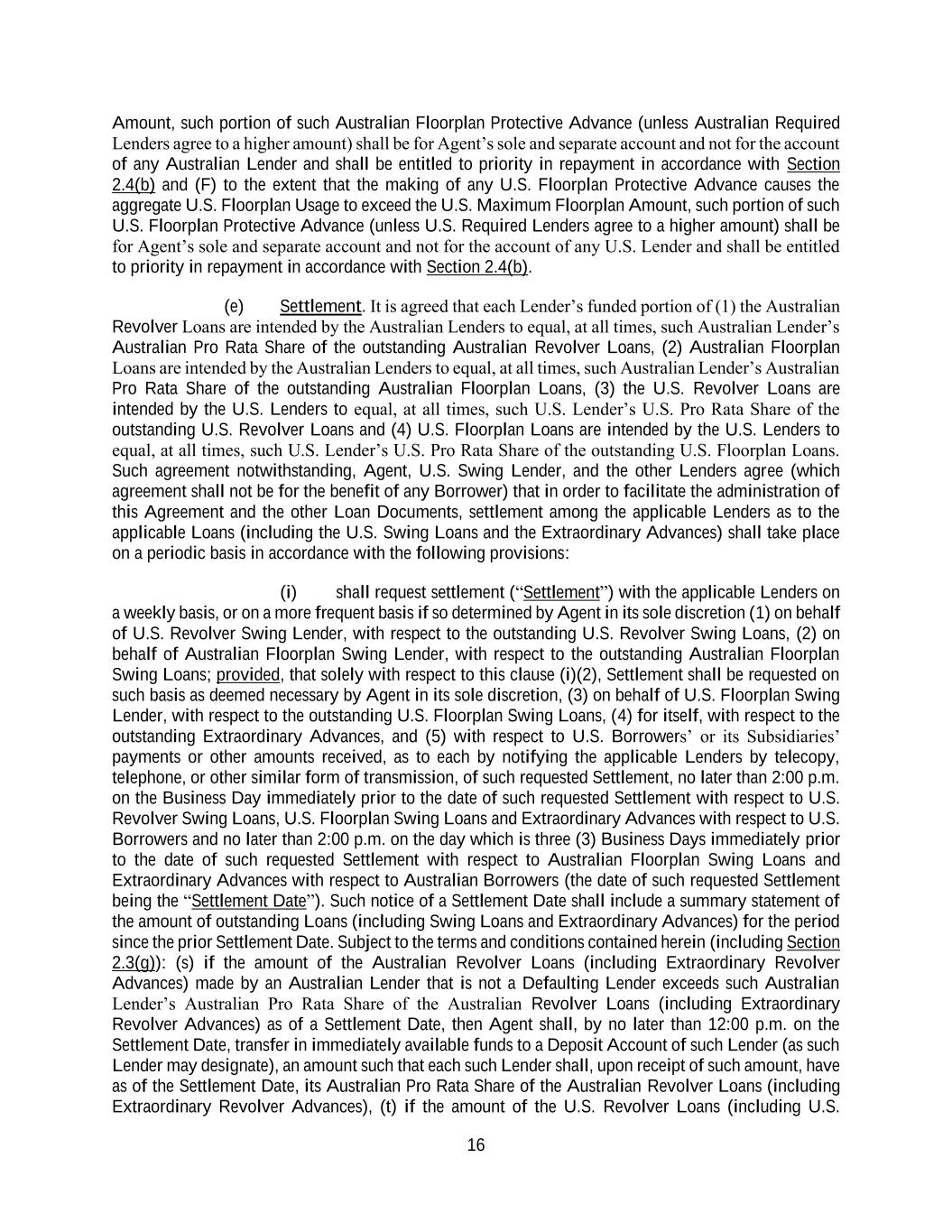 16 Amount, such portion of such Australian Floorplan Protective Advance (unless Australian Required Lenders agree to a higher amount) shall be for Agent’s sole and separate account and not for the account of any Australian Lender and shall be entitled to priority in repayment in accordance with Section 2.4(b) and (F) to the extent that the making of any U.S. Floorplan Protective Advance causes the aggregate U.S. Floorplan Usage to exceed the U.S. Maximum Floorplan Amount, such portion of such U.S. Floorplan Protective Advance (unless U.S. Required Lenders agree to a higher amount) shall be for Agent’s sole and separate account and not for the account of any U.S. Lender and shall be entitled to priority in repayment in accordance with Section 2.4(b). (e) Settlement. It is agreed that each Lender’s funded portion of (1) the Australian Revolver Loans are intended by the Australian Lenders to equal, at all times, such Australian Lender’s Australian Pro Rata Share of the outstanding Australian Revolver Loans, (2) Australian Floorplan Loans are intended by the Australian Lenders to equal, at all times, such Australian Lender’s Australian Pro Rata Share of the outstanding Australian Floorplan Loans, (3) the U.S. Revolver Loans are intended by the U.S. Lenders to equal, at all times, such U.S. Lender’s U.S. Pro Rata Share of the outstanding U.S. Revolver Loans and (4) U.S. Floorplan Loans are intended by the U.S. Lenders to equal, at all times, such U.S. Lender’s U.S. Pro Rata Share of the outstanding U.S. Floorplan Loans. Such agreement notwithstanding, Agent, U.S. Swing Lender, and the other Lenders agree (which agreement shall not be for the benefit of any Borrower) that in order to facilitate the administration of this Agreement and the other Loan Documents, settlement among the applicable Lenders as to the applicable Loans (including the U.S. Swing Loans and the Extraordinary Advances) shall take place on a periodic basis in accordance with the following provisions: (i) shall request settlement (“Settlement”) with the applicable Lenders on a weekly basis, or on a more frequent basis if so determined by Agent in its sole discretion (1) on behalf of U.S. Revolver Swing Lender, with respect to the outstanding U.S. Revolver Swing Loans, (2) on behalf of Australian Floorplan Swing Lender, with respect to the outstanding Australian Floorplan Swing Loans; provided, that solely with respect to this clause (i)(2), Settlement shall be requested on such basis as deemed necessary by Agent in its sole discretion, (3) on behalf of U.S. Floorplan Swing Lender, with respect to the outstanding U.S. Floorplan Swing Loans, (4) for itself, with respect to the outstanding Extraordinary Advances, and (5) with respect to U.S. Borrowers’ or its Subsidiaries’ payments or other amounts received, as to each by notifying the applicable Lenders by telecopy, telephone, or other similar form of transmission, of such requested Settlement, no later than 2:00 p.m. on the Business Day immediately prior to the date of such requested Settlement with respect to U.S. Revolver Swing Loans, U.S. Floorplan Swing Loans and Extraordinary Advances with respect to U.S. Borrowers and no later than 2:00 p.m. on the day which is three (3) Business Days immediately prior to the date of such requested Settlement with respect to Australian Floorplan Swing Loans and Extraordinary Advances with respect to Australian Borrowers (the date of such requested Settlement being the “Settlement Date”). Such notice of a Settlement Date shall include a summary statement of the amount of outstanding Loans (including Swing Loans and Extraordinary Advances) for the period since the prior Settlement Date. Subject to the terms and conditions contained herein (including Section 2.3(g)): (s) if the amount of the Australian Revolver Loans (including Extraordinary Revolver Advances) made by an Australian Lender that is not a Defaulting Lender exceeds such Australian Lender’s Australian Pro Rata Share of the Australian Revolver Loans (including Extraordinary Revolver Advances) as of a Settlement Date, then Agent shall, by no later than 12:00 p.m. on the Settlement Date, transfer in immediately available funds to a Deposit Account of such Lender (as such Lender may designate), an amount such that each such Lender shall, upon receipt of such amount, have as of the Settlement Date, its Australian Pro Rata Share of the Australian Revolver Loans (including Extraordinary Revolver Advances), (t) if the amount of the U.S. Revolver Loans (including U.S.