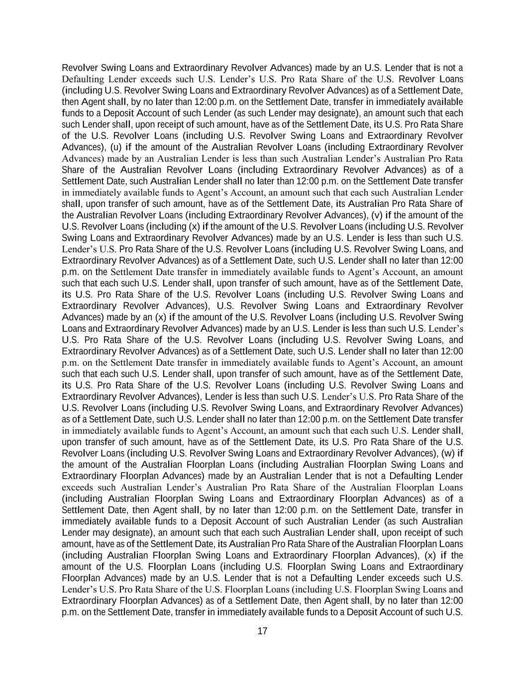 17 Revolver Swing Loans and Extraordinary Revolver Advances) made by an U.S. Lender that is not a Defaulting Lender exceeds such U.S. Lender’s U.S. Pro Rata Share of the U.S. Revolver Loans (including U.S. Revolver Swing Loans and Extraordinary Revolver Advances) as of a Settlement Date, then Agent shall, by no later than 12:00 p.m. on the Settlement Date, transfer in immediately available funds to a Deposit Account of such Lender (as such Lender may designate), an amount such that each such Lender shall, upon receipt of such amount, have as of the Settlement Date, its U.S. Pro Rata Share of the U.S. Revolver Loans (including U.S. Revolver Swing Loans and Extraordinary Revolver Advances), (u) if the amount of the Australian Revolver Loans (including Extraordinary Revolver Advances) made by an Australian Lender is less than such Australian Lender’s Australian Pro Rata Share of the Australian Revolver Loans (including Extraordinary Revolver Advances) as of a Settlement Date, such Australian Lender shall no later than 12:00 p.m. on the Settlement Date transfer in immediately available funds to Agent’s Account, an amount such that each such Australian Lender shall, upon transfer of such amount, have as of the Settlement Date, its Australian Pro Rata Share of the Australian Revolver Loans (including Extraordinary Revolver Advances), (v) if the amount of the U.S. Revolver Loans (including (x) if the amount of the U.S. Revolver Loans (including U.S. Revolver Swing Loans and Extraordinary Revolver Advances) made by an U.S. Lender is less than such U.S. Lender’s U.S. Pro Rata Share of the U.S. Revolver Loans (including U.S. Revolver Swing Loans, and Extraordinary Revolver Advances) as of a Settlement Date, such U.S. Lender shall no later than 12:00 p.m. on the Settlement Date transfer in immediately available funds to Agent’s Account, an amount such that each such U.S. Lender shall, upon transfer of such amount, have as of the Settlement Date, its U.S. Pro Rata Share of the U.S. Revolver Loans (including U.S. Revolver Swing Loans and Extraordinary Revolver Advances), U.S. Revolver Swing Loans and Extraordinary Revolver Advances) made by an (x) if the amount of the U.S. Revolver Loans (including U.S. Revolver Swing Loans and Extraordinary Revolver Advances) made by an U.S. Lender is less than such U.S. Lender’s U.S. Pro Rata Share of the U.S. Revolver Loans (including U.S. Revolver Swing Loans, and Extraordinary Revolver Advances) as of a Settlement Date, such U.S. Lender shall no later than 12:00 p.m. on the Settlement Date transfer in immediately available funds to Agent’s Account, an amount such that each such U.S. Lender shall, upon transfer of such amount, have as of the Settlement Date, its U.S. Pro Rata Share of the U.S. Revolver Loans (including U.S. Revolver Swing Loans and Extraordinary Revolver Advances), Lender is less than such U.S. Lender’s U.S. Pro Rata Share of the U.S. Revolver Loans (including U.S. Revolver Swing Loans, and Extraordinary Revolver Advances) as of a Settlement Date, such U.S. Lender shall no later than 12:00 p.m. on the Settlement Date transfer in immediately available funds to Agent’s Account, an amount such that each such U.S. Lender shall, upon transfer of such amount, have as of the Settlement Date, its U.S. Pro Rata Share of the U.S. Revolver Loans (including U.S. Revolver Swing Loans and Extraordinary Revolver Advances), (w) if the amount of the Australian Floorplan Loans (including Australian Floorplan Swing Loans and Extraordinary Floorplan Advances) made by an Australian Lender that is not a Defaulting Lender exceeds such Australian Lender’s Australian Pro Rata Share of the Australian Floorplan Loans (including Australian Floorplan Swing Loans and Extraordinary Floorplan Advances) as of a Settlement Date, then Agent shall, by no later than 12:00 p.m. on the Settlement Date, transfer in immediately available funds to a Deposit Account of such Australian Lender (as such Australian Lender may designate), an amount such that each such Australian Lender shall, upon receipt of such amount, have as of the Settlement Date, its Australian Pro Rata Share of the Australian Floorplan Loans (including Australian Floorplan Swing Loans and Extraordinary Floorplan Advances), (x) if the amount of the U.S. Floorplan Loans (including U.S. Floorplan Swing Loans and Extraordinary Floorplan Advances) made by an U.S. Lender that is not a Defaulting Lender exceeds such U.S. Lender’s U.S. Pro Rata Share of the U.S. Floorplan Loans (including U.S. Floorplan Swing Loans and Extraordinary Floorplan Advances) as of a Settlement Date, then Agent shall, by no later than 12:00 p.m. on the Settlement Date, transfer in immediately available funds to a Deposit Account of such U.S.