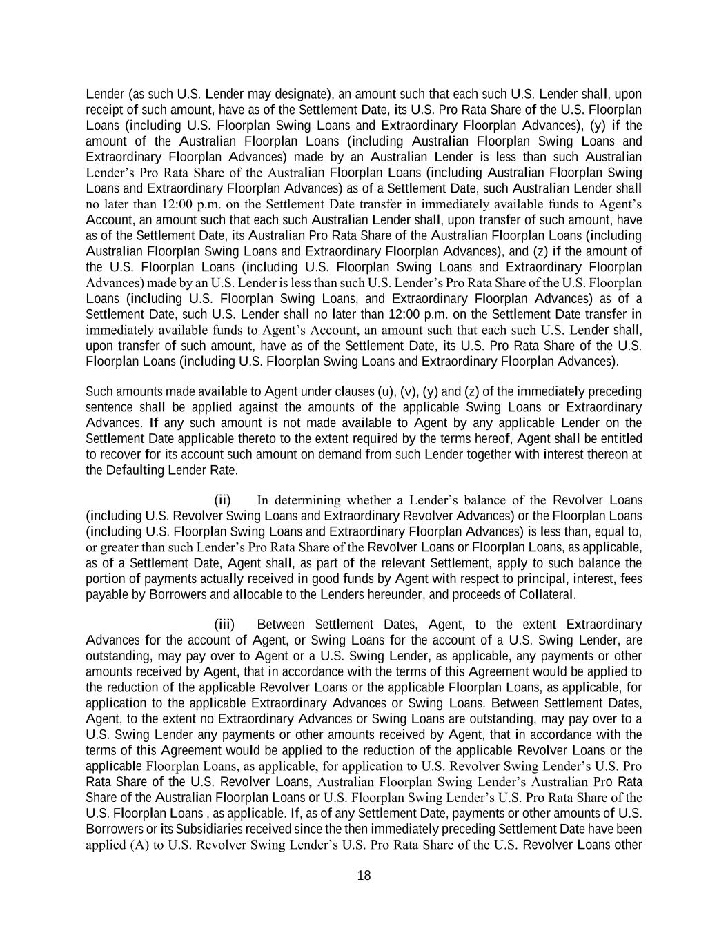18 Lender (as such U.S. Lender may designate), an amount such that each such U.S. Lender shall, upon receipt of such amount, have as of the Settlement Date, its U.S. Pro Rata Share of the U.S. Floorplan Loans (including U.S. Floorplan Swing Loans and Extraordinary Floorplan Advances), (y) if the amount of the Australian Floorplan Loans (including Australian Floorplan Swing Loans and Extraordinary Floorplan Advances) made by an Australian Lender is less than such Australian Lender’s Pro Rata Share of the Australian Floorplan Loans (including Australian Floorplan Swing Loans and Extraordinary Floorplan Advances) as of a Settlement Date, such Australian Lender shall no later than 12:00 p.m. on the Settlement Date transfer in immediately available funds to Agent’s Account, an amount such that each such Australian Lender shall, upon transfer of such amount, have as of the Settlement Date, its Australian Pro Rata Share of the Australian Floorplan Loans (including Australian Floorplan Swing Loans and Extraordinary Floorplan Advances), and (z) if the amount of the U.S. Floorplan Loans (including U.S. Floorplan Swing Loans and Extraordinary Floorplan Advances) made by an U.S. Lender is less than such U.S. Lender’s Pro Rata Share of the U.S. Floorplan Loans (including U.S. Floorplan Swing Loans, and Extraordinary Floorplan Advances) as of a Settlement Date, such U.S. Lender shall no later than 12:00 p.m. on the Settlement Date transfer in immediately available funds to Agent’s Account, an amount such that each such U.S. Lender shall, upon transfer of such amount, have as of the Settlement Date, its U.S. Pro Rata Share of the U.S. Floorplan Loans (including U.S. Floorplan Swing Loans and Extraordinary Floorplan Advances). Such amounts made available to Agent under clauses (u), (v), (y) and (z) of the immediately preceding sentence shall be applied against the amounts of the applicable Swing Loans or Extraordinary Advances. If any such amount is not made available to Agent by any applicable Lender on the Settlement Date applicable thereto to the extent required by the terms hereof, Agent shall be entitled to recover for its account such amount on demand from such Lender together with interest thereon at the Defaulting Lender Rate. (ii) In determining whether a Lender’s balance of the Revolver Loans (including U.S. Revolver Swing Loans and Extraordinary Revolver Advances) or the Floorplan Loans (including U.S. Floorplan Swing Loans and Extraordinary Floorplan Advances) is less than, equal to, or greater than such Lender’s Pro Rata Share of the Revolver Loans or Floorplan Loans, as applicable, as of a Settlement Date, Agent shall, as part of the relevant Settlement, apply to such balance the portion of payments actually received in good funds by Agent with respect to principal, interest, fees payable by Borrowers and allocable to the Lenders hereunder, and proceeds of Collateral. (iii) Between Settlement Dates, Agent, to the extent Extraordinary Advances for the account of Agent, or Swing Loans for the account of a U.S. Swing Lender, are outstanding, may pay over to Agent or a U.S. Swing Lender, as applicable, any payments or other amounts received by Agent, that in accordance with the terms of this Agreement would be applied to the reduction of the applicable Revolver Loans or the applicable Floorplan Loans, as applicable, for application to the applicable Extraordinary Advances or Swing Loans. Between Settlement Dates, Agent, to the extent no Extraordinary Advances or Swing Loans are outstanding, may pay over to a U.S. Swing Lender any payments or other amounts received by Agent, that in accordance with the terms of this Agreement would be applied to the reduction of the applicable Revolver Loans or the applicable Floorplan Loans, as applicable, for application to U.S. Revolver Swing Lender’s U.S. Pro Rata Share of the U.S. Revolver Loans, Australian Floorplan Swing Lender’s Australian Pro Rata Share of the Australian Floorplan Loans or U.S. Floorplan Swing Lender’s U.S. Pro Rata Share of the U.S. Floorplan Loans , as applicable. If, as of any Settlement Date, payments or other amounts of U.S. Borrowers or its Subsidiaries received since the then immediately preceding Settlement Date have been applied (A) to U.S. Revolver Swing Lender’s U.S. Pro Rata Share of the U.S. Revolver Loans other