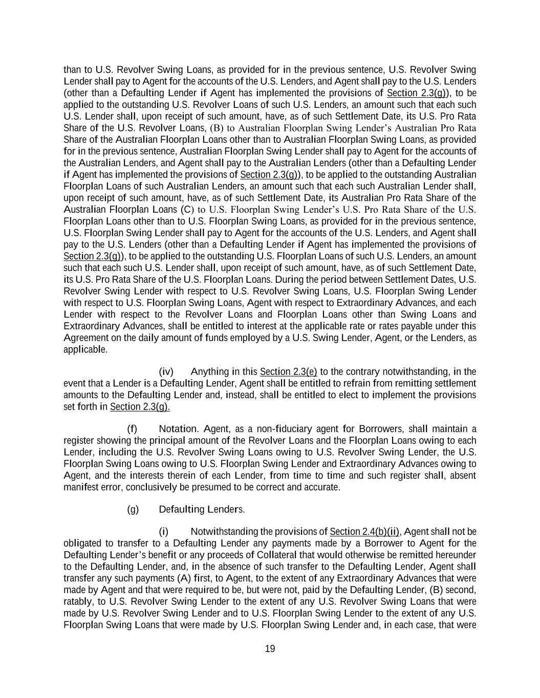 19 than to U.S. Revolver Swing Loans, as provided for in the previous sentence, U.S. Revolver Swing Lender shall pay to Agent for the accounts of the U.S. Lenders, and Agent shall pay to the U.S. Lenders (other than a Defaulting Lender if Agent has implemented the provisions of Section 2.3(g)), to be applied to the outstanding U.S. Revolver Loans of such U.S. Lenders, an amount such that each such U.S. Lender shall, upon receipt of such amount, have, as of such Settlement Date, its U.S. Pro Rata Share of the U.S. Revolver Loans, (B) to Australian Floorplan Swing Lender’s Australian Pro Rata Share of the Australian Floorplan Loans other than to Australian Floorplan Swing Loans, as provided for in the previous sentence, Australian Floorplan Swing Lender shall pay to Agent for the accounts of the Australian Lenders, and Agent shall pay to the Australian Lenders (other than a Defaulting Lender if Agent has implemented the provisions of Section 2.3(g)), to be applied to the outstanding Australian Floorplan Loans of such Australian Lenders, an amount such that each such Australian Lender shall, upon receipt of such amount, have, as of such Settlement Date, its Australian Pro Rata Share of the Australian Floorplan Loans (C) to U.S. Floorplan Swing Lender’s U.S. Pro Rata Share of the U.S. Floorplan Loans other than to U.S. Floorplan Swing Loans, as provided for in the previous sentence, U.S. Floorplan Swing Lender shall pay to Agent for the accounts of the U.S. Lenders, and Agent shall pay to the U.S. Lenders (other than a Defaulting Lender if Agent has implemented the provisions of Section 2.3(g)), to be applied to the outstanding U.S. Floorplan Loans of such U.S. Lenders, an amount such that each such U.S. Lender shall, upon receipt of such amount, have, as of such Settlement Date, its U.S. Pro Rata Share of the U.S. Floorplan Loans. During the period between Settlement Dates, U.S. Revolver Swing Lender with respect to U.S. Revolver Swing Loans, U.S. Floorplan Swing Lender with respect to U.S. Floorplan Swing Loans, Agent with respect to Extraordinary Advances, and each Lender with respect to the Revolver Loans and Floorplan Loans other than Swing Loans and Extraordinary Advances, shall be entitled to interest at the applicable rate or rates payable under this Agreement on the daily amount of funds employed by a U.S. Swing Lender, Agent, or the Lenders, as applicable. (iv) Anything in this Section 2.3(e) to the contrary notwithstanding, in the event that a Lender is a Defaulting Lender, Agent shall be entitled to refrain from remitting settlement amounts to the Defaulting Lender and, instead, shall be entitled to elect to implement the provisions set forth in Section 2.3(g). (f) Notation. Agent, as a non-fiduciary agent for Borrowers, shall maintain a register showing the principal amount of the Revolver Loans and the Floorplan Loans owing to each Lender, including the U.S. Revolver Swing Loans owing to U.S. Revolver Swing Lender, the U.S. Floorplan Swing Loans owing to U.S. Floorplan Swing Lender and Extraordinary Advances owing to Agent, and the interests therein of each Lender, from time to time and such register shall, absent manifest error, conclusively be presumed to be correct and accurate. (g) Defaulting Lenders. (i) Notwithstanding the provisions of Section 2.4(b)(ii), Agent shall not be obligated to transfer to a Defaulting Lender any payments made by a Borrower to Agent for the Defaulting Lender’s benefit or any proceeds of Collateral that would otherwise be remitted hereunder to the Defaulting Lender, and, in the absence of such transfer to the Defaulting Lender, Agent shall transfer any such payments (A) first, to Agent, to the extent of any Extraordinary Advances that were made by Agent and that were required to be, but were not, paid by the Defaulting Lender, (B) second, ratably, to U.S. Revolver Swing Lender to the extent of any U.S. Revolver Swing Loans that were made by U.S. Revolver Swing Lender and to U.S. Floorplan Swing Lender to the extent of any U.S. Floorplan Swing Loans that were made by U.S. Floorplan Swing Lender and, in each case, that were