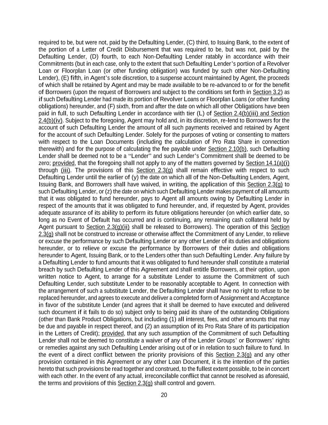 20 required to be, but were not, paid by the Defaulting Lender, (C) third, to Issuing Bank, to the extent of the portion of a Letter of Credit Disbursement that was required to be, but was not, paid by the Defaulting Lender, (D) fourth, to each Non-Defaulting Lender ratably in accordance with their Commitments (but in each case, only to the extent that such Defaulting Lender’s portion of a Revolver Loan or Floorplan Loan (or other funding obligation) was funded by such other Non-Defaulting Lender), (E) fifth, in Agent’s sole discretion, to a suspense account maintained by Agent, the proceeds of which shall be retained by Agent and may be made available to be re-advanced to or for the benefit of Borrowers (upon the request of Borrowers and subject to the conditions set forth in Section 3.2) as if such Defaulting Lender had made its portion of Revolver Loans or Floorplan Loans (or other funding obligations) hereunder, and (F) sixth, from and after the date on which all other Obligations have been paid in full, to such Defaulting Lender in accordance with tier (L) of Section 2.4(b)(iii) and Section 2.4(b)(iv). Subject to the foregoing, Agent may hold and, in its discretion, re-lend to Borrowers for the account of such Defaulting Lender the amount of all such payments received and retained by Agent for the account of such Defaulting Lender. Solely for the purposes of voting or consenting to matters with respect to the Loan Documents (including the calculation of Pro Rata Share in connection therewith) and for the purpose of calculating the fee payable under Section 2.10(b), such Defaulting Lender shall be deemed not to be a “Lender” and such Lender’s Commitment shall be deemed to be zero; provided, that the foregoing shall not apply to any of the matters governed by Section 14.1(a)(i) through (iii). The provisions of this Section 2.3(g) shall remain effective with respect to such Defaulting Lender until the earlier of (y) the date on which all of the Non-Defaulting Lenders, Agent, Issuing Bank, and Borrowers shall have waived, in writing, the application of this Section 2.3(g) to such Defaulting Lender, or (z) the date on which such Defaulting Lender makes payment of all amounts that it was obligated to fund hereunder, pays to Agent all amounts owing by Defaulting Lender in respect of the amounts that it was obligated to fund hereunder, and, if requested by Agent, provides adequate assurance of its ability to perform its future obligations hereunder (on which earlier date, so long as no Event of Default has occurred and is continuing, any remaining cash collateral held by Agent pursuant to Section 2.3(g)(ii) shall be released to Borrowers). The operation of this Section 2.3(g) shall not be construed to increase or otherwise affect the Commitment of any Lender, to relieve or excuse the performance by such Defaulting Lender or any other Lender of its duties and obligations hereunder, or to relieve or excuse the performance by Borrowers of their duties and obligations hereunder to Agent, Issuing Bank, or to the Lenders other than such Defaulting Lender. Any failure by a Defaulting Lender to fund amounts that it was obligated to fund hereunder shall constitute a material breach by such Defaulting Lender of this Agreement and shall entitle Borrowers, at their option, upon written notice to Agent, to arrange for a substitute Lender to assume the Commitment of such Defaulting Lender, such substitute Lender to be reasonably acceptable to Agent. In connection with the arrangement of such a substitute Lender, the Defaulting Lender shall have no right to refuse to be replaced hereunder, and agrees to execute and deliver a completed form of Assignment and Acceptance in favor of the substitute Lender (and agrees that it shall be deemed to have executed and delivered such document if it fails to do so) subject only to being paid its share of the outstanding Obligations (other than Bank Product Obligations, but including (1) all interest, fees, and other amounts that may be due and payable in respect thereof, and (2) an assumption of its Pro Rata Share of its participation in the Letters of Credit); provided, that any such assumption of the Commitment of such Defaulting Lender shall not be deemed to constitute a waiver of any of the Lender Groups’ or Borrowers’ rights or remedies against any such Defaulting Lender arising out of or in relation to such failure to fund. In the event of a direct conflict between the priority provisions of this Section 2.3(g) and any other provision contained in this Agreement or any other Loan Document, it is the intention of the parties hereto that such provisions be read together and construed, to the fullest extent possible, to be in concert with each other. In the event of any actual, irreconcilable conflict that cannot be resolved as aforesaid, the terms and provisions of this Section 2.3(g) shall control and govern.