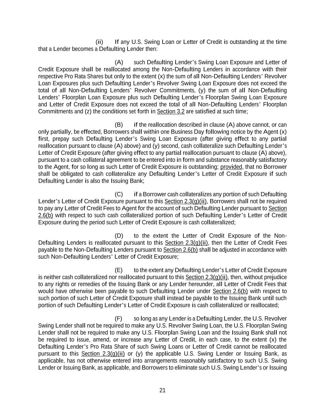 21 (ii) If any U.S. Swing Loan or Letter of Credit is outstanding at the time that a Lender becomes a Defaulting Lender then: (A) such Defaulting Lender’s Swing Loan Exposure and Letter of Credit Exposure shall be reallocated among the Non-Defaulting Lenders in accordance with their respective Pro Rata Shares but only to the extent (x) the sum of all Non-Defaulting Lenders’ Revolver Loan Exposures plus such Defaulting Lender’s Revolver Swing Loan Exposure does not exceed the total of all Non-Defaulting Lenders’ Revolver Commitments, (y) the sum of all Non-Defaulting Lenders’ Floorplan Loan Exposure plus such Defaulting Lender’s Floorplan Swing Loan Exposure and Letter of Credit Exposure does not exceed the total of all Non-Defaulting Lenders’ Floorplan Commitments and (z) the conditions set forth in Section 3.2 are satisfied at such time; (B) if the reallocation described in clause (A) above cannot, or can only partially, be effected, Borrowers shall within one Business Day following notice by the Agent (x) first, prepay such Defaulting Lender’s Swing Loan Exposure (after giving effect to any partial reallocation pursuant to clause (A) above) and (y) second, cash collateralize such Defaulting Lender’s Letter of Credit Exposure (after giving effect to any partial reallocation pursuant to clause (A) above), pursuant to a cash collateral agreement to be entered into in form and substance reasonably satisfactory to the Agent, for so long as such Letter of Credit Exposure is outstanding; provided, that no Borrower shall be obligated to cash collateralize any Defaulting Lender’s Letter of Credit Exposure if such Defaulting Lender is also the Issuing Bank; (C) if a Borrower cash collateralizes any portion of such Defaulting Lender’s Letter of Credit Exposure pursuant to this Section 2.3(g)(ii), Borrowers shall not be required to pay any Letter of Credit Fees to Agent for the account of such Defaulting Lender pursuant to Section 2.6(b) with respect to such cash collateralized portion of such Defaulting Lender’s Letter of Credit Exposure during the period such Letter of Credit Exposure is cash collateralized; (D) to the extent the Letter of Credit Exposure of the Non- Defaulting Lenders is reallocated pursuant to this Section 2.3(g)(ii), then the Letter of Credit Fees payable to the Non-Defaulting Lenders pursuant to Section 2.6(b) shall be adjusted in accordance with such Non-Defaulting Lenders’ Letter of Credit Exposure; (E) to the extent any Defaulting Lender’s Letter of Credit Exposure is neither cash collateralized nor reallocated pursuant to this Section 2.3(g)(ii), then, without prejudice to any rights or remedies of the Issuing Bank or any Lender hereunder, all Letter of Credit Fees that would have otherwise been payable to such Defaulting Lender under Section 2.6(b) with respect to such portion of such Letter of Credit Exposure shall instead be payable to the Issuing Bank until such portion of such Defaulting Lender’s Letter of Credit Exposure is cash collateralized or reallocated; (F) so long as any Lender is a Defaulting Lender, the U.S. Revolver Swing Lender shall not be required to make any U.S. Revolver Swing Loan, the U.S. Floorplan Swing Lender shall not be required to make any U.S. Floorplan Swing Loan and the Issuing Bank shall not be required to issue, amend, or increase any Letter of Credit, in each case, to the extent (x) the Defaulting Lender’s Pro Rata Share of such Swing Loans or Letter of Credit cannot be reallocated pursuant to this Section 2.3(g)(ii) or (y) the applicable U.S. Swing Lender or Issuing Bank, as applicable, has not otherwise entered into arrangements reasonably satisfactory to such U.S. Swing Lender or Issuing Bank, as applicable, and Borrowers to eliminate such U.S. Swing Lender’s or Issuing