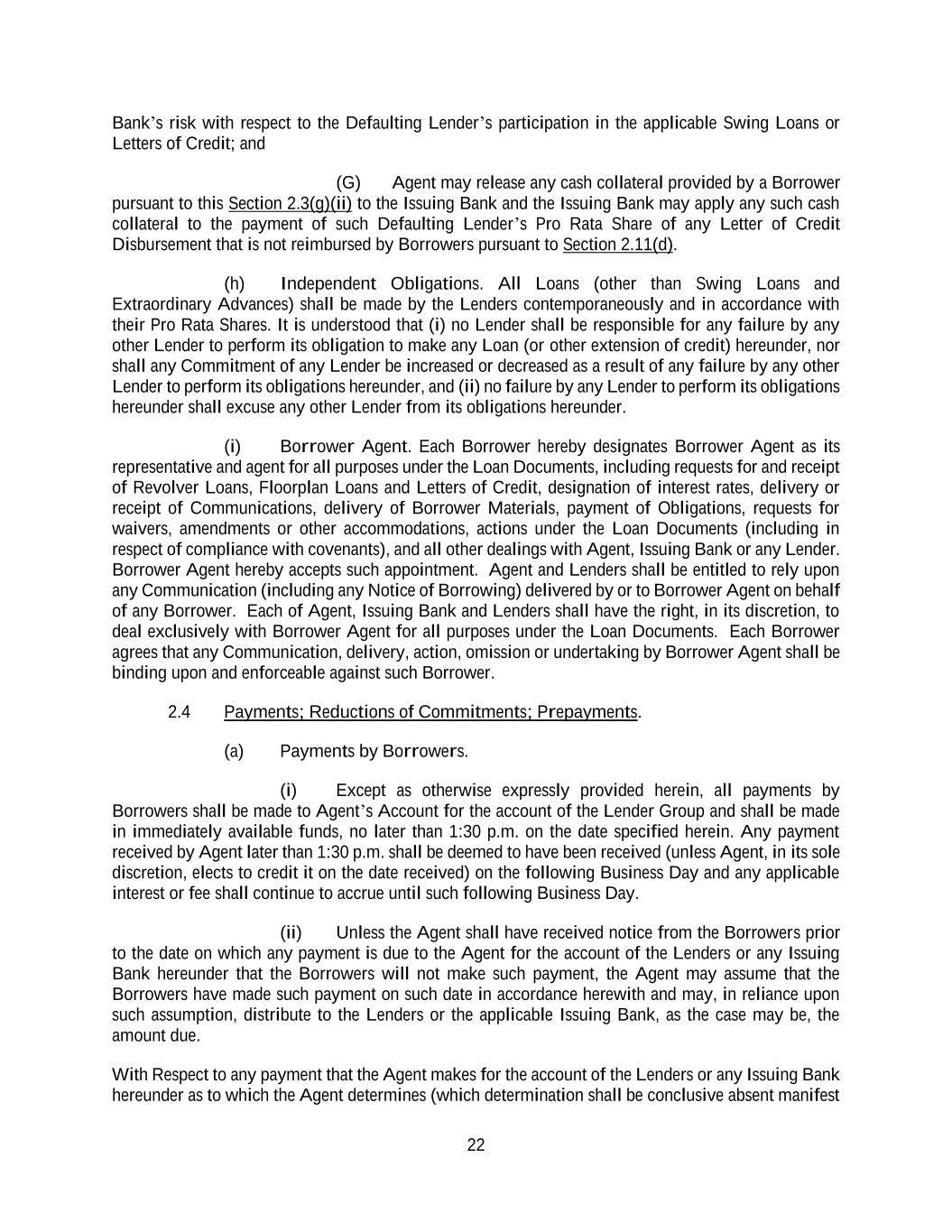 22 Bank’s risk with respect to the Defaulting Lender’s participation in the applicable Swing Loans or Letters of Credit; and (G) Agent may release any cash collateral provided by a Borrower pursuant to this Section 2.3(g)(ii) to the Issuing Bank and the Issuing Bank may apply any such cash collateral to the payment of such Defaulting Lender’s Pro Rata Share of any Letter of Credit Disbursement that is not reimbursed by Borrowers pursuant to Section 2.11(d). (h) Independent Obligations. All Loans (other than Swing Loans and Extraordinary Advances) shall be made by the Lenders contemporaneously and in accordance with their Pro Rata Shares. It is understood that (i) no Lender shall be responsible for any failure by any other Lender to perform its obligation to make any Loan (or other extension of credit) hereunder, nor shall any Commitment of any Lender be increased or decreased as a result of any failure by any other Lender to perform its obligations hereunder, and (ii) no failure by any Lender to perform its obligations hereunder shall excuse any other Lender from its obligations hereunder. (i) Borrower Agent. Each Borrower hereby designates Borrower Agent as its representative and agent for all purposes under the Loan Documents, including requests for and receipt of Revolver Loans, Floorplan Loans and Letters of Credit, designation of interest rates, delivery or receipt of Communications, delivery of Borrower Materials, payment of Obligations, requests for waivers, amendments or other accommodations, actions under the Loan Documents (including in respect of compliance with covenants), and all other dealings with Agent, Issuing Bank or any Lender. Borrower Agent hereby accepts such appointment. Agent and Lenders shall be entitled to rely upon any Communication (including any Notice of Borrowing) delivered by or to Borrower Agent on behalf of any Borrower. Each of Agent, Issuing Bank and Lenders shall have the right, in its discretion, to deal exclusively with Borrower Agent for all purposes under the Loan Documents. Each Borrower agrees that any Communication, delivery, action, omission or undertaking by Borrower Agent shall be binding upon and enforceable against such Borrower. 2.4 Payments; Reductions of Commitments; Prepayments. (a) Payments by Borrowers. (i) Except as otherwise expressly provided herein, all payments by Borrowers shall be made to Agent’s Account for the account of the Lender Group and shall be made in immediately available funds, no later than 1:30 p.m. on the date specified herein. Any payment received by Agent later than 1:30 p.m. shall be deemed to have been received (unless Agent, in its sole discretion, elects to credit it on the date received) on the following Business Day and any applicable interest or fee shall continue to accrue until such following Business Day. (ii) Unless the Agent shall have received notice from the Borrowers prior to the date on which any payment is due to the Agent for the account of the Lenders or any Issuing Bank hereunder that the Borrowers will not make such payment, the Agent may assume that the Borrowers have made such payment on such date in accordance herewith and may, in reliance upon such assumption, distribute to the Lenders or the applicable Issuing Bank, as the case may be, the amount due. With Respect to any payment that the Agent makes for the account of the Lenders or any Issuing Bank hereunder as to which the Agent determines (which determination shall be conclusive absent manifest