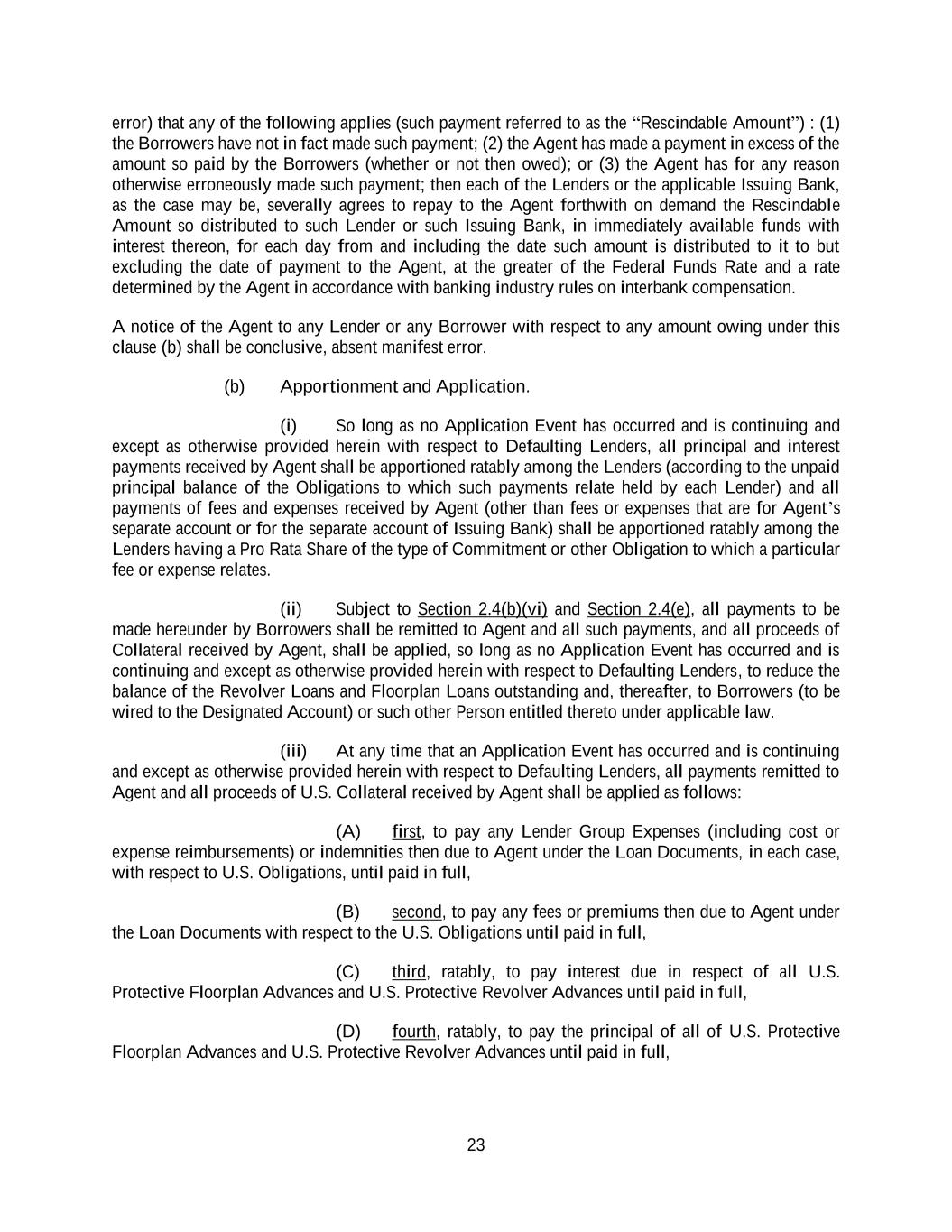 23 error) that any of the following applies (such payment referred to as the “Rescindable Amount”) : (1) the Borrowers have not in fact made such payment; (2) the Agent has made a payment in excess of the amount so paid by the Borrowers (whether or not then owed); or (3) the Agent has for any reason otherwise erroneously made such payment; then each of the Lenders or the applicable Issuing Bank, as the case may be, severally agrees to repay to the Agent forthwith on demand the Rescindable Amount so distributed to such Lender or such Issuing Bank, in immediately available funds with interest thereon, for each day from and including the date such amount is distributed to it to but excluding the date of payment to the Agent, at the greater of the Federal Funds Rate and a rate determined by the Agent in accordance with banking industry rules on interbank compensation. A notice of the Agent to any Lender or any Borrower with respect to any amount owing under this clause (b) shall be conclusive, absent manifest error. (b) Apportionment and Application. (i) So long as no Application Event has occurred and is continuing and except as otherwise provided herein with respect to Defaulting Lenders, all principal and interest payments received by Agent shall be apportioned ratably among the Lenders (according to the unpaid principal balance of the Obligations to which such payments relate held by each Lender) and all payments of fees and expenses received by Agent (other than fees or expenses that are for Agent’s separate account or for the separate account of Issuing Bank) shall be apportioned ratably among the Lenders having a Pro Rata Share of the type of Commitment or other Obligation to which a particular fee or expense relates. (ii) Subject to Section 2.4(b)(vi) and Section 2.4(e), all payments to be made hereunder by Borrowers shall be remitted to Agent and all such payments, and all proceeds of Collateral received by Agent, shall be applied, so long as no Application Event has occurred and is continuing and except as otherwise provided herein with respect to Defaulting Lenders, to reduce the balance of the Revolver Loans and Floorplan Loans outstanding and, thereafter, to Borrowers (to be wired to the Designated Account) or such other Person entitled thereto under applicable law. (iii) At any time that an Application Event has occurred and is continuing and except as otherwise provided herein with respect to Defaulting Lenders, all payments remitted to Agent and all proceeds of U.S. Collateral received by Agent shall be applied as follows: (A) first, to pay any Lender Group Expenses (including cost or expense reimbursements) or indemnities then due to Agent under the Loan Documents, in each case, with respect to U.S. Obligations, until paid in full, (B) second, to pay any fees or premiums then due to Agent under the Loan Documents with respect to the U.S. Obligations until paid in full, (C) third, ratably, to pay interest due in respect of all U.S. Protective Floorplan Advances and U.S. Protective Revolver Advances until paid in full, (D) fourth, ratably, to pay the principal of all of U.S. Protective Floorplan Advances and U.S. Protective Revolver Advances until paid in full,