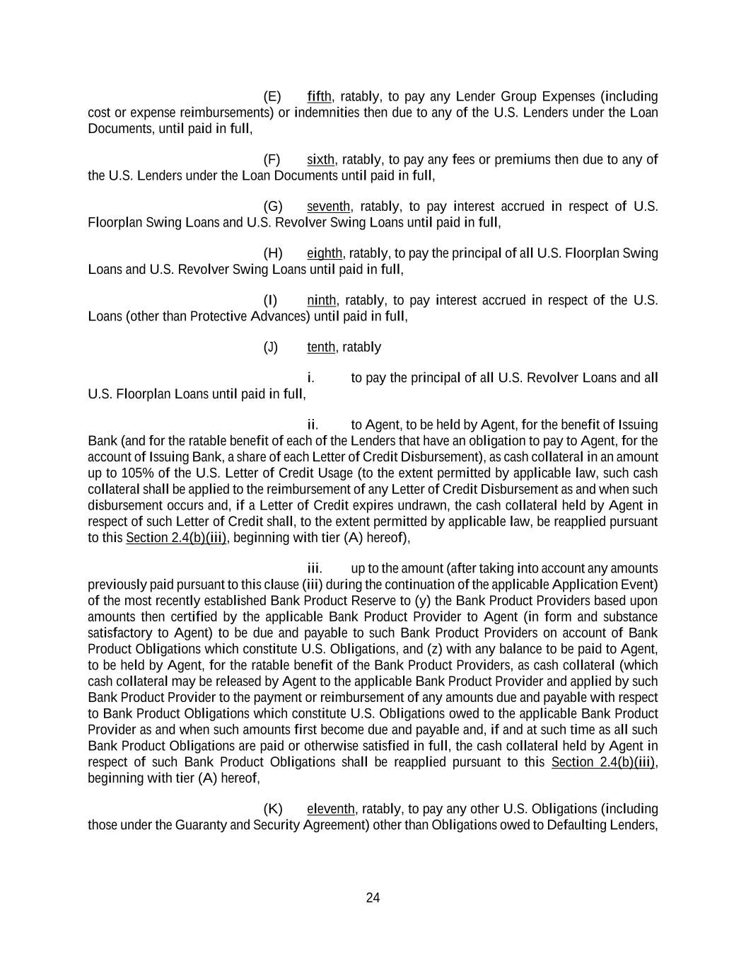 24 (E) fifth, ratably, to pay any Lender Group Expenses (including cost or expense reimbursements) or indemnities then due to any of the U.S. Lenders under the Loan Documents, until paid in full, (F) sixth, ratably, to pay any fees or premiums then due to any of the U.S. Lenders under the Loan Documents until paid in full, (G) seventh, ratably, to pay interest accrued in respect of U.S. Floorplan Swing Loans and U.S. Revolver Swing Loans until paid in full, (H) eighth, ratably, to pay the principal of all U.S. Floorplan Swing Loans and U.S. Revolver Swing Loans until paid in full, (I) ninth, ratably, to pay interest accrued in respect of the U.S. Loans (other than Protective Advances) until paid in full, (J) tenth, ratably i. to pay the principal of all U.S. Revolver Loans and all U.S. Floorplan Loans until paid in full, ii. to Agent, to be held by Agent, for the benefit of Issuing Bank (and for the ratable benefit of each of the Lenders that have an obligation to pay to Agent, for the account of Issuing Bank, a share of each Letter of Credit Disbursement), as cash collateral in an amount up to 105% of the U.S. Letter of Credit Usage (to the extent permitted by applicable law, such cash collateral shall be applied to the reimbursement of any Letter of Credit Disbursement as and when such disbursement occurs and, if a Letter of Credit expires undrawn, the cash collateral held by Agent in respect of such Letter of Credit shall, to the extent permitted by applicable law, be reapplied pursuant to this Section 2.4(b)(iii), beginning with tier (A) hereof), iii. up to the amount (after taking into account any amounts previously paid pursuant to this clause (iii) during the continuation of the applicable Application Event) of the most recently established Bank Product Reserve to (y) the Bank Product Providers based upon amounts then certified by the applicable Bank Product Provider to Agent (in form and substance satisfactory to Agent) to be due and payable to such Bank Product Providers on account of Bank Product Obligations which constitute U.S. Obligations, and (z) with any balance to be paid to Agent, to be held by Agent, for the ratable benefit of the Bank Product Providers, as cash collateral (which cash collateral may be released by Agent to the applicable Bank Product Provider and applied by such Bank Product Provider to the payment or reimbursement of any amounts due and payable with respect to Bank Product Obligations which constitute U.S. Obligations owed to the applicable Bank Product Provider as and when such amounts first become due and payable and, if and at such time as all such Bank Product Obligations are paid or otherwise satisfied in full, the cash collateral held by Agent in respect of such Bank Product Obligations shall be reapplied pursuant to this Section 2.4(b)(iii), beginning with tier (A) hereof, (K) eleventh, ratably, to pay any other U.S. Obligations (including those under the Guaranty and Security Agreement) other than Obligations owed to Defaulting Lenders,