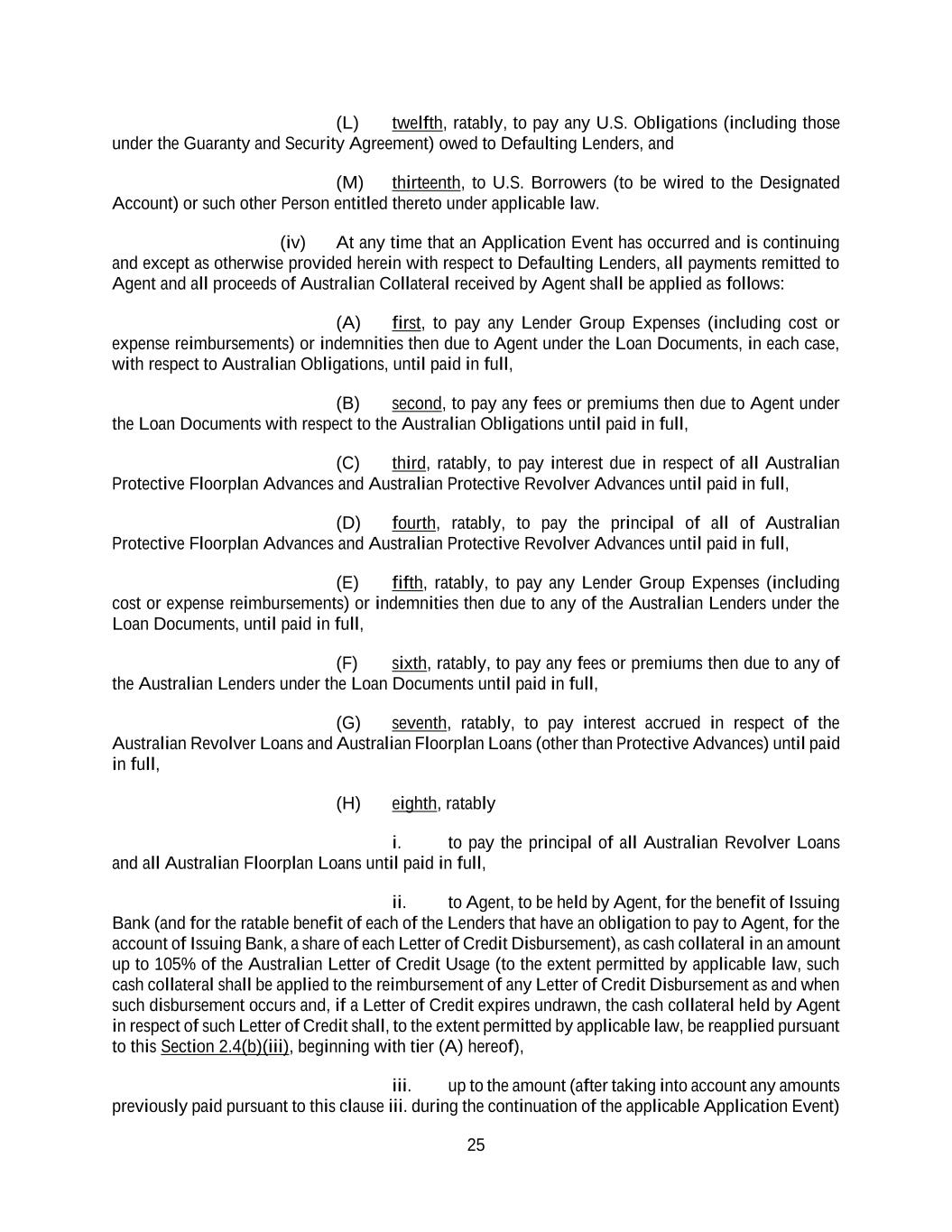 25 (L) twelfth, ratably, to pay any U.S. Obligations (including those under the Guaranty and Security Agreement) owed to Defaulting Lenders, and (M) thirteenth, to U.S. Borrowers (to be wired to the Designated Account) or such other Person entitled thereto under applicable law. (iv) At any time that an Application Event has occurred and is continuing and except as otherwise provided herein with respect to Defaulting Lenders, all payments remitted to Agent and all proceeds of Australian Collateral received by Agent shall be applied as follows: (A) first, to pay any Lender Group Expenses (including cost or expense reimbursements) or indemnities then due to Agent under the Loan Documents, in each case, with respect to Australian Obligations, until paid in full, (B) second, to pay any fees or premiums then due to Agent under the Loan Documents with respect to the Australian Obligations until paid in full, (C) third, ratably, to pay interest due in respect of all Australian Protective Floorplan Advances and Australian Protective Revolver Advances until paid in full, (D) fourth, ratably, to pay the principal of all of Australian Protective Floorplan Advances and Australian Protective Revolver Advances until paid in full, (E) fifth, ratably, to pay any Lender Group Expenses (including cost or expense reimbursements) or indemnities then due to any of the Australian Lenders under the Loan Documents, until paid in full, (F) sixth, ratably, to pay any fees or premiums then due to any of the Australian Lenders under the Loan Documents until paid in full, (G) seventh, ratably, to pay interest accrued in respect of the Australian Revolver Loans and Australian Floorplan Loans (other than Protective Advances) until paid in full, (H) eighth, ratably i. to pay the principal of all Australian Revolver Loans and all Australian Floorplan Loans until paid in full, ii. to Agent, to be held by Agent, for the benefit of Issuing Bank (and for the ratable benefit of each of the Lenders that have an obligation to pay to Agent, for the account of Issuing Bank, a share of each Letter of Credit Disbursement), as cash collateral in an amount up to 105% of the Australian Letter of Credit Usage (to the extent permitted by applicable law, such cash collateral shall be applied to the reimbursement of any Letter of Credit Disbursement as and when such disbursement occurs and, if a Letter of Credit expires undrawn, the cash collateral held by Agent in respect of such Letter of Credit shall, to the extent permitted by applicable law, be reapplied pursuant to this Section 2.4(b)(iii), beginning with tier (A) hereof), iii. up to the amount (after taking into account any amounts previously paid pursuant to this clause iii. during the continuation of the applicable Application Event)