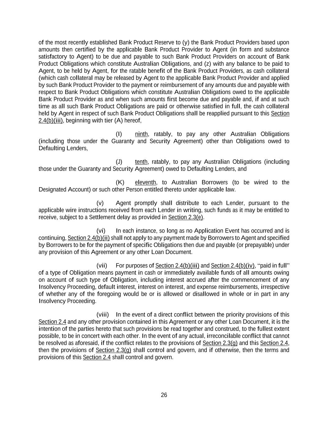 26 of the most recently established Bank Product Reserve to (y) the Bank Product Providers based upon amounts then certified by the applicable Bank Product Provider to Agent (in form and substance satisfactory to Agent) to be due and payable to such Bank Product Providers on account of Bank Product Obligations which constitute Australian Obligations, and (z) with any balance to be paid to Agent, to be held by Agent, for the ratable benefit of the Bank Product Providers, as cash collateral (which cash collateral may be released by Agent to the applicable Bank Product Provider and applied by such Bank Product Provider to the payment or reimbursement of any amounts due and payable with respect to Bank Product Obligations which constitute Australian Obligations owed to the applicable Bank Product Provider as and when such amounts first become due and payable and, if and at such time as all such Bank Product Obligations are paid or otherwise satisfied in full, the cash collateral held by Agent in respect of such Bank Product Obligations shall be reapplied pursuant to this Section 2.4(b)(iii), beginning with tier (A) hereof, (I) ninth, ratably, to pay any other Australian Obligations (including those under the Guaranty and Security Agreement) other than Obligations owed to Defaulting Lenders, (J) tenth, ratably, to pay any Australian Obligations (including those under the Guaranty and Security Agreement) owed to Defaulting Lenders, and (K) eleventh, to Australian Borrowers (to be wired to the Designated Account) or such other Person entitled thereto under applicable law. (v) Agent promptly shall distribute to each Lender, pursuant to the applicable wire instructions received from each Lender in writing, such funds as it may be entitled to receive, subject to a Settlement delay as provided in Section 2.3(e). (vi) In each instance, so long as no Application Event has occurred and is continuing, Section 2.4(b)(ii) shall not apply to any payment made by Borrowers to Agent and specified by Borrowers to be for the payment of specific Obligations then due and payable (or prepayable) under any provision of this Agreement or any other Loan Document. (vii) For purposes of Section 2.4(b)(iii) and Section 2.4(b)(iv), “paid in full” of a type of Obligation means payment in cash or immediately available funds of all amounts owing on account of such type of Obligation, including interest accrued after the commencement of any Insolvency Proceeding, default interest, interest on interest, and expense reimbursements, irrespective of whether any of the foregoing would be or is allowed or disallowed in whole or in part in any Insolvency Proceeding. (viii) In the event of a direct conflict between the priority provisions of this Section 2.4 and any other provision contained in this Agreement or any other Loan Document, it is the intention of the parties hereto that such provisions be read together and construed, to the fullest extent possible, to be in concert with each other. In the event of any actual, irreconcilable conflict that cannot be resolved as aforesaid, if the conflict relates to the provisions of Section 2.3(g) and this Section 2.4, then the provisions of Section 2.3(g) shall control and govern, and if otherwise, then the terms and provisions of this Section 2.4 shall control and govern.