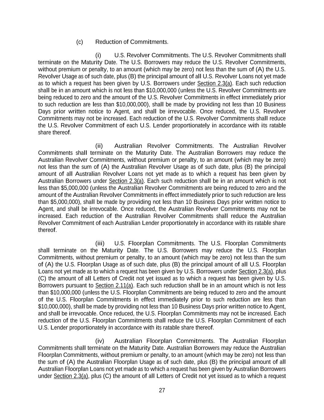 27 (c) Reduction of Commitments. (i) U.S. Revolver Commitments. The U.S. Revolver Commitments shall terminate on the Maturity Date. The U.S. Borrowers may reduce the U.S. Revolver Commitments, without premium or penalty, to an amount (which may be zero) not less than the sum of (A) the U.S. Revolver Usage as of such date, plus (B) the principal amount of all U.S. Revolver Loans not yet made as to which a request has been given by U.S. Borrowers under Section 2.3(a). Each such reduction shall be in an amount which is not less than $10,000,000 (unless the U.S. Revolver Commitments are being reduced to zero and the amount of the U.S. Revolver Commitments in effect immediately prior to such reduction are less than $10,000,000), shall be made by providing not less than 10 Business Days prior written notice to Agent, and shall be irrevocable. Once reduced, the U.S. Revolver Commitments may not be increased. Each reduction of the U.S. Revolver Commitments shall reduce the U.S. Revolver Commitment of each U.S. Lender proportionately in accordance with its ratable share thereof. (ii) Australian Revolver Commitments. The Australian Revolver Commitments shall terminate on the Maturity Date. The Australian Borrowers may reduce the Australian Revolver Commitments, without premium or penalty, to an amount (which may be zero) not less than the sum of (A) the Australian Revolver Usage as of such date, plus (B) the principal amount of all Australian Revolver Loans not yet made as to which a request has been given by Australian Borrowers under Section 2.3(a). Each such reduction shall be in an amount which is not less than $5,000,000 (unless the Australian Revolver Commitments are being reduced to zero and the amount of the Australian Revolver Commitments in effect immediately prior to such reduction are less than $5,000,000), shall be made by providing not less than 10 Business Days prior written notice to Agent, and shall be irrevocable. Once reduced, the Australian Revolver Commitments may not be increased. Each reduction of the Australian Revolver Commitments shall reduce the Australian Revolver Commitment of each Australian Lender proportionately in accordance with its ratable share thereof. (iii) U.S. Floorplan Commitments. The U.S. Floorplan Commitments shall terminate on the Maturity Date. The U.S. Borrowers may reduce the U.S. Floorplan Commitments, without premium or penalty, to an amount (which may be zero) not less than the sum of (A) the U.S. Floorplan Usage as of such date, plus (B) the principal amount of all U.S. Floorplan Loans not yet made as to which a request has been given by U.S. Borrowers under Section 2.3(a), plus (C) the amount of all Letters of Credit not yet issued as to which a request has been given by U.S. Borrowers pursuant to Section 2.11(a). Each such reduction shall be in an amount which is not less than $10,000,000 (unless the U.S. Floorplan Commitments are being reduced to zero and the amount of the U.S. Floorplan Commitments in effect immediately prior to such reduction are less than $10,000,000), shall be made by providing not less than 10 Business Days prior written notice to Agent, and shall be irrevocable. Once reduced, the U.S. Floorplan Commitments may not be increased. Each reduction of the U.S. Floorplan Commitments shall reduce the U.S. Floorplan Commitment of each U.S. Lender proportionately in accordance with its ratable share thereof. (iv) Australian Floorplan Commitments. The Australian Floorplan Commitments shall terminate on the Maturity Date. Australian Borrowers may reduce the Australian Floorplan Commitments, without premium or penalty, to an amount (which may be zero) not less than the sum of (A) the Australian Floorplan Usage as of such date, plus (B) the principal amount of all Australian Floorplan Loans not yet made as to which a request has been given by Australian Borrowers under Section 2.3(a), plus (C) the amount of all Letters of Credit not yet issued as to which a request