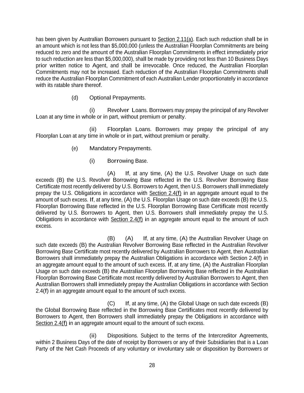 28 has been given by Australian Borrowers pursuant to Section 2.11(a). Each such reduction shall be in an amount which is not less than $5,000,000 (unless the Australian Floorplan Commitments are being reduced to zero and the amount of the Australian Floorplan Commitments in effect immediately prior to such reduction are less than $5,000,000), shall be made by providing not less than 10 Business Days prior written notice to Agent, and shall be irrevocable. Once reduced, the Australian Floorplan Commitments may not be increased. Each reduction of the Australian Floorplan Commitments shall reduce the Australian Floorplan Commitment of each Australian Lender proportionately in accordance with its ratable share thereof. (d) Optional Prepayments. (i) Revolver Loans. Borrowers may prepay the principal of any Revolver Loan at any time in whole or in part, without premium or penalty. (ii) Floorplan Loans. Borrowers may prepay the principal of any Floorplan Loan at any time in whole or in part, without premium or penalty. (e) Mandatory Prepayments. (i) Borrowing Base. (A) If, at any time, (A) the U.S. Revolver Usage on such date exceeds (B) the U.S. Revolver Borrowing Base reflected in the U.S. Revolver Borrowing Base Certificate most recently delivered by U.S. Borrowers to Agent, then U.S. Borrowers shall immediately prepay the U.S. Obligations in accordance with Section 2.4(f) in an aggregate amount equal to the amount of such excess. If, at any time, (A) the U.S. Floorplan Usage on such date exceeds (B) the U.S. Floorplan Borrowing Base reflected in the U.S. Floorplan Borrowing Base Certificate most recently delivered by U.S. Borrowers to Agent, then U.S. Borrowers shall immediately prepay the U.S. Obligations in accordance with Section 2.4(f) in an aggregate amount equal to the amount of such excess. (B) (A) If, at any time, (A) the Australian Revolver Usage on such date exceeds (B) the Australian Revolver Borrowing Base reflected in the Australian Revolver Borrowing Base Certificate most recently delivered by Australian Borrowers to Agent, then Australian Borrowers shall immediately prepay the Australian Obligations in accordance with Section 2.4(f) in an aggregate amount equal to the amount of such excess. If, at any time, (A) the Australian Floorplan Usage on such date exceeds (B) the Australian Floorplan Borrowing Base reflected in the Australian Floorplan Borrowing Base Certificate most recently delivered by Australian Borrowers to Agent, then Australian Borrowers shall immediately prepay the Australian Obligations in accordance with Section 2.4(f) in an aggregate amount equal to the amount of such excess. (C) If, at any time, (A) the Global Usage on such date exceeds (B) the Global Borrowing Base reflected in the Borrowing Base Certificates most recently delivered by Borrowers to Agent, then Borrowers shall immediately prepay the Obligations in accordance with Section 2.4(f) in an aggregate amount equal to the amount of such excess. (ii) Dispositions. Subject to the terms of the Intercreditor Agreements, within 2 Business Days of the date of receipt by Borrowers or any of their Subsidiaries that is a Loan Party of the Net Cash Proceeds of any voluntary or involuntary sale or disposition by Borrowers or