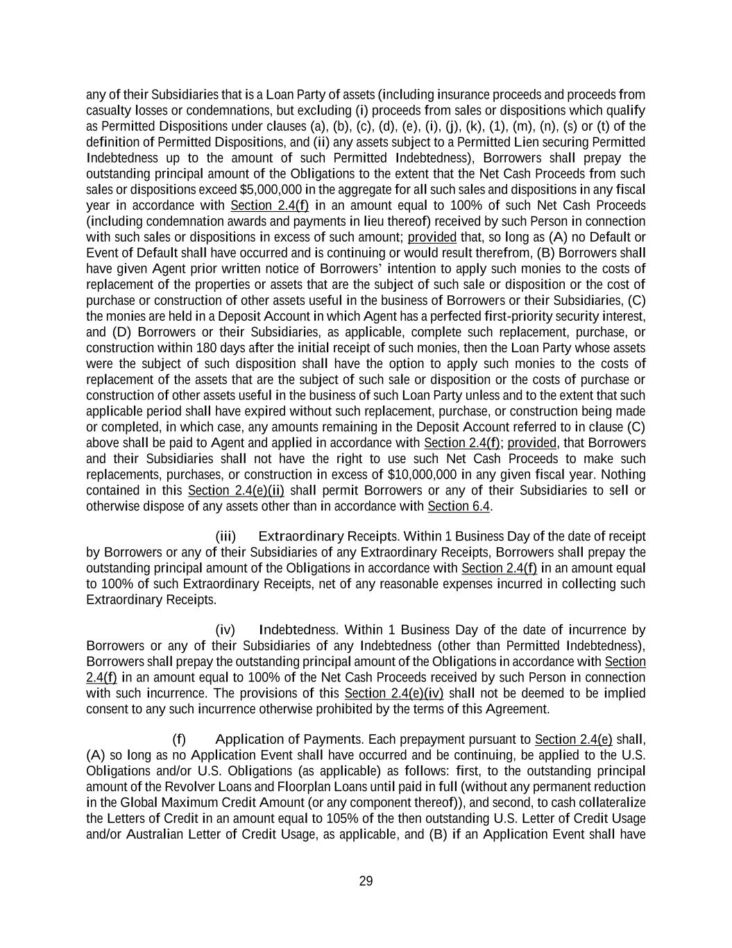 29 any of their Subsidiaries that is a Loan Party of assets (including insurance proceeds and proceeds from casualty losses or condemnations, but excluding (i) proceeds from sales or dispositions which qualify as Permitted Dispositions under clauses (a), (b), (c), (d), (e), (i), (j), (k), (1), (m), (n), (s) or (t) of the definition of Permitted Dispositions, and (ii) any assets subject to a Permitted Lien securing Permitted Indebtedness up to the amount of such Permitted Indebtedness), Borrowers shall prepay the outstanding principal amount of the Obligations to the extent that the Net Cash Proceeds from such sales or dispositions exceed $5,000,000 in the aggregate for all such sales and dispositions in any fiscal year in accordance with Section 2.4(f) in an amount equal to 100% of such Net Cash Proceeds (including condemnation awards and payments in lieu thereof) received by such Person in connection with such sales or dispositions in excess of such amount; provided that, so long as (A) no Default or Event of Default shall have occurred and is continuing or would result therefrom, (B) Borrowers shall have given Agent prior written notice of Borrowers’ intention to apply such monies to the costs of replacement of the properties or assets that are the subject of such sale or disposition or the cost of purchase or construction of other assets useful in the business of Borrowers or their Subsidiaries, (C) the monies are held in a Deposit Account in which Agent has a perfected first-priority security interest, and (D) Borrowers or their Subsidiaries, as applicable, complete such replacement, purchase, or construction within 180 days after the initial receipt of such monies, then the Loan Party whose assets were the subject of such disposition shall have the option to apply such monies to the costs of replacement of the assets that are the subject of such sale or disposition or the costs of purchase or construction of other assets useful in the business of such Loan Party unless and to the extent that such applicable period shall have expired without such replacement, purchase, or construction being made or completed, in which case, any amounts remaining in the Deposit Account referred to in clause (C) above shall be paid to Agent and applied in accordance with Section 2.4(f); provided, that Borrowers and their Subsidiaries shall not have the right to use such Net Cash Proceeds to make such replacements, purchases, or construction in excess of $10,000,000 in any given fiscal year. Nothing contained in this Section 2.4(e)(ii) shall permit Borrowers or any of their Subsidiaries to sell or otherwise dispose of any assets other than in accordance with Section 6.4. (iii) Extraordinary Receipts. Within 1 Business Day of the date of receipt by Borrowers or any of their Subsidiaries of any Extraordinary Receipts, Borrowers shall prepay the outstanding principal amount of the Obligations in accordance with Section 2.4(f) in an amount equal to 100% of such Extraordinary Receipts, net of any reasonable expenses incurred in collecting such Extraordinary Receipts. (iv) Indebtedness. Within 1 Business Day of the date of incurrence by Borrowers or any of their Subsidiaries of any Indebtedness (other than Permitted Indebtedness), Borrowers shall prepay the outstanding principal amount of the Obligations in accordance with Section 2.4(f) in an amount equal to 100% of the Net Cash Proceeds received by such Person in connection with such incurrence. The provisions of this Section 2.4(e)(iv) shall not be deemed to be implied consent to any such incurrence otherwise prohibited by the terms of this Agreement. (f) Application of Payments. Each prepayment pursuant to Section 2.4(e) shall, (A) so long as no Application Event shall have occurred and be continuing, be applied to the U.S. Obligations and/or U.S. Obligations (as applicable) as follows: first, to the outstanding principal amount of the Revolver Loans and Floorplan Loans until paid in full (without any permanent reduction in the Global Maximum Credit Amount (or any component thereof)), and second, to cash collateralize the Letters of Credit in an amount equal to 105% of the then outstanding U.S. Letter of Credit Usage and/or Australian Letter of Credit Usage, as applicable, and (B) if an Application Event shall have