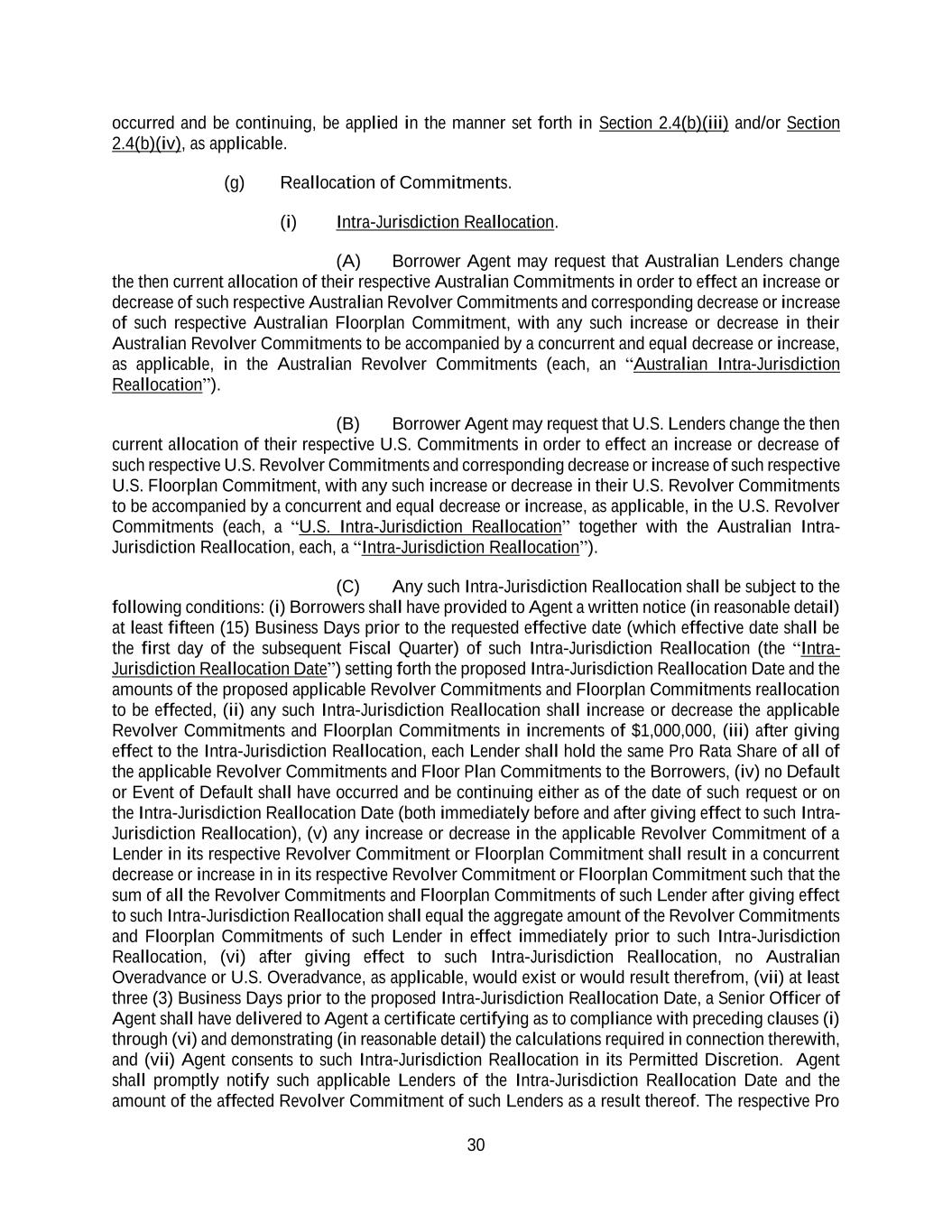 30 occurred and be continuing, be applied in the manner set forth in Section 2.4(b)(iii) and/or Section 2.4(b)(iv), as applicable. (g) Reallocation of Commitments. (i) Intra-Jurisdiction Reallocation. (A) Borrower Agent may request that Australian Lenders change the then current allocation of their respective Australian Commitments in order to effect an increase or decrease of such respective Australian Revolver Commitments and corresponding decrease or increase of such respective Australian Floorplan Commitment, with any such increase or decrease in their Australian Revolver Commitments to be accompanied by a concurrent and equal decrease or increase, as applicable, in the Australian Revolver Commitments (each, an “Australian Intra-Jurisdiction Reallocation”). (B) Borrower Agent may request that U.S. Lenders change the then current allocation of their respective U.S. Commitments in order to effect an increase or decrease of such respective U.S. Revolver Commitments and corresponding decrease or increase of such respective U.S. Floorplan Commitment, with any such increase or decrease in their U.S. Revolver Commitments to be accompanied by a concurrent and equal decrease or increase, as applicable, in the U.S. Revolver Commitments (each, a “U.S. Intra-Jurisdiction Reallocation” together with the Australian Intra- Jurisdiction Reallocation, each, a “Intra-Jurisdiction Reallocation”). (C) Any such Intra-Jurisdiction Reallocation shall be subject to the following conditions: (i) Borrowers shall have provided to Agent a written notice (in reasonable detail) at least fifteen (15) Business Days prior to the requested effective date (which effective date shall be the first day of the subsequent Fiscal Quarter) of such Intra-Jurisdiction Reallocation (the “Intra- Jurisdiction Reallocation Date”) setting forth the proposed Intra-Jurisdiction Reallocation Date and the amounts of the proposed applicable Revolver Commitments and Floorplan Commitments reallocation to be effected, (ii) any such Intra-Jurisdiction Reallocation shall increase or decrease the applicable Revolver Commitments and Floorplan Commitments in increments of $1,000,000, (iii) after giving effect to the Intra-Jurisdiction Reallocation, each Lender shall hold the same Pro Rata Share of all of the applicable Revolver Commitments and Floor Plan Commitments to the Borrowers, (iv) no Default or Event of Default shall have occurred and be continuing either as of the date of such request or on the Intra-Jurisdiction Reallocation Date (both immediately before and after giving effect to such Intra- Jurisdiction Reallocation), (v) any increase or decrease in the applicable Revolver Commitment of a Lender in its respective Revolver Commitment or Floorplan Commitment shall result in a concurrent decrease or increase in in its respective Revolver Commitment or Floorplan Commitment such that the sum of all the Revolver Commitments and Floorplan Commitments of such Lender after giving effect to such Intra-Jurisdiction Reallocation shall equal the aggregate amount of the Revolver Commitments and Floorplan Commitments of such Lender in effect immediately prior to such Intra-Jurisdiction Reallocation, (vi) after giving effect to such Intra-Jurisdiction Reallocation, no Australian Overadvance or U.S. Overadvance, as applicable, would exist or would result therefrom, (vii) at least three (3) Business Days prior to the proposed Intra-Jurisdiction Reallocation Date, a Senior Officer of Agent shall have delivered to Agent a certificate certifying as to compliance with preceding clauses (i) through (vi) and demonstrating (in reasonable detail) the calculations required in connection therewith, and (vii) Agent consents to such Intra-Jurisdiction Reallocation in its Permitted Discretion. Agent shall promptly notify such applicable Lenders of the Intra-Jurisdiction Reallocation Date and the amount of the affected Revolver Commitment of such Lenders as a result thereof. The respective Pro