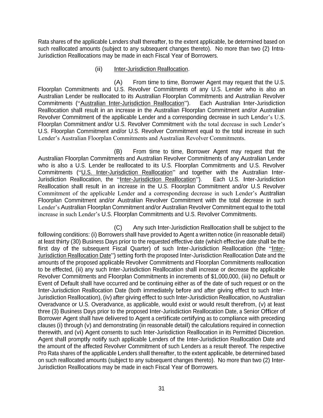 31 Rata shares of the applicable Lenders shall thereafter, to the extent applicable, be determined based on such reallocated amounts (subject to any subsequent changes thereto). No more than two (2) Intra- Jurisdiction Reallocations may be made in each Fiscal Year of Borrowers. (ii) Inter-Jurisdiction Reallocation. (A) From time to time, Borrower Agent may request that the U.S. Floorplan Commitments and U.S. Revolver Commitments of any U.S. Lender who is also an Australian Lender be reallocated to its Australian Floorplan Commitments and Australian Revolver Commitments (“Australian Inter-Jurisdiction Reallocation”). Each Australian Inter-Jurisdiction Reallocation shall result in an increase in the Australian Floorplan Commitment and/or Australian Revolver Commitment of the applicable Lender and a corresponding decrease in such Lender’s U.S. Floorplan Commitment and/or U.S. Revolver Commitment with the total decrease in such Lender’s U.S. Floorplan Commitment and/or U.S. Revolver Commitment equal to the total increase in such Lender’s Australian Floorplan Commitments and Australian Revolver Commitments. (B) From time to time, Borrower Agent may request that the Australian Floorplan Commitments and Australian Revolver Commitments of any Australian Lender who is also a U.S. Lender be reallocated to its U.S. Floorplan Commitments and U.S. Revolver Commitments (“U.S. Inter-Jurisdiction Reallocation” and together with the Australian Inter- Jurisdiction Reallocation, the “Inter-Jurisdiction Reallocation”). Each U.S. Inter-Jurisdiction Reallocation shall result in an increase in the U.S. Floorplan Commitment and/or U.S Revolver Commitment of the applicable Lender and a corresponding decrease in such Lender’s Australian Floorplan Commitment and/or Australian Revolver Commitment with the total decrease in such Lender’s Australian Floorplan Commitment and/or Australian Revolver Commitment equal to the total increase in such Lender’s U.S. Floorplan Commitments and U.S. Revolver Commitments. (C) Any such Inter-Jurisdiction Reallocation shall be subject to the following conditions: (i) Borrowers shall have provided to Agent a written notice (in reasonable detail) at least thirty (30) Business Days prior to the requested effective date (which effective date shall be the first day of the subsequent Fiscal Quarter) of such Inter-Jurisdiction Reallocation (the “Inter- Jurisdiction Reallocation Date”) setting forth the proposed Inter-Jurisdiction Reallocation Date and the amounts of the proposed applicable Revolver Commitments and Floorplan Commitments reallocation to be effected, (ii) any such Inter-Jurisdiction Reallocation shall increase or decrease the applicable Revolver Commitments and Floorplan Commitments in increments of $1,000,000, (iii) no Default or Event of Default shall have occurred and be continuing either as of the date of such request or on the Inter-Jurisdiction Reallocation Date (both immediately before and after giving effect to such Inter- Jurisdiction Reallocation), (iv) after giving effect to such Inter-Jurisdiction Reallocation, no Australian Overadvance or U.S. Overadvance, as applicable, would exist or would result therefrom, (v) at least three (3) Business Days prior to the proposed Inter-Jurisdiction Reallocation Date, a Senior Officer of Borrower Agent shall have delivered to Agent a certificate certifying as to compliance with preceding clauses (i) through (v) and demonstrating (in reasonable detail) the calculations required in connection therewith, and (vi) Agent consents to such Inter-Jurisdiction Reallocation in its Permitted Discretion. Agent shall promptly notify such applicable Lenders of the Inter-Jurisdiction Reallocation Date and the amount of the affected Revolver Commitment of such Lenders as a result thereof. The respective Pro Rata shares of the applicable Lenders shall thereafter, to the extent applicable, be determined based on such reallocated amounts (subject to any subsequent changes thereto). No more than two (2) Inter- Jurisdiction Reallocations may be made in each Fiscal Year of Borrowers.