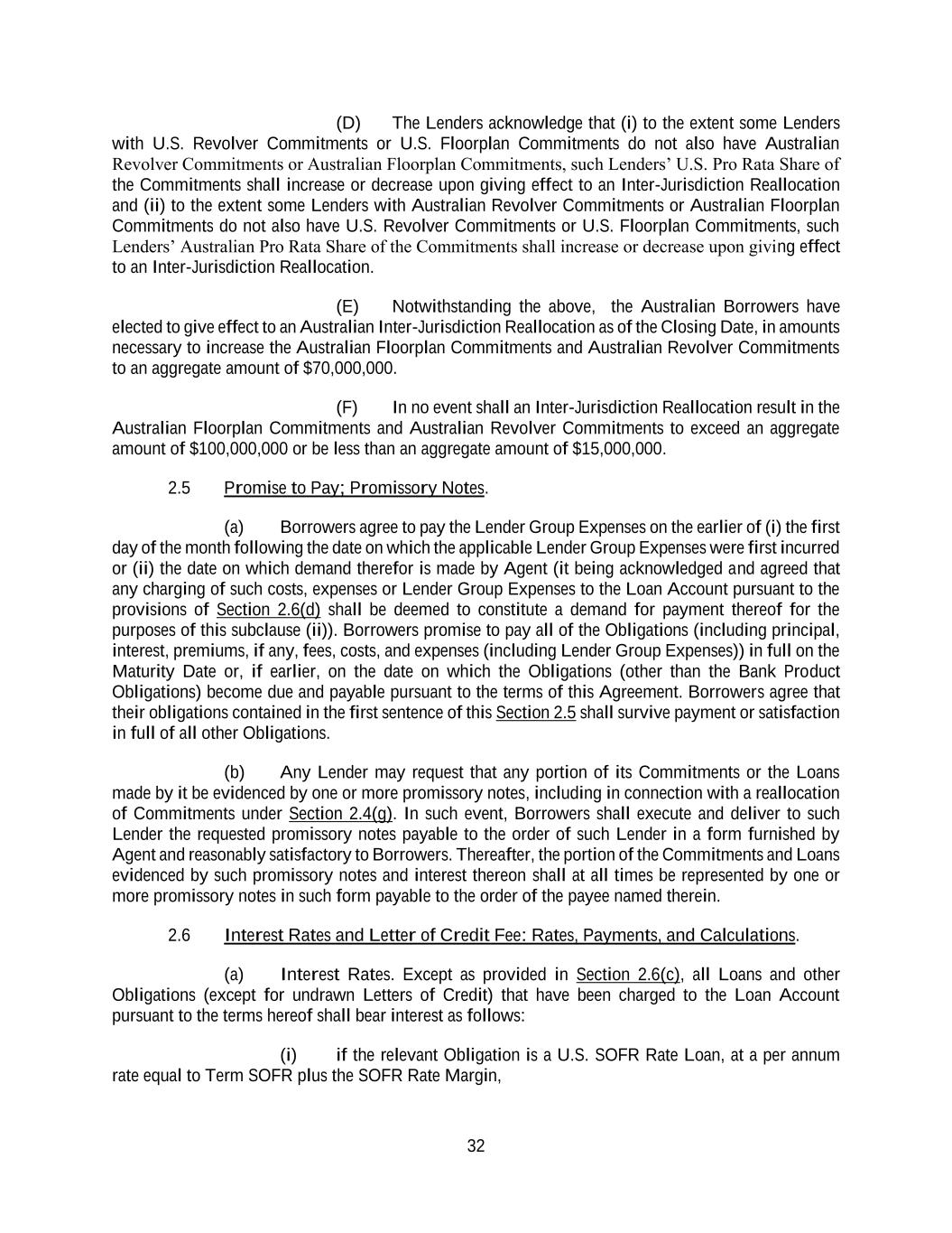 32 (D) The Lenders acknowledge that (i) to the extent some Lenders with U.S. Revolver Commitments or U.S. Floorplan Commitments do not also have Australian Revolver Commitments or Australian Floorplan Commitments, such Lenders’ U.S. Pro Rata Share of the Commitments shall increase or decrease upon giving effect to an Inter-Jurisdiction Reallocation and (ii) to the extent some Lenders with Australian Revolver Commitments or Australian Floorplan Commitments do not also have U.S. Revolver Commitments or U.S. Floorplan Commitments, such Lenders’ Australian Pro Rata Share of the Commitments shall increase or decrease upon giving effect to an Inter-Jurisdiction Reallocation. (E) Notwithstanding the above, the Australian Borrowers have elected to give effect to an Australian Inter-Jurisdiction Reallocation as of the Closing Date, in amounts necessary to increase the Australian Floorplan Commitments and Australian Revolver Commitments to an aggregate amount of $70,000,000. (F) In no event shall an Inter-Jurisdiction Reallocation result in the Australian Floorplan Commitments and Australian Revolver Commitments to exceed an aggregate amount of $100,000,000 or be less than an aggregate amount of $15,000,000. 2.5 Promise to Pay; Promissory Notes. (a) Borrowers agree to pay the Lender Group Expenses on the earlier of (i) the first day of the month following the date on which the applicable Lender Group Expenses were first incurred or (ii) the date on which demand therefor is made by Agent (it being acknowledged and agreed that any charging of such costs, expenses or Lender Group Expenses to the Loan Account pursuant to the provisions of Section 2.6(d) shall be deemed to constitute a demand for payment thereof for the purposes of this subclause (ii)). Borrowers promise to pay all of the Obligations (including principal, interest, premiums, if any, fees, costs, and expenses (including Lender Group Expenses)) in full on the Maturity Date or, if earlier, on the date on which the Obligations (other than the Bank Product Obligations) become due and payable pursuant to the terms of this Agreement. Borrowers agree that their obligations contained in the first sentence of this Section 2.5 shall survive payment or satisfaction in full of all other Obligations. (b) Any Lender may request that any portion of its Commitments or the Loans made by it be evidenced by one or more promissory notes, including in connection with a reallocation of Commitments under Section 2.4(g). In such event, Borrowers shall execute and deliver to such Lender the requested promissory notes payable to the order of such Lender in a form furnished by Agent and reasonably satisfactory to Borrowers. Thereafter, the portion of the Commitments and Loans evidenced by such promissory notes and interest thereon shall at all times be represented by one or more promissory notes in such form payable to the order of the payee named therein. 2.6 Interest Rates and Letter of Credit Fee: Rates, Payments, and Calculations. (a) Interest Rates. Except as provided in Section 2.6(c), all Loans and other Obligations (except for undrawn Letters of Credit) that have been charged to the Loan Account pursuant to the terms hereof shall bear interest as follows: (i) if the relevant Obligation is a U.S. SOFR Rate Loan, at a per annum rate equal to Term SOFR plus the SOFR Rate Margin,