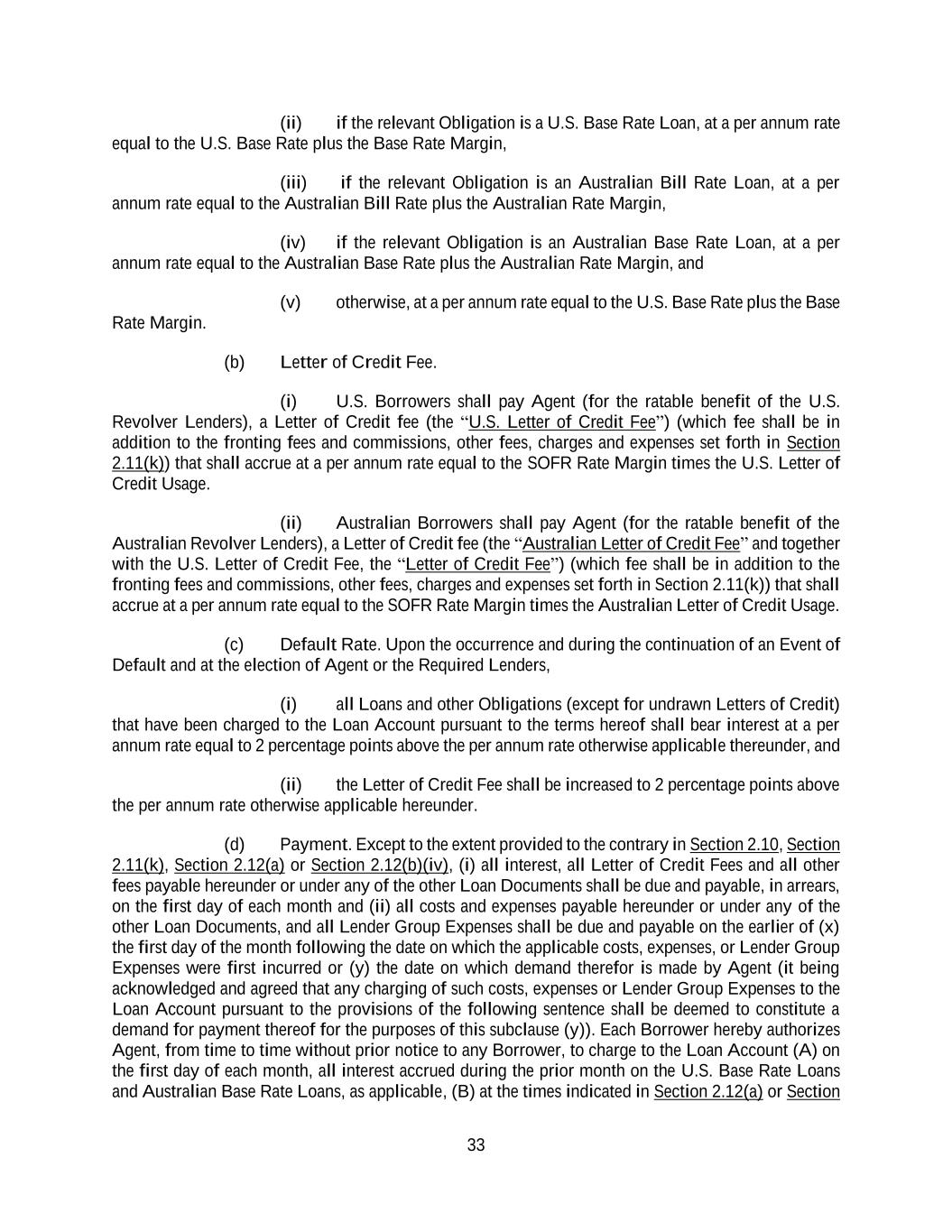 33 (ii) if the relevant Obligation is a U.S. Base Rate Loan, at a per annum rate equal to the U.S. Base Rate plus the Base Rate Margin, (iii) if the relevant Obligation is an Australian Bill Rate Loan, at a per annum rate equal to the Australian Bill Rate plus the Australian Rate Margin, (iv) if the relevant Obligation is an Australian Base Rate Loan, at a per annum rate equal to the Australian Base Rate plus the Australian Rate Margin, and (v) otherwise, at a per annum rate equal to the U.S. Base Rate plus the Base Rate Margin. (b) Letter of Credit Fee. (i) U.S. Borrowers shall pay Agent (for the ratable benefit of the U.S. Revolver Lenders), a Letter of Credit fee (the “U.S. Letter of Credit Fee”) (which fee shall be in addition to the fronting fees and commissions, other fees, charges and expenses set forth in Section 2.11(k)) that shall accrue at a per annum rate equal to the SOFR Rate Margin times the U.S. Letter of Credit Usage. (ii) Australian Borrowers shall pay Agent (for the ratable benefit of the Australian Revolver Lenders), a Letter of Credit fee (the “Australian Letter of Credit Fee” and together with the U.S. Letter of Credit Fee, the “Letter of Credit Fee”) (which fee shall be in addition to the fronting fees and commissions, other fees, charges and expenses set forth in Section 2.11(k)) that shall accrue at a per annum rate equal to the SOFR Rate Margin times the Australian Letter of Credit Usage. (c) Default Rate. Upon the occurrence and during the continuation of an Event of Default and at the election of Agent or the Required Lenders, (i) all Loans and other Obligations (except for undrawn Letters of Credit) that have been charged to the Loan Account pursuant to the terms hereof shall bear interest at a per annum rate equal to 2 percentage points above the per annum rate otherwise applicable thereunder, and (ii) the Letter of Credit Fee shall be increased to 2 percentage points above the per annum rate otherwise applicable hereunder. (d) Payment. Except to the extent provided to the contrary in Section 2.10, Section 2.11(k), Section 2.12(a) or Section 2.12(b)(iv), (i) all interest, all Letter of Credit Fees and all other fees payable hereunder or under any of the other Loan Documents shall be due and payable, in arrears, on the first day of each month and (ii) all costs and expenses payable hereunder or under any of the other Loan Documents, and all Lender Group Expenses shall be due and payable on the earlier of (x) the first day of the month following the date on which the applicable costs, expenses, or Lender Group Expenses were first incurred or (y) the date on which demand therefor is made by Agent (it being acknowledged and agreed that any charging of such costs, expenses or Lender Group Expenses to the Loan Account pursuant to the provisions of the following sentence shall be deemed to constitute a demand for payment thereof for the purposes of this subclause (y)). Each Borrower hereby authorizes Agent, from time to time without prior notice to any Borrower, to charge to the Loan Account (A) on the first day of each month, all interest accrued during the prior month on the U.S. Base Rate Loans and Australian Base Rate Loans, as applicable, (B) at the times indicated in Section 2.12(a) or Section