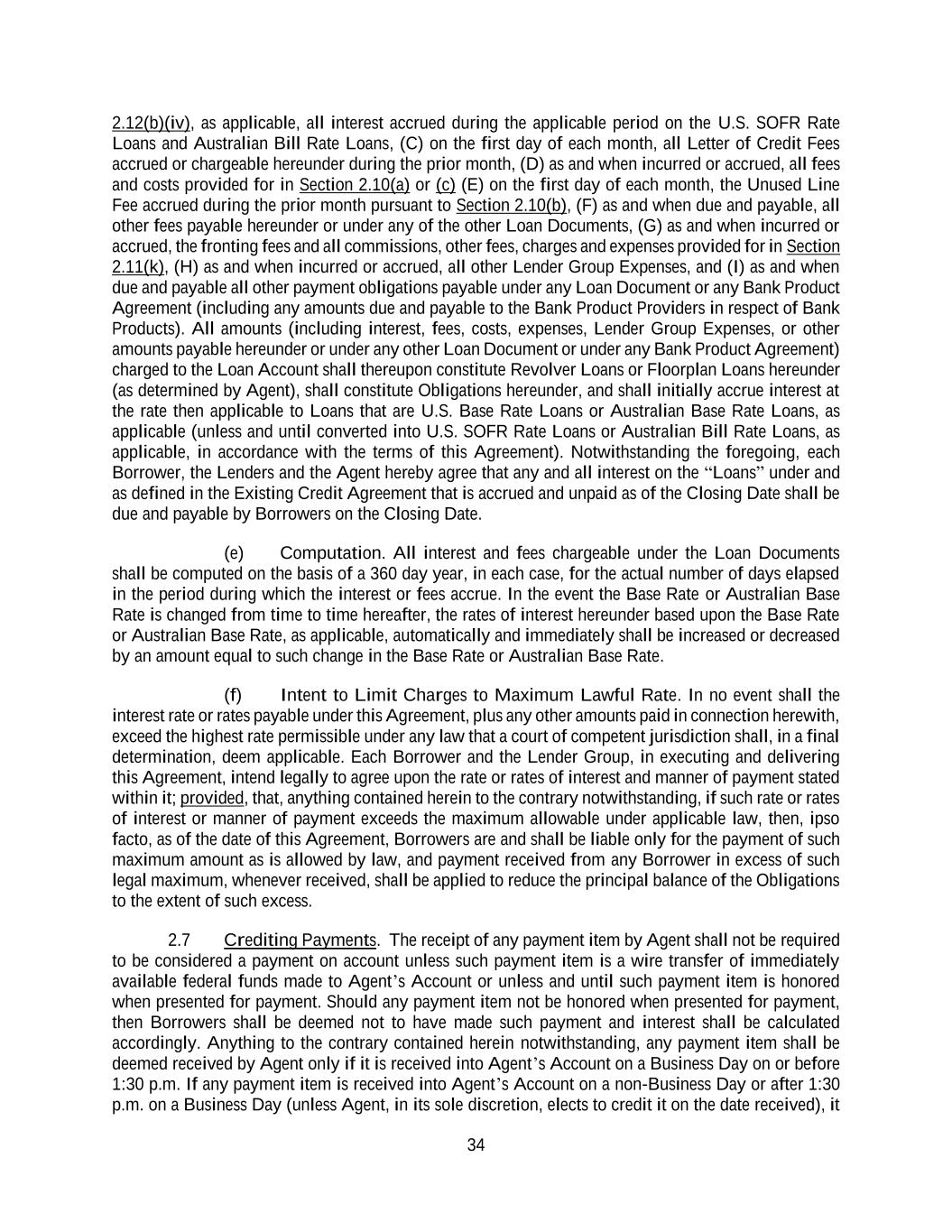 34 2.12(b)(iv), as applicable, all interest accrued during the applicable period on the U.S. SOFR Rate Loans and Australian Bill Rate Loans, (C) on the first day of each month, all Letter of Credit Fees accrued or chargeable hereunder during the prior month, (D) as and when incurred or accrued, all fees and costs provided for in Section 2.10(a) or (c) (E) on the first day of each month, the Unused Line Fee accrued during the prior month pursuant to Section 2.10(b), (F) as and when due and payable, all other fees payable hereunder or under any of the other Loan Documents, (G) as and when incurred or accrued, the fronting fees and all commissions, other fees, charges and expenses provided for in Section 2.11(k), (H) as and when incurred or accrued, all other Lender Group Expenses, and (I) as and when due and payable all other payment obligations payable under any Loan Document or any Bank Product Agreement (including any amounts due and payable to the Bank Product Providers in respect of Bank Products). All amounts (including interest, fees, costs, expenses, Lender Group Expenses, or other amounts payable hereunder or under any other Loan Document or under any Bank Product Agreement) charged to the Loan Account shall thereupon constitute Revolver Loans or Floorplan Loans hereunder (as determined by Agent), shall constitute Obligations hereunder, and shall initially accrue interest at the rate then applicable to Loans that are U.S. Base Rate Loans or Australian Base Rate Loans, as applicable (unless and until converted into U.S. SOFR Rate Loans or Australian Bill Rate Loans, as applicable, in accordance with the terms of this Agreement). Notwithstanding the foregoing, each Borrower, the Lenders and the Agent hereby agree that any and all interest on the “Loans” under and as defined in the Existing Credit Agreement that is accrued and unpaid as of the Closing Date shall be due and payable by Borrowers on the Closing Date. (e) Computation. All interest and fees chargeable under the Loan Documents shall be computed on the basis of a 360 day year, in each case, for the actual number of days elapsed in the period during which the interest or fees accrue. In the event the Base Rate or Australian Base Rate is changed from time to time hereafter, the rates of interest hereunder based upon the Base Rate or Australian Base Rate, as applicable, automatically and immediately shall be increased or decreased by an amount equal to such change in the Base Rate or Australian Base Rate. (f) Intent to Limit Charges to Maximum Lawful Rate. In no event shall the interest rate or rates payable under this Agreement, plus any other amounts paid in connection herewith, exceed the highest rate permissible under any law that a court of competent jurisdiction shall, in a final determination, deem applicable. Each Borrower and the Lender Group, in executing and delivering this Agreement, intend legally to agree upon the rate or rates of interest and manner of payment stated within it; provided, that, anything contained herein to the contrary notwithstanding, if such rate or rates of interest or manner of payment exceeds the maximum allowable under applicable law, then, ipso facto, as of the date of this Agreement, Borrowers are and shall be liable only for the payment of such maximum amount as is allowed by law, and payment received from any Borrower in excess of such legal maximum, whenever received, shall be applied to reduce the principal balance of the Obligations to the extent of such excess. 2.7 Crediting Payments. The receipt of any payment item by Agent shall not be required to be considered a payment on account unless such payment item is a wire transfer of immediately available federal funds made to Agent’s Account or unless and until such payment item is honored when presented for payment. Should any payment item not be honored when presented for payment, then Borrowers shall be deemed not to have made such payment and interest shall be calculated accordingly. Anything to the contrary contained herein notwithstanding, any payment item shall be deemed received by Agent only if it is received into Agent’s Account on a Business Day on or before 1:30 p.m. If any payment item is received into Agent’s Account on a non-Business Day or after 1:30 p.m. on a Business Day (unless Agent, in its sole discretion, elects to credit it on the date received), it