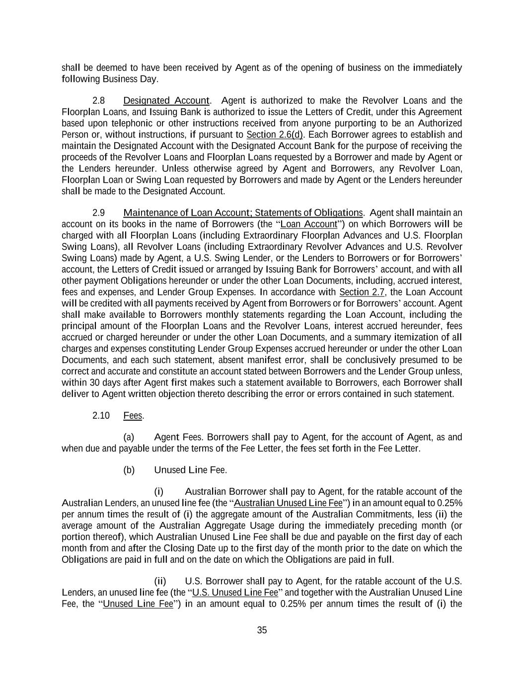35 shall be deemed to have been received by Agent as of the opening of business on the immediately following Business Day. 2.8 Designated Account. Agent is authorized to make the Revolver Loans and the Floorplan Loans, and Issuing Bank is authorized to issue the Letters of Credit, under this Agreement based upon telephonic or other instructions received from anyone purporting to be an Authorized Person or, without instructions, if pursuant to Section 2.6(d). Each Borrower agrees to establish and maintain the Designated Account with the Designated Account Bank for the purpose of receiving the proceeds of the Revolver Loans and Floorplan Loans requested by a Borrower and made by Agent or the Lenders hereunder. Unless otherwise agreed by Agent and Borrowers, any Revolver Loan, Floorplan Loan or Swing Loan requested by Borrowers and made by Agent or the Lenders hereunder shall be made to the Designated Account. 2.9 Maintenance of Loan Account; Statements of Obligations. Agent shall maintain an account on its books in the name of Borrowers (the “Loan Account”) on which Borrowers will be charged with all Floorplan Loans (including Extraordinary Floorplan Advances and U.S. Floorplan Swing Loans), all Revolver Loans (including Extraordinary Revolver Advances and U.S. Revolver Swing Loans) made by Agent, a U.S. Swing Lender, or the Lenders to Borrowers or for Borrowers’ account, the Letters of Credit issued or arranged by Issuing Bank for Borrowers’ account, and with all other payment Obligations hereunder or under the other Loan Documents, including, accrued interest, fees and expenses, and Lender Group Expenses. In accordance with Section 2.7, the Loan Account will be credited with all payments received by Agent from Borrowers or for Borrowers’ account. Agent shall make available to Borrowers monthly statements regarding the Loan Account, including the principal amount of the Floorplan Loans and the Revolver Loans, interest accrued hereunder, fees accrued or charged hereunder or under the other Loan Documents, and a summary itemization of all charges and expenses constituting Lender Group Expenses accrued hereunder or under the other Loan Documents, and each such statement, absent manifest error, shall be conclusively presumed to be correct and accurate and constitute an account stated between Borrowers and the Lender Group unless, within 30 days after Agent first makes such a statement available to Borrowers, each Borrower shall deliver to Agent written objection thereto describing the error or errors contained in such statement. 2.10 Fees. (a) Agent Fees. Borrowers shall pay to Agent, for the account of Agent, as and when due and payable under the terms of the Fee Letter, the fees set forth in the Fee Letter. (b) Unused Line Fee. (i) Australian Borrower shall pay to Agent, for the ratable account of the Australian Lenders, an unused line fee (the “Australian Unused Line Fee”) in an amount equal to 0.25% per annum times the result of (i) the aggregate amount of the Australian Commitments, less (ii) the average amount of the Australian Aggregate Usage during the immediately preceding month (or portion thereof), which Australian Unused Line Fee shall be due and payable on the first day of each month from and after the Closing Date up to the first day of the month prior to the date on which the Obligations are paid in full and on the date on which the Obligations are paid in full. (ii) U.S. Borrower shall pay to Agent, for the ratable account of the U.S. Lenders, an unused line fee (the “U.S. Unused Line Fee” and together with the Australian Unused Line Fee, the “Unused Line Fee”) in an amount equal to 0.25% per annum times the result of (i) the