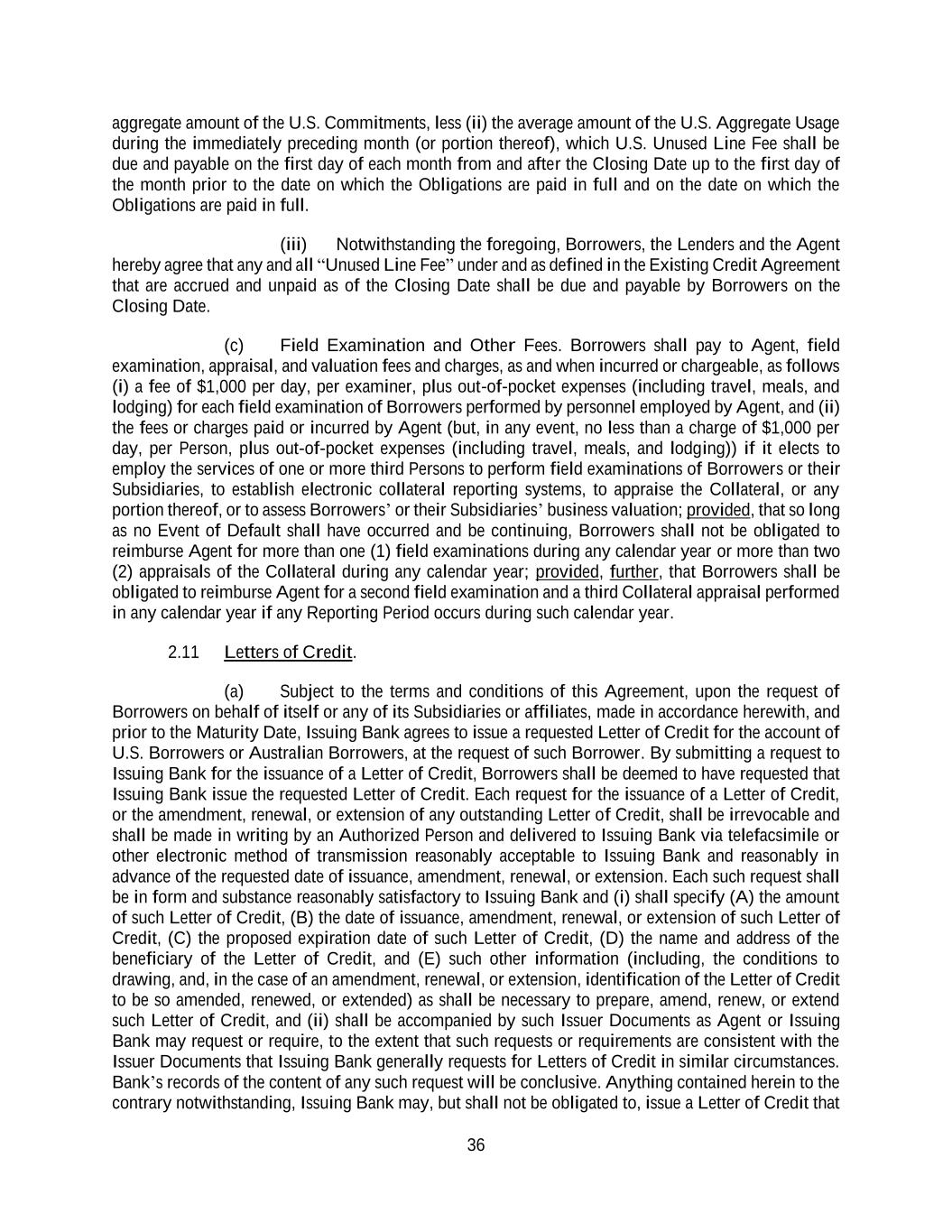 36 aggregate amount of the U.S. Commitments, less (ii) the average amount of the U.S. Aggregate Usage during the immediately preceding month (or portion thereof), which U.S. Unused Line Fee shall be due and payable on the first day of each month from and after the Closing Date up to the first day of the month prior to the date on which the Obligations are paid in full and on the date on which the Obligations are paid in full. (iii) Notwithstanding the foregoing, Borrowers, the Lenders and the Agent hereby agree that any and all “Unused Line Fee” under and as defined in the Existing Credit Agreement that are accrued and unpaid as of the Closing Date shall be due and payable by Borrowers on the Closing Date. (c) Field Examination and Other Fees. Borrowers shall pay to Agent, field examination, appraisal, and valuation fees and charges, as and when incurred or chargeable, as follows (i) a fee of $1,000 per day, per examiner, plus out-of-pocket expenses (including travel, meals, and lodging) for each field examination of Borrowers performed by personnel employed by Agent, and (ii) the fees or charges paid or incurred by Agent (but, in any event, no less than a charge of $1,000 per day, per Person, plus out-of-pocket expenses (including travel, meals, and lodging)) if it elects to employ the services of one or more third Persons to perform field examinations of Borrowers or their Subsidiaries, to establish electronic collateral reporting systems, to appraise the Collateral, or any portion thereof, or to assess Borrowers’ or their Subsidiaries’ business valuation; provided, that so long as no Event of Default shall have occurred and be continuing, Borrowers shall not be obligated to reimburse Agent for more than one (1) field examinations during any calendar year or more than two (2) appraisals of the Collateral during any calendar year; provided, further, that Borrowers shall be obligated to reimburse Agent for a second field examination and a third Collateral appraisal performed in any calendar year if any Reporting Period occurs during such calendar year. 2.11 Letters of Credit. (a) Subject to the terms and conditions of this Agreement, upon the request of Borrowers on behalf of itself or any of its Subsidiaries or affiliates, made in accordance herewith, and prior to the Maturity Date, Issuing Bank agrees to issue a requested Letter of Credit for the account of U.S. Borrowers or Australian Borrowers, at the request of such Borrower. By submitting a request to Issuing Bank for the issuance of a Letter of Credit, Borrowers shall be deemed to have requested that Issuing Bank issue the requested Letter of Credit. Each request for the issuance of a Letter of Credit, or the amendment, renewal, or extension of any outstanding Letter of Credit, shall be irrevocable and shall be made in writing by an Authorized Person and delivered to Issuing Bank via telefacsimile or other electronic method of transmission reasonably acceptable to Issuing Bank and reasonably in advance of the requested date of issuance, amendment, renewal, or extension. Each such request shall be in form and substance reasonably satisfactory to Issuing Bank and (i) shall specify (A) the amount of such Letter of Credit, (B) the date of issuance, amendment, renewal, or extension of such Letter of Credit, (C) the proposed expiration date of such Letter of Credit, (D) the name and address of the beneficiary of the Letter of Credit, and (E) such other information (including, the conditions to drawing, and, in the case of an amendment, renewal, or extension, identification of the Letter of Credit to be so amended, renewed, or extended) as shall be necessary to prepare, amend, renew, or extend such Letter of Credit, and (ii) shall be accompanied by such Issuer Documents as Agent or Issuing Bank may request or require, to the extent that such requests or requirements are consistent with the Issuer Documents that Issuing Bank generally requests for Letters of Credit in similar circumstances. Bank’s records of the content of any such request will be conclusive. Anything contained herein to the contrary notwithstanding, Issuing Bank may, but shall not be obligated to, issue a Letter of Credit that