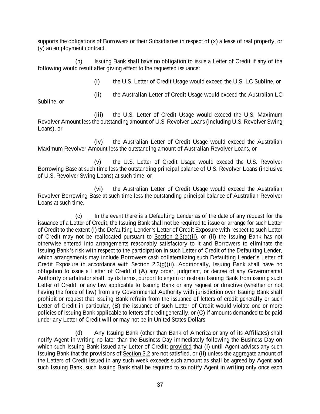 37 supports the obligations of Borrowers or their Subsidiaries in respect of (x) a lease of real property, or (y) an employment contract. (b) Issuing Bank shall have no obligation to issue a Letter of Credit if any of the following would result after giving effect to the requested issuance: (i) the U.S. Letter of Credit Usage would exceed the U.S. LC Subline, or (ii) the Australian Letter of Credit Usage would exceed the Australian LC Subline, or (iii) the U.S. Letter of Credit Usage would exceed the U.S. Maximum Revolver Amount less the outstanding amount of U.S. Revolver Loans (including U.S. Revolver Swing Loans), or (iv) the Australian Letter of Credit Usage would exceed the Australian Maximum Revolver Amount less the outstanding amount of Australian Revolver Loans, or (v) the U.S. Letter of Credit Usage would exceed the U.S. Revolver Borrowing Base at such time less the outstanding principal balance of U.S. Revolver Loans (inclusive of U.S. Revolver Swing Loans) at such time, or (vi) the Australian Letter of Credit Usage would exceed the Australian Revolver Borrowing Base at such time less the outstanding principal balance of Australian Revolver Loans at such time. (c) In the event there is a Defaulting Lender as of the date of any request for the issuance of a Letter of Credit, the Issuing Bank shall not be required to issue or arrange for such Letter of Credit to the extent (i) the Defaulting Lender’s Letter of Credit Exposure with respect to such Letter of Credit may not be reallocated pursuant to Section 2.3(g)(ii), or (ii) the Issuing Bank has not otherwise entered into arrangements reasonably satisfactory to it and Borrowers to eliminate the Issuing Bank’s risk with respect to the participation in such Letter of Credit of the Defaulting Lender, which arrangements may include Borrowers cash collateralizing such Defaulting Lender’s Letter of Credit Exposure in accordance with Section 2.3(g)(ii). Additionally, Issuing Bank shall have no obligation to issue a Letter of Credit if (A) any order, judgment, or decree of any Governmental Authority or arbitrator shall, by its terms, purport to enjoin or restrain Issuing Bank from issuing such Letter of Credit, or any law applicable to Issuing Bank or any request or directive (whether or not having the force of law) from any Governmental Authority with jurisdiction over Issuing Bank shall prohibit or request that Issuing Bank refrain from the issuance of letters of credit generally or such Letter of Credit in particular, (B) the issuance of such Letter of Credit would violate one or more policies of Issuing Bank applicable to letters of credit generally, or (C) if amounts demanded to be paid under any Letter of Credit will or may not be in United States Dollars. (d) Any Issuing Bank (other than Bank of America or any of its Affiliates) shall notify Agent in writing no later than the Business Day immediately following the Business Day on which such Issuing Bank issued any Letter of Credit; provided that (i) until Agent advises any such Issuing Bank that the provisions of Section 3.2 are not satisfied, or (ii) unless the aggregate amount of the Letters of Credit issued in any such week exceeds such amount as shall be agreed by Agent and such Issuing Bank, such Issuing Bank shall be required to so notify Agent in writing only once each