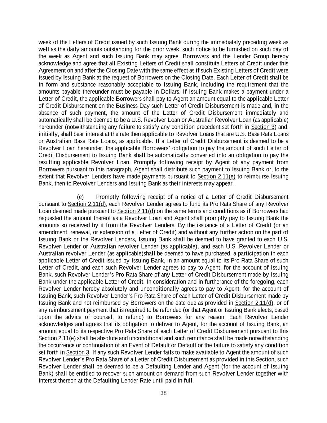 38 week of the Letters of Credit issued by such Issuing Bank during the immediately preceding week as well as the daily amounts outstanding for the prior week, such notice to be furnished on such day of the week as Agent and such Issuing Bank may agree. Borrowers and the Lender Group hereby acknowledge and agree that all Existing Letters of Credit shall constitute Letters of Credit under this Agreement on and after the Closing Date with the same effect as if such Existing Letters of Credit were issued by Issuing Bank at the request of Borrowers on the Closing Date. Each Letter of Credit shall be in form and substance reasonably acceptable to Issuing Bank, including the requirement that the amounts payable thereunder must be payable in Dollars. If Issuing Bank makes a payment under a Letter of Credit, the applicable Borrowers shall pay to Agent an amount equal to the applicable Letter of Credit Disbursement on the Business Day such Letter of Credit Disbursement is made and, in the absence of such payment, the amount of the Letter of Credit Disbursement immediately and automatically shall be deemed to be a U.S. Revolver Loan or Australian Revolver Loan (as applicable) hereunder (notwithstanding any failure to satisfy any condition precedent set forth in Section 3) and, initially, shall bear interest at the rate then applicable to Revolver Loans that are U.S. Base Rate Loans or Australian Base Rate Loans, as applicable. If a Letter of Credit Disbursement is deemed to be a Revolver Loan hereunder, the applicable Borrowers’ obligation to pay the amount of such Letter of Credit Disbursement to Issuing Bank shall be automatically converted into an obligation to pay the resulting applicable Revolver Loan. Promptly following receipt by Agent of any payment from Borrowers pursuant to this paragraph, Agent shall distribute such payment to Issuing Bank or, to the extent that Revolver Lenders have made payments pursuant to Section 2.11(e) to reimburse Issuing Bank, then to Revolver Lenders and Issuing Bank as their interests may appear. (e) Promptly following receipt of a notice of a Letter of Credit Disbursement pursuant to Section 2.11(d), each Revolver Lender agrees to fund its Pro Rata Share of any Revolver Loan deemed made pursuant to Section 2.11(d) on the same terms and conditions as if Borrowers had requested the amount thereof as a Revolver Loan and Agent shall promptly pay to Issuing Bank the amounts so received by it from the Revolver Lenders. By the issuance of a Letter of Credit (or an amendment, renewal, or extension of a Letter of Credit) and without any further action on the part of Issuing Bank or the Revolver Lenders, Issuing Bank shall be deemed to have granted to each U.S. Revolver Lender or Australian revolver Lender (as applicable), and each U.S. Revolver Lender or Australian revolver Lender (as applicable)shall be deemed to have purchased, a participation in each applicable Letter of Credit issued by Issuing Bank, in an amount equal to its Pro Rata Share of such Letter of Credit, and each such Revolver Lender agrees to pay to Agent, for the account of Issuing Bank, such Revolver Lender’s Pro Rata Share of any Letter of Credit Disbursement made by Issuing Bank under the applicable Letter of Credit. In consideration and in furtherance of the foregoing, each Revolver Lender hereby absolutely and unconditionally agrees to pay to Agent, for the account of Issuing Bank, such Revolver Lender’s Pro Rata Share of each Letter of Credit Disbursement made by Issuing Bank and not reimbursed by Borrowers on the date due as provided in Section 2.11(d), or of any reimbursement payment that is required to be refunded (or that Agent or Issuing Bank elects, based upon the advice of counsel, to refund) to Borrowers for any reason. Each Revolver Lender acknowledges and agrees that its obligation to deliver to Agent, for the account of Issuing Bank, an amount equal to its respective Pro Rata Share of each Letter of Credit Disbursement pursuant to this Section 2.11(e) shall be absolute and unconditional and such remittance shall be made notwithstanding the occurrence or continuation of an Event of Default or Default or the failure to satisfy any condition set forth in Section 3. If any such Revolver Lender fails to make available to Agent the amount of such Revolver Lender’s Pro Rata Share of a Letter of Credit Disbursement as provided in this Section, such Revolver Lender shall be deemed to be a Defaulting Lender and Agent (for the account of Issuing Bank) shall be entitled to recover such amount on demand from such Revolver Lender together with interest thereon at the Defaulting Lender Rate until paid in full.