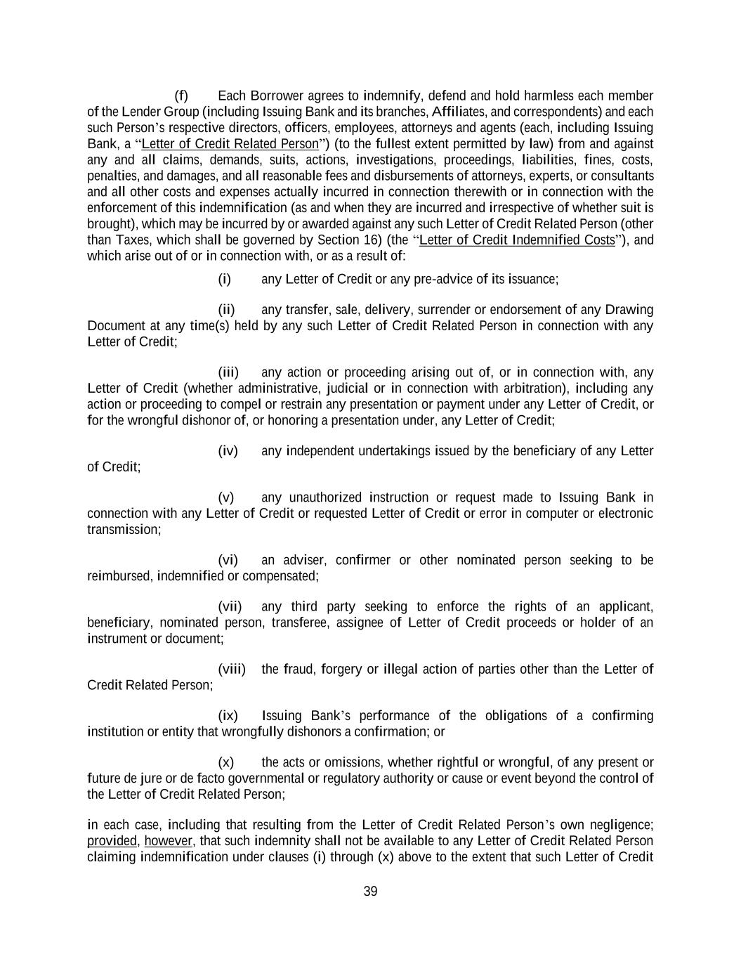 39 (f) Each Borrower agrees to indemnify, defend and hold harmless each member of the Lender Group (including Issuing Bank and its branches, Affiliates, and correspondents) and each such Person’s respective directors, officers, employees, attorneys and agents (each, including Issuing Bank, a “Letter of Credit Related Person”) (to the fullest extent permitted by law) from and against any and all claims, demands, suits, actions, investigations, proceedings, liabilities, fines, costs, penalties, and damages, and all reasonable fees and disbursements of attorneys, experts, or consultants and all other costs and expenses actually incurred in connection therewith or in connection with the enforcement of this indemnification (as and when they are incurred and irrespective of whether suit is brought), which may be incurred by or awarded against any such Letter of Credit Related Person (other than Taxes, which shall be governed by Section 16) (the “Letter of Credit Indemnified Costs”), and which arise out of or in connection with, or as a result of: (i) any Letter of Credit or any pre-advice of its issuance; (ii) any transfer, sale, delivery, surrender or endorsement of any Drawing Document at any time(s) held by any such Letter of Credit Related Person in connection with any Letter of Credit; (iii) any action or proceeding arising out of, or in connection with, any Letter of Credit (whether administrative, judicial or in connection with arbitration), including any action or proceeding to compel or restrain any presentation or payment under any Letter of Credit, or for the wrongful dishonor of, or honoring a presentation under, any Letter of Credit; (iv) any independent undertakings issued by the beneficiary of any Letter of Credit; (v) any unauthorized instruction or request made to Issuing Bank in connection with any Letter of Credit or requested Letter of Credit or error in computer or electronic transmission; (vi) an adviser, confirmer or other nominated person seeking to be reimbursed, indemnified or compensated; (vii) any third party seeking to enforce the rights of an applicant, beneficiary, nominated person, transferee, assignee of Letter of Credit proceeds or holder of an instrument or document; (viii) the fraud, forgery or illegal action of parties other than the Letter of Credit Related Person; (ix) Issuing Bank’s performance of the obligations of a confirming institution or entity that wrongfully dishonors a confirmation; or (x) the acts or omissions, whether rightful or wrongful, of any present or future de jure or de facto governmental or regulatory authority or cause or event beyond the control of the Letter of Credit Related Person; in each case, including that resulting from the Letter of Credit Related Person’s own negligence; provided, however, that such indemnity shall not be available to any Letter of Credit Related Person claiming indemnification under clauses (i) through (x) above to the extent that such Letter of Credit