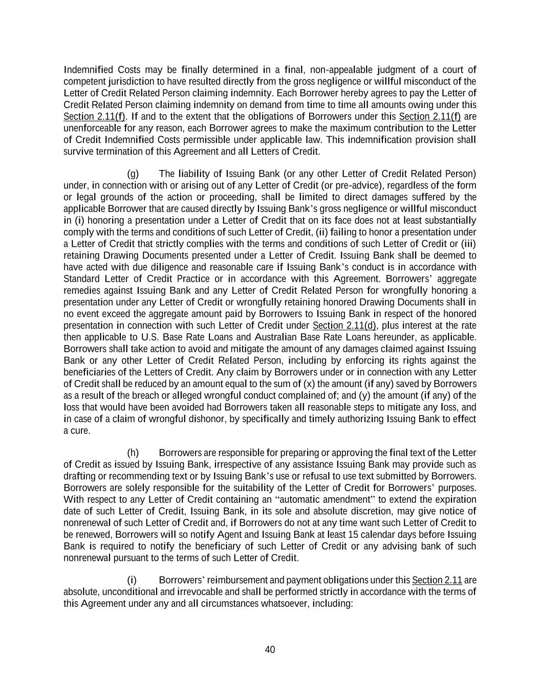 40 Indemnified Costs may be finally determined in a final, non-appealable judgment of a court of competent jurisdiction to have resulted directly from the gross negligence or willful misconduct of the Letter of Credit Related Person claiming indemnity. Each Borrower hereby agrees to pay the Letter of Credit Related Person claiming indemnity on demand from time to time all amounts owing under this Section 2.11(f). If and to the extent that the obligations of Borrowers under this Section 2.11(f) are unenforceable for any reason, each Borrower agrees to make the maximum contribution to the Letter of Credit Indemnified Costs permissible under applicable law. This indemnification provision shall survive termination of this Agreement and all Letters of Credit. (g) The liability of Issuing Bank (or any other Letter of Credit Related Person) under, in connection with or arising out of any Letter of Credit (or pre-advice), regardless of the form or legal grounds of the action or proceeding, shall be limited to direct damages suffered by the applicable Borrower that are caused directly by Issuing Bank’s gross negligence or willful misconduct in (i) honoring a presentation under a Letter of Credit that on its face does not at least substantially comply with the terms and conditions of such Letter of Credit, (ii) failing to honor a presentation under a Letter of Credit that strictly complies with the terms and conditions of such Letter of Credit or (iii) retaining Drawing Documents presented under a Letter of Credit. Issuing Bank shall be deemed to have acted with due diligence and reasonable care if Issuing Bank’s conduct is in accordance with Standard Letter of Credit Practice or in accordance with this Agreement. Borrowers’ aggregate remedies against Issuing Bank and any Letter of Credit Related Person for wrongfully honoring a presentation under any Letter of Credit or wrongfully retaining honored Drawing Documents shall in no event exceed the aggregate amount paid by Borrowers to Issuing Bank in respect of the honored presentation in connection with such Letter of Credit under Section 2.11(d), plus interest at the rate then applicable to U.S. Base Rate Loans and Australian Base Rate Loans hereunder, as applicable. Borrowers shall take action to avoid and mitigate the amount of any damages claimed against Issuing Bank or any other Letter of Credit Related Person, including by enforcing its rights against the beneficiaries of the Letters of Credit. Any claim by Borrowers under or in connection with any Letter of Credit shall be reduced by an amount equal to the sum of (x) the amount (if any) saved by Borrowers as a result of the breach or alleged wrongful conduct complained of; and (y) the amount (if any) of the loss that would have been avoided had Borrowers taken all reasonable steps to mitigate any loss, and in case of a claim of wrongful dishonor, by specifically and timely authorizing Issuing Bank to effect a cure. (h) Borrowers are responsible for preparing or approving the final text of the Letter of Credit as issued by Issuing Bank, irrespective of any assistance Issuing Bank may provide such as drafting or recommending text or by Issuing Bank’s use or refusal to use text submitted by Borrowers. Borrowers are solely responsible for the suitability of the Letter of Credit for Borrowers’ purposes. With respect to any Letter of Credit containing an “automatic amendment” to extend the expiration date of such Letter of Credit, Issuing Bank, in its sole and absolute discretion, may give notice of nonrenewal of such Letter of Credit and, if Borrowers do not at any time want such Letter of Credit to be renewed, Borrowers will so notify Agent and Issuing Bank at least 15 calendar days before Issuing Bank is required to notify the beneficiary of such Letter of Credit or any advising bank of such nonrenewal pursuant to the terms of such Letter of Credit. (i) Borrowers’ reimbursement and payment obligations under this Section 2.11 are absolute, unconditional and irrevocable and shall be performed strictly in accordance with the terms of this Agreement under any and all circumstances whatsoever, including:
