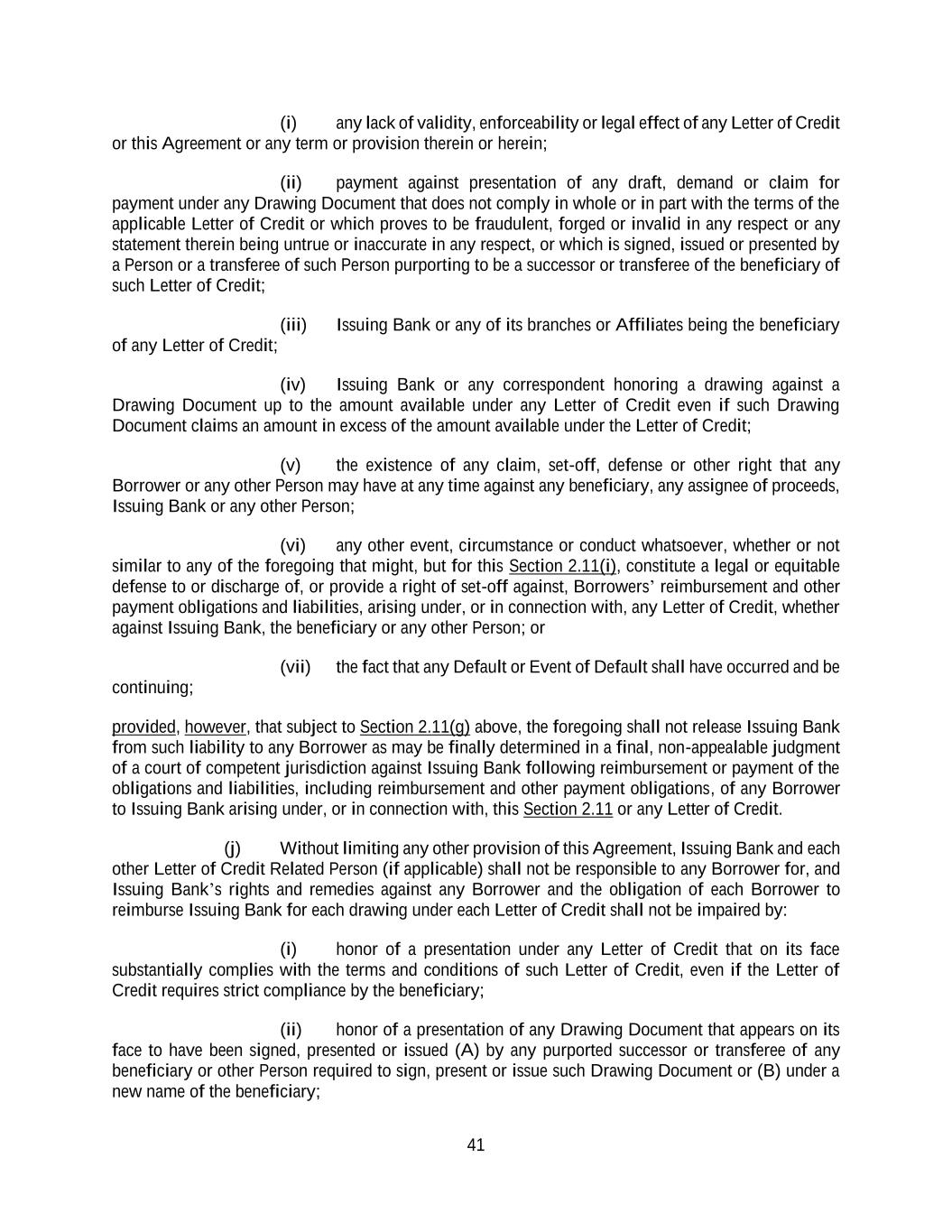 41 (i) any lack of validity, enforceability or legal effect of any Letter of Credit or this Agreement or any term or provision therein or herein; (ii) payment against presentation of any draft, demand or claim for payment under any Drawing Document that does not comply in whole or in part with the terms of the applicable Letter of Credit or which proves to be fraudulent, forged or invalid in any respect or any statement therein being untrue or inaccurate in any respect, or which is signed, issued or presented by a Person or a transferee of such Person purporting to be a successor or transferee of the beneficiary of such Letter of Credit; (iii) Issuing Bank or any of its branches or Affiliates being the beneficiary of any Letter of Credit; (iv) Issuing Bank or any correspondent honoring a drawing against a Drawing Document up to the amount available under any Letter of Credit even if such Drawing Document claims an amount in excess of the amount available under the Letter of Credit; (v) the existence of any claim, set-off, defense or other right that any Borrower or any other Person may have at any time against any beneficiary, any assignee of proceeds, Issuing Bank or any other Person; (vi) any other event, circumstance or conduct whatsoever, whether or not similar to any of the foregoing that might, but for this Section 2.11(i), constitute a legal or equitable defense to or discharge of, or provide a right of set-off against, Borrowers’ reimbursement and other payment obligations and liabilities, arising under, or in connection with, any Letter of Credit, whether against Issuing Bank, the beneficiary or any other Person; or (vii) the fact that any Default or Event of Default shall have occurred and be continuing; provided, however, that subject to Section 2.11(g) above, the foregoing shall not release Issuing Bank from such liability to any Borrower as may be finally determined in a final, non-appealable judgment of a court of competent jurisdiction against Issuing Bank following reimbursement or payment of the obligations and liabilities, including reimbursement and other payment obligations, of any Borrower to Issuing Bank arising under, or in connection with, this Section 2.11 or any Letter of Credit. (j) Without limiting any other provision of this Agreement, Issuing Bank and each other Letter of Credit Related Person (if applicable) shall not be responsible to any Borrower for, and Issuing Bank’s rights and remedies against any Borrower and the obligation of each Borrower to reimburse Issuing Bank for each drawing under each Letter of Credit shall not be impaired by: (i) honor of a presentation under any Letter of Credit that on its face substantially complies with the terms and conditions of such Letter of Credit, even if the Letter of Credit requires strict compliance by the beneficiary; (ii) honor of a presentation of any Drawing Document that appears on its face to have been signed, presented or issued (A) by any purported successor or transferee of any beneficiary or other Person required to sign, present or issue such Drawing Document or (B) under a new name of the beneficiary;