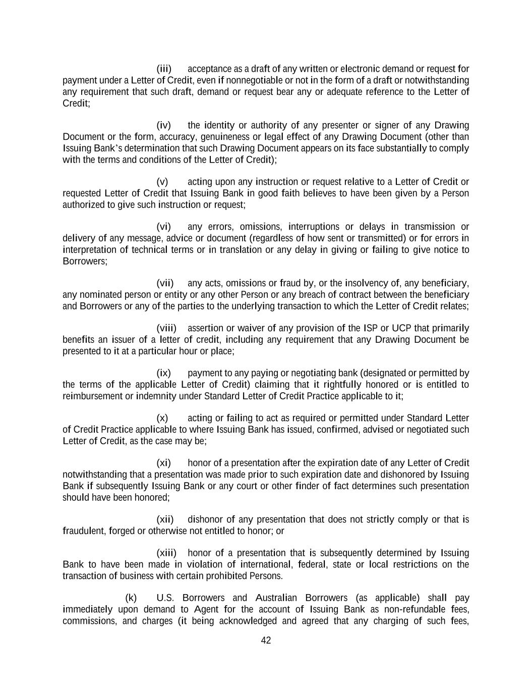 42 (iii) acceptance as a draft of any written or electronic demand or request for payment under a Letter of Credit, even if nonnegotiable or not in the form of a draft or notwithstanding any requirement that such draft, demand or request bear any or adequate reference to the Letter of Credit; (iv) the identity or authority of any presenter or signer of any Drawing Document or the form, accuracy, genuineness or legal effect of any Drawing Document (other than Issuing Bank’s determination that such Drawing Document appears on its face substantially to comply with the terms and conditions of the Letter of Credit); (v) acting upon any instruction or request relative to a Letter of Credit or requested Letter of Credit that Issuing Bank in good faith believes to have been given by a Person authorized to give such instruction or request; (vi) any errors, omissions, interruptions or delays in transmission or delivery of any message, advice or document (regardless of how sent or transmitted) or for errors in interpretation of technical terms or in translation or any delay in giving or failing to give notice to Borrowers; (vii) any acts, omissions or fraud by, or the insolvency of, any beneficiary, any nominated person or entity or any other Person or any breach of contract between the beneficiary and Borrowers or any of the parties to the underlying transaction to which the Letter of Credit relates; (viii) assertion or waiver of any provision of the ISP or UCP that primarily benefits an issuer of a letter of credit, including any requirement that any Drawing Document be presented to it at a particular hour or place; (ix) payment to any paying or negotiating bank (designated or permitted by the terms of the applicable Letter of Credit) claiming that it rightfully honored or is entitled to reimbursement or indemnity under Standard Letter of Credit Practice applicable to it; (x) acting or failing to act as required or permitted under Standard Letter of Credit Practice applicable to where Issuing Bank has issued, confirmed, advised or negotiated such Letter of Credit, as the case may be; (xi) honor of a presentation after the expiration date of any Letter of Credit notwithstanding that a presentation was made prior to such expiration date and dishonored by Issuing Bank if subsequently Issuing Bank or any court or other finder of fact determines such presentation should have been honored; (xii) dishonor of any presentation that does not strictly comply or that is fraudulent, forged or otherwise not entitled to honor; or (xiii) honor of a presentation that is subsequently determined by Issuing Bank to have been made in violation of international, federal, state or local restrictions on the transaction of business with certain prohibited Persons. (k) U.S. Borrowers and Australian Borrowers (as applicable) shall pay immediately upon demand to Agent for the account of Issuing Bank as non-refundable fees, commissions, and charges (it being acknowledged and agreed that any charging of such fees,