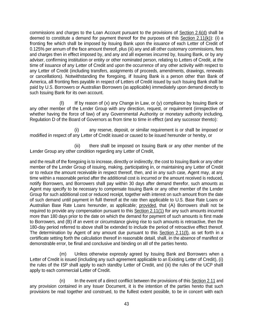 43 commissions and charges to the Loan Account pursuant to the provisions of Section 2.6(d) shall be deemed to constitute a demand for payment thereof for the purposes of this Section 2.11(k)): (i) a fronting fee which shall be imposed by Issuing Bank upon the issuance of each Letter of Credit of 0.125% per annum of the face amount thereof, plus (ii) any and all other customary commissions, fees and charges then in effect imposed by, and any and all expenses incurred by, Issuing Bank, or by any adviser, confirming institution or entity or other nominated person, relating to Letters of Credit, at the time of issuance of any Letter of Credit and upon the occurrence of any other activity with respect to any Letter of Credit (including transfers, assignments of proceeds, amendments, drawings, renewals or cancellations). Notwithstanding the foregoing, if Issuing Bank is a person other than Bank of America, all fronting fees payable in respect of Letters of Credit issued by such Issuing Bank shall be paid by U.S. Borrowers or Australian Borrowers (as applicable) immediately upon demand directly to such Issuing Bank for its own account. (l) If by reason of (x) any Change in Law, or (y) compliance by Issuing Bank or any other member of the Lender Group with any direction, request, or requirement (irrespective of whether having the force of law) of any Governmental Authority or monetary authority including, Regulation D of the Board of Governors as from time to time in effect (and any successor thereto): (i) any reserve, deposit, or similar requirement is or shall be imposed or modified in respect of any Letter of Credit issued or caused to be issued hereunder or hereby, or (ii) there shall be imposed on Issuing Bank or any other member of the Lender Group any other condition regarding any Letter of Credit, and the result of the foregoing is to increase, directly or indirectly, the cost to Issuing Bank or any other member of the Lender Group of issuing, making, participating in, or maintaining any Letter of Credit or to reduce the amount receivable in respect thereof, then, and in any such case, Agent may, at any time within a reasonable period after the additional cost is incurred or the amount received is reduced, notify Borrowers, and Borrowers shall pay within 30 days after demand therefor, such amounts as Agent may specify to be necessary to compensate Issuing Bank or any other member of the Lender Group for such additional cost or reduced receipt, together with interest on such amount from the date of such demand until payment in full thereof at the rate then applicable to U.S. Base Rate Loans or Australian Base Rate Loans hereunder, as applicable; provided, that (A) Borrowers shall not be required to provide any compensation pursuant to this Section 2.11(1) for any such amounts incurred more than 180 days prior to the date on which the demand for payment of such amounts is first made to Borrowers, and (B) if an event or circumstance giving rise to such amounts is retroactive, then the 180-day period referred to above shall be extended to include the period of retroactive effect thereof. The determination by Agent of any amount due pursuant to this Section 2.11(l), as set forth in a certificate setting forth the calculation thereof in reasonable detail, shall, in the absence of manifest or demonstrable error, be final and conclusive and binding on all of the parties hereto. (m) Unless otherwise expressly agreed by Issuing Bank and Borrowers when a Letter of Credit is issued (including any such agreement applicable to an Existing Letter of Credit), (i) the rules of the ISP shall apply to each standby Letter of Credit, and (ii) the rules of the UCP shall apply to each commercial Letter of Credit. (n) In the event of a direct conflict between the provisions of this Section 2.11 and any provision contained in any Issuer Document, it is the intention of the parties hereto that such provisions be read together and construed, to the fullest extent possible, to be in concert with each