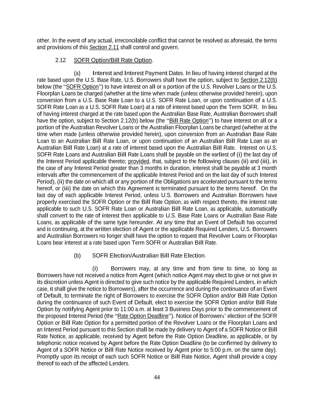 44 other. In the event of any actual, irreconcilable conflict that cannot be resolved as aforesaid, the terms and provisions of this Section 2.11 shall control and govern. 2.12 SOFR Option/Bill Rate Option. (a) Interest and Interest Payment Dates. In lieu of having interest charged at the rate based upon the U.S. Base Rate, U.S. Borrowers shall have the option, subject to Section 2.12(b) below (the “SOFR Option”) to have interest on all or a portion of the U.S. Revolver Loans or the U.S. Floorplan Loans be charged (whether at the time when made (unless otherwise provided herein), upon conversion from a U.S. Base Rate Loan to a U.S. SOFR Rate Loan, or upon continuation of a U.S. SOFR Rate Loan as a U.S. SOFR Rate Loan) at a rate of interest based upon the Term SOFR. In lieu of having interest charged at the rate based upon the Australian Base Rate, Australian Borrowers shall have the option, subject to Section 2.12(b) below (the “Bill Rate Option”) to have interest on all or a portion of the Australian Revolver Loans or the Australian Floorplan Loans be charged (whether at the time when made (unless otherwise provided herein), upon conversion from an Australian Base Rate Loan to an Australian Bill Rate Loan, or upon continuation of an Australian Bill Rate Loan as an Australian Bill Rate Loan) at a rate of interest based upon the Australian Bill Rate. Interest on U.S. SOFR Rate Loans and Australian Bill Rate Loans shall be payable on the earliest of (i) the last day of the Interest Period applicable thereto; provided, that, subject to the following clauses (ii) and (iii), in the case of any Interest Period greater than 3 months in duration, interest shall be payable at 3 month intervals after the commencement of the applicable Interest Period and on the last day of such Interest Period), (ii) the date on which all or any portion of the Obligations are accelerated pursuant to the terms hereof, or (iii) the date on which this Agreement is terminated pursuant to the terms hereof. On the last day of each applicable Interest Period, unless U.S. Borrowers and Australian Borrowers have properly exercised the SOFR Option or the Bill Rate Option, as with respect thereto, the interest rate applicable to such U.S. SOFR Rate Loan or Australian Bill Rate Loan, as applicable, automatically shall convert to the rate of interest then applicable to U.S. Base Rate Loans or Australian Base Rate Loans, as applicable of the same type hereunder. At any time that an Event of Default has occurred and is continuing, at the written election of Agent or the applicable Required Lenders, U.S. Borrowers and Australian Borrowers no longer shall have the option to request that Revolver Loans or Floorplan Loans bear interest at a rate based upon Term SOFR or Australian Bill Rate. (b) SOFR Election/Australian Bill Rate Election. (i) Borrowers may, at any time and from time to time, so long as Borrowers have not received a notice from Agent (which notice Agent may elect to give or not give in its discretion unless Agent is directed to give such notice by the applicable Required Lenders, in which case, it shall give the notice to Borrowers), after the occurrence and during the continuance of an Event of Default, to terminate the right of Borrowers to exercise the SOFR Option and/or Bill Rate Option during the continuance of such Event of Default, elect to exercise the SOFR Option and/or Bill Rate Option by notifying Agent prior to 11:00 a.m. at least 3 Business Days prior to the commencement of the proposed Interest Period (the “Rate Option Deadline”). Notice of Borrowers’ election of the SOFR Option or Bill Rate Option for a permitted portion of the Revolver Loans or the Floorplan Loans and an Interest Period pursuant to this Section shall be made by delivery to Agent of a SOFR Notice or Bill Rate Notice, as applicable, received by Agent before the Rate Option Deadline, as applicable, or by telephonic notice received by Agent before the Rate Option Deadline (to be confirmed by delivery to Agent of a SOFR Notice or Bill Rate Notice received by Agent prior to 5:00 p.m. on the same day). Promptly upon its receipt of each such SOFR Notice or Bill Rate Notice, Agent shall provide a copy thereof to each of the affected Lenders.