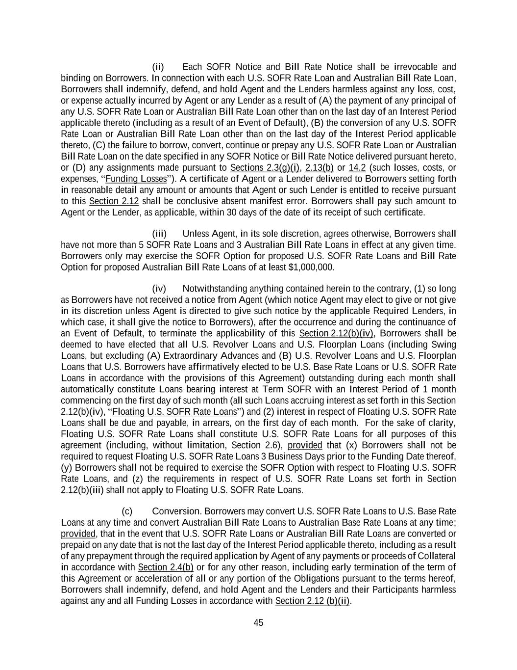 45 (ii) Each SOFR Notice and Bill Rate Notice shall be irrevocable and binding on Borrowers. In connection with each U.S. SOFR Rate Loan and Australian Bill Rate Loan, Borrowers shall indemnify, defend, and hold Agent and the Lenders harmless against any loss, cost, or expense actually incurred by Agent or any Lender as a result of (A) the payment of any principal of any U.S. SOFR Rate Loan or Australian Bill Rate Loan other than on the last day of an Interest Period applicable thereto (including as a result of an Event of Default), (B) the conversion of any U.S. SOFR Rate Loan or Australian Bill Rate Loan other than on the last day of the Interest Period applicable thereto, (C) the failure to borrow, convert, continue or prepay any U.S. SOFR Rate Loan or Australian Bill Rate Loan on the date specified in any SOFR Notice or Bill Rate Notice delivered pursuant hereto, or (D) any assignments made pursuant to Sections 2.3(g)(i), 2.13(b) or 14.2 (such losses, costs, or expenses, “Funding Losses”). A certificate of Agent or a Lender delivered to Borrowers setting forth in reasonable detail any amount or amounts that Agent or such Lender is entitled to receive pursuant to this Section 2.12 shall be conclusive absent manifest error. Borrowers shall pay such amount to Agent or the Lender, as applicable, within 30 days of the date of its receipt of such certificate. (iii) Unless Agent, in its sole discretion, agrees otherwise, Borrowers shall have not more than 5 SOFR Rate Loans and 3 Australian Bill Rate Loans in effect at any given time. Borrowers only may exercise the SOFR Option for proposed U.S. SOFR Rate Loans and Bill Rate Option for proposed Australian Bill Rate Loans of at least $1,000,000. (iv) Notwithstanding anything contained herein to the contrary, (1) so long as Borrowers have not received a notice from Agent (which notice Agent may elect to give or not give in its discretion unless Agent is directed to give such notice by the applicable Required Lenders, in which case, it shall give the notice to Borrowers), after the occurrence and during the continuance of an Event of Default, to terminate the applicability of this Section 2.12(b)(iv), Borrowers shall be deemed to have elected that all U.S. Revolver Loans and U.S. Floorplan Loans (including Swing Loans, but excluding (A) Extraordinary Advances and (B) U.S. Revolver Loans and U.S. Floorplan Loans that U.S. Borrowers have affirmatively elected to be U.S. Base Rate Loans or U.S. SOFR Rate Loans in accordance with the provisions of this Agreement) outstanding during each month shall automatically constitute Loans bearing interest at Term SOFR with an Interest Period of 1 month commencing on the first day of such month (all such Loans accruing interest as set forth in this Section 2.12(b)(iv), “Floating U.S. SOFR Rate Loans”) and (2) interest in respect of Floating U.S. SOFR Rate Loans shall be due and payable, in arrears, on the first day of each month. For the sake of clarity, Floating U.S. SOFR Rate Loans shall constitute U.S. SOFR Rate Loans for all purposes of this agreement (including, without limitation, Section 2.6), provided that (x) Borrowers shall not be required to request Floating U.S. SOFR Rate Loans 3 Business Days prior to the Funding Date thereof, (y) Borrowers shall not be required to exercise the SOFR Option with respect to Floating U.S. SOFR Rate Loans, and (z) the requirements in respect of U.S. SOFR Rate Loans set forth in Section 2.12(b)(iii) shall not apply to Floating U.S. SOFR Rate Loans. (c) Conversion. Borrowers may convert U.S. SOFR Rate Loans to U.S. Base Rate Loans at any time and convert Australian Bill Rate Loans to Australian Base Rate Loans at any time; provided, that in the event that U.S. SOFR Rate Loans or Australian Bill Rate Loans are converted or prepaid on any date that is not the last day of the Interest Period applicable thereto, including as a result of any prepayment through the required application by Agent of any payments or proceeds of Collateral in accordance with Section 2.4(b) or for any other reason, including early termination of the term of this Agreement or acceleration of all or any portion of the Obligations pursuant to the terms hereof, Borrowers shall indemnify, defend, and hold Agent and the Lenders and their Participants harmless against any and all Funding Losses in accordance with Section 2.12 (b)(ii).