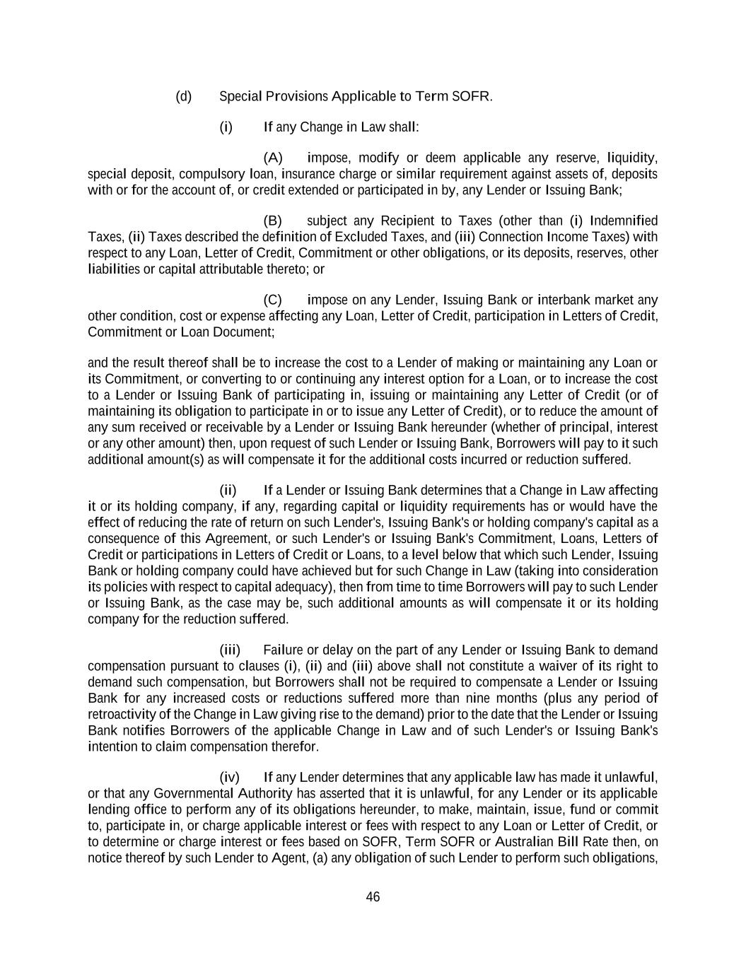 46 (d) Special Provisions Applicable to Term SOFR. (i) If any Change in Law shall: (A) impose, modify or deem applicable any reserve, liquidity, special deposit, compulsory loan, insurance charge or similar requirement against assets of, deposits with or for the account of, or credit extended or participated in by, any Lender or Issuing Bank; (B) subject any Recipient to Taxes (other than (i) Indemnified Taxes, (ii) Taxes described the definition of Excluded Taxes, and (iii) Connection Income Taxes) with respect to any Loan, Letter of Credit, Commitment or other obligations, or its deposits, reserves, other liabilities or capital attributable thereto; or (C) impose on any Lender, Issuing Bank or interbank market any other condition, cost or expense affecting any Loan, Letter of Credit, participation in Letters of Credit, Commitment or Loan Document; and the result thereof shall be to increase the cost to a Lender of making or maintaining any Loan or its Commitment, or converting to or continuing any interest option for a Loan, or to increase the cost to a Lender or Issuing Bank of participating in, issuing or maintaining any Letter of Credit (or of maintaining its obligation to participate in or to issue any Letter of Credit), or to reduce the amount of any sum received or receivable by a Lender or Issuing Bank hereunder (whether of principal, interest or any other amount) then, upon request of such Lender or Issuing Bank, Borrowers will pay to it such additional amount(s) as will compensate it for the additional costs incurred or reduction suffered. (ii) If a Lender or Issuing Bank determines that a Change in Law affecting it or its holding company, if any, regarding capital or liquidity requirements has or would have the effect of reducing the rate of return on such Lender's, Issuing Bank's or holding company's capital as a consequence of this Agreement, or such Lender's or Issuing Bank's Commitment, Loans, Letters of Credit or participations in Letters of Credit or Loans, to a level below that which such Lender, Issuing Bank or holding company could have achieved but for such Change in Law (taking into consideration its policies with respect to capital adequacy), then from time to time Borrowers will pay to such Lender or Issuing Bank, as the case may be, such additional amounts as will compensate it or its holding company for the reduction suffered. (iii) Failure or delay on the part of any Lender or Issuing Bank to demand compensation pursuant to clauses (i), (ii) and (iii) above shall not constitute a waiver of its right to demand such compensation, but Borrowers shall not be required to compensate a Lender or Issuing Bank for any increased costs or reductions suffered more than nine months (plus any period of retroactivity of the Change in Law giving rise to the demand) prior to the date that the Lender or Issuing Bank notifies Borrowers of the applicable Change in Law and of such Lender's or Issuing Bank's intention to claim compensation therefor. (iv) If any Lender determines that any applicable law has made it unlawful, or that any Governmental Authority has asserted that it is unlawful, for any Lender or its applicable lending office to perform any of its obligations hereunder, to make, maintain, issue, fund or commit to, participate in, or charge applicable interest or fees with respect to any Loan or Letter of Credit, or to determine or charge interest or fees based on SOFR, Term SOFR or Australian Bill Rate then, on notice thereof by such Lender to Agent, (a) any obligation of such Lender to perform such obligations,