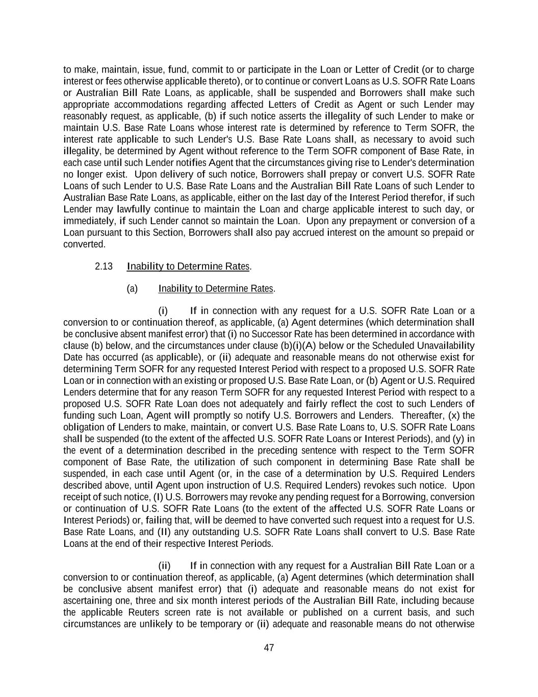 47 to make, maintain, issue, fund, commit to or participate in the Loan or Letter of Credit (or to charge interest or fees otherwise applicable thereto), or to continue or convert Loans as U.S. SOFR Rate Loans or Australian Bill Rate Loans, as applicable, shall be suspended and Borrowers shall make such appropriate accommodations regarding affected Letters of Credit as Agent or such Lender may reasonably request, as applicable, (b) if such notice asserts the illegality of such Lender to make or maintain U.S. Base Rate Loans whose interest rate is determined by reference to Term SOFR, the interest rate applicable to such Lender's U.S. Base Rate Loans shall, as necessary to avoid such illegality, be determined by Agent without reference to the Term SOFR component of Base Rate, in each case until such Lender notifies Agent that the circumstances giving rise to Lender's determination no longer exist. Upon delivery of such notice, Borrowers shall prepay or convert U.S. SOFR Rate Loans of such Lender to U.S. Base Rate Loans and the Australian Bill Rate Loans of such Lender to Australian Base Rate Loans, as applicable, either on the last day of the Interest Period therefor, if such Lender may lawfully continue to maintain the Loan and charge applicable interest to such day, or immediately, if such Lender cannot so maintain the Loan. Upon any prepayment or conversion of a Loan pursuant to this Section, Borrowers shall also pay accrued interest on the amount so prepaid or converted. 2.13 Inability to Determine Rates. (a) Inability to Determine Rates. (i) If in connection with any request for a U.S. SOFR Rate Loan or a conversion to or continuation thereof, as applicable, (a) Agent determines (which determination shall be conclusive absent manifest error) that (i) no Successor Rate has been determined in accordance with clause (b) below, and the circumstances under clause (b)(i)(A) below or the Scheduled Unavailability Date has occurred (as applicable), or (ii) adequate and reasonable means do not otherwise exist for determining Term SOFR for any requested Interest Period with respect to a proposed U.S. SOFR Rate Loan or in connection with an existing or proposed U.S. Base Rate Loan, or (b) Agent or U.S. Required Lenders determine that for any reason Term SOFR for any requested Interest Period with respect to a proposed U.S. SOFR Rate Loan does not adequately and fairly reflect the cost to such Lenders of funding such Loan, Agent will promptly so notify U.S. Borrowers and Lenders. Thereafter, (x) the obligation of Lenders to make, maintain, or convert U.S. Base Rate Loans to, U.S. SOFR Rate Loans shall be suspended (to the extent of the affected U.S. SOFR Rate Loans or Interest Periods), and (y) in the event of a determination described in the preceding sentence with respect to the Term SOFR component of Base Rate, the utilization of such component in determining Base Rate shall be suspended, in each case until Agent (or, in the case of a determination by U.S. Required Lenders described above, until Agent upon instruction of U.S. Required Lenders) revokes such notice. Upon receipt of such notice, (I) U.S. Borrowers may revoke any pending request for a Borrowing, conversion or continuation of U.S. SOFR Rate Loans (to the extent of the affected U.S. SOFR Rate Loans or Interest Periods) or, failing that, will be deemed to have converted such request into a request for U.S. Base Rate Loans, and (II) any outstanding U.S. SOFR Rate Loans shall convert to U.S. Base Rate Loans at the end of their respective Interest Periods. (ii) If in connection with any request for a Australian Bill Rate Loan or a conversion to or continuation thereof, as applicable, (a) Agent determines (which determination shall be conclusive absent manifest error) that (i) adequate and reasonable means do not exist for ascertaining one, three and six month interest periods of the Australian Bill Rate, including because the applicable Reuters screen rate is not available or published on a current basis, and such circumstances are unlikely to be temporary or (ii) adequate and reasonable means do not otherwise