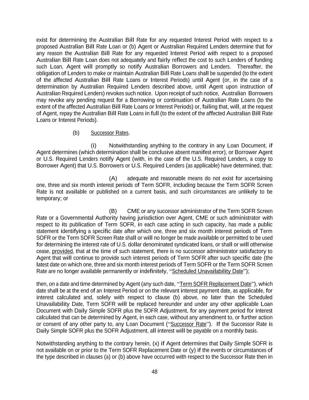 48 exist for determining the Australian Bill Rate for any requested Interest Period with respect to a proposed Australian Bill Rate Loan or (b) Agent or Australian Required Lenders determine that for any reason the Australian Bill Rate for any requested Interest Period with respect to a proposed Australian Bill Rate Loan does not adequately and fairly reflect the cost to such Lenders of funding such Loan, Agent will promptly so notify Australian Borrowers and Lenders. Thereafter, the obligation of Lenders to make or maintain Australian Bill Rate Loans shall be suspended (to the extent of the affected Australian Bill Rate Loans or Interest Periods) until Agent (or, in the case of a determination by Australian Required Lenders described above, until Agent upon instruction of Australian Required Lenders) revokes such notice. Upon receipt of such notice, Australian Borrowers may revoke any pending request for a Borrowing or continuation of Australian Rate Loans (to the extent of the affected Australian Bill Rate Loans or Interest Periods) or, failing that, will, at the request of Agent, repay the Australian Bill Rate Loans in full (to the extent of the affected Australian Bill Rate Loans or Interest Periods). (b) Successor Rates. (i) Notwithstanding anything to the contrary in any Loan Document, if Agent determines (which determination shall be conclusive absent manifest error), or Borrower Agent or U.S. Required Lenders notify Agent (with, in the case of the U.S. Required Lenders, a copy to Borrower Agent) that U.S. Borrowers or U.S. Required Lenders (as applicable) have determined, that: (A) adequate and reasonable means do not exist for ascertaining one, three and six month interest periods of Term SOFR, including because the Term SOFR Screen Rate is not available or published on a current basis, and such circumstances are unlikely to be temporary; or (B) CME or any successor administrator of the Term SOFR Screen Rate or a Governmental Authority having jurisdiction over Agent, CME or such administrator with respect to its publication of Term SOFR, in each case acting in such capacity, has made a public statement identifying a specific date after which one, three and six month interest periods of Term SOFR or the Term SOFR Screen Rate shall or will no longer be made available or permitted to be used for determining the interest rate of U.S. dollar denominated syndicated loans, or shall or will otherwise cease, provided, that at the time of such statement, there is no successor administrator satisfactory to Agent that will continue to provide such interest periods of Term SOFR after such specific date (the latest date on which one, three and six month interest periods of Term SOFR or the Term SOFR Screen Rate are no longer available permanently or indefinitely, “Scheduled Unavailability Date”); then, on a date and time determined by Agent (any such date, “Term SOFR Replacement Date”), which date shall be at the end of an Interest Period or on the relevant interest payment date, as applicable, for interest calculated and, solely with respect to clause (b) above, no later than the Scheduled Unavailability Date, Term SOFR will be replaced hereunder and under any other applicable Loan Document with Daily Simple SOFR plus the SOFR Adjustment, for any payment period for interest calculated that can be determined by Agent, in each case, without any amendment to, or further action or consent of any other party to, any Loan Document (“Successor Rate”). If the Successor Rate is Daily Simple SOFR plus the SOFR Adjustment, all interest will be payable on a monthly basis. Notwithstanding anything to the contrary herein, (x) if Agent determines that Daily Simple SOFR is not available on or prior to the Term SOFR Replacement Date or (y) if the events or circumstances of the type described in clauses (a) or (b) above have occurred with respect to the Successor Rate then in