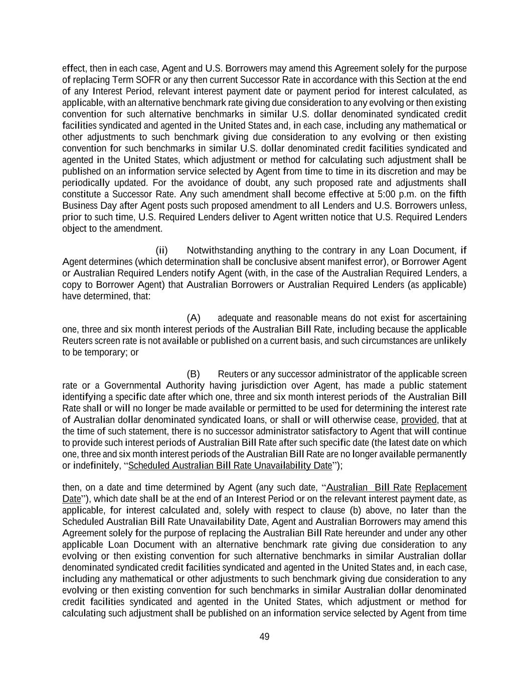 49 effect, then in each case, Agent and U.S. Borrowers may amend this Agreement solely for the purpose of replacing Term SOFR or any then current Successor Rate in accordance with this Section at the end of any Interest Period, relevant interest payment date or payment period for interest calculated, as applicable, with an alternative benchmark rate giving due consideration to any evolving or then existing convention for such alternative benchmarks in similar U.S. dollar denominated syndicated credit facilities syndicated and agented in the United States and, in each case, including any mathematical or other adjustments to such benchmark giving due consideration to any evolving or then existing convention for such benchmarks in similar U.S. dollar denominated credit facilities syndicated and agented in the United States, which adjustment or method for calculating such adjustment shall be published on an information service selected by Agent from time to time in its discretion and may be periodically updated. For the avoidance of doubt, any such proposed rate and adjustments shall constitute a Successor Rate. Any such amendment shall become effective at 5:00 p.m. on the fifth Business Day after Agent posts such proposed amendment to all Lenders and U.S. Borrowers unless, prior to such time, U.S. Required Lenders deliver to Agent written notice that U.S. Required Lenders object to the amendment. (ii) Notwithstanding anything to the contrary in any Loan Document, if Agent determines (which determination shall be conclusive absent manifest error), or Borrower Agent or Australian Required Lenders notify Agent (with, in the case of the Australian Required Lenders, a copy to Borrower Agent) that Australian Borrowers or Australian Required Lenders (as applicable) have determined, that: (A) adequate and reasonable means do not exist for ascertaining one, three and six month interest periods of the Australian Bill Rate, including because the applicable Reuters screen rate is not available or published on a current basis, and such circumstances are unlikely to be temporary; or (B) Reuters or any successor administrator of the applicable screen rate or a Governmental Authority having jurisdiction over Agent, has made a public statement identifying a specific date after which one, three and six month interest periods of the Australian Bill Rate shall or will no longer be made available or permitted to be used for determining the interest rate of Australian dollar denominated syndicated loans, or shall or will otherwise cease, provided, that at the time of such statement, there is no successor administrator satisfactory to Agent that will continue to provide such interest periods of Australian Bill Rate after such specific date (the latest date on which one, three and six month interest periods of the Australian Bill Rate are no longer available permanently or indefinitely, “Scheduled Australian Bill Rate Unavailability Date”); then, on a date and time determined by Agent (any such date, “Australian Bill Rate Replacement Date”), which date shall be at the end of an Interest Period or on the relevant interest payment date, as applicable, for interest calculated and, solely with respect to clause (b) above, no later than the Scheduled Australian Bill Rate Unavailability Date, Agent and Australian Borrowers may amend this Agreement solely for the purpose of replacing the Australian Bill Rate hereunder and under any other applicable Loan Document with an alternative benchmark rate giving due consideration to any evolving or then existing convention for such alternative benchmarks in similar Australian dollar denominated syndicated credit facilities syndicated and agented in the United States and, in each case, including any mathematical or other adjustments to such benchmark giving due consideration to any evolving or then existing convention for such benchmarks in similar Australian dollar denominated credit facilities syndicated and agented in the United States, which adjustment or method for calculating such adjustment shall be published on an information service selected by Agent from time