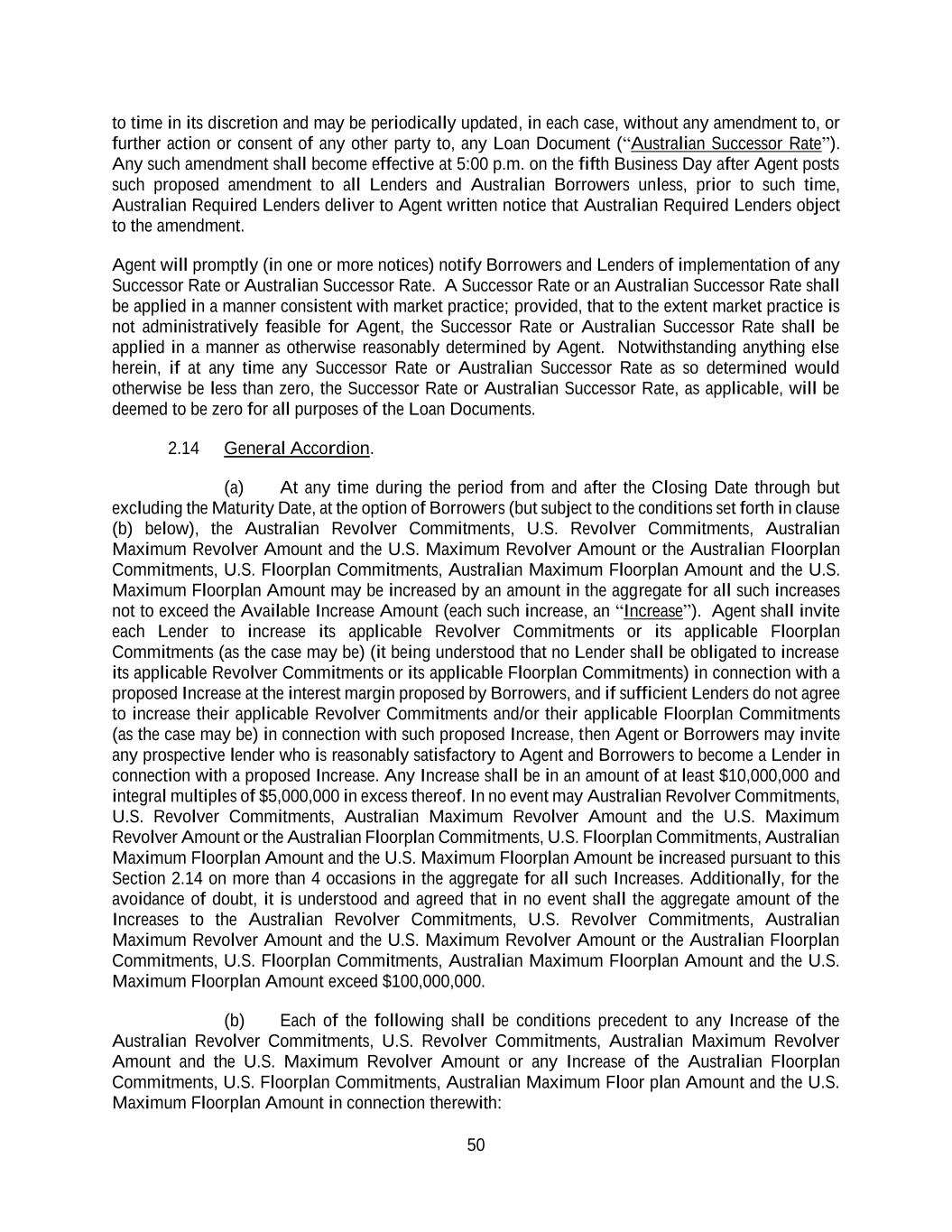 50 to time in its discretion and may be periodically updated, in each case, without any amendment to, or further action or consent of any other party to, any Loan Document (“Australian Successor Rate”). Any such amendment shall become effective at 5:00 p.m. on the fifth Business Day after Agent posts such proposed amendment to all Lenders and Australian Borrowers unless, prior to such time, Australian Required Lenders deliver to Agent written notice that Australian Required Lenders object to the amendment. Agent will promptly (in one or more notices) notify Borrowers and Lenders of implementation of any Successor Rate or Australian Successor Rate. A Successor Rate or an Australian Successor Rate shall be applied in a manner consistent with market practice; provided, that to the extent market practice is not administratively feasible for Agent, the Successor Rate or Australian Successor Rate shall be applied in a manner as otherwise reasonably determined by Agent. Notwithstanding anything else herein, if at any time any Successor Rate or Australian Successor Rate as so determined would otherwise be less than zero, the Successor Rate or Australian Successor Rate, as applicable, will be deemed to be zero for all purposes of the Loan Documents. 2.14 General Accordion. (a) At any time during the period from and after the Closing Date through but excluding the Maturity Date, at the option of Borrowers (but subject to the conditions set forth in clause (b) below), the Australian Revolver Commitments, U.S. Revolver Commitments, Australian Maximum Revolver Amount and the U.S. Maximum Revolver Amount or the Australian Floorplan Commitments, U.S. Floorplan Commitments, Australian Maximum Floorplan Amount and the U.S. Maximum Floorplan Amount may be increased by an amount in the aggregate for all such increases not to exceed the Available Increase Amount (each such increase, an “Increase”). Agent shall invite each Lender to increase its applicable Revolver Commitments or its applicable Floorplan Commitments (as the case may be) (it being understood that no Lender shall be obligated to increase its applicable Revolver Commitments or its applicable Floorplan Commitments) in connection with a proposed Increase at the interest margin proposed by Borrowers, and if sufficient Lenders do not agree to increase their applicable Revolver Commitments and/or their applicable Floorplan Commitments (as the case may be) in connection with such proposed Increase, then Agent or Borrowers may invite any prospective lender who is reasonably satisfactory to Agent and Borrowers to become a Lender in connection with a proposed Increase. Any Increase shall be in an amount of at least $10,000,000 and integral multiples of $5,000,000 in excess thereof. In no event may Australian Revolver Commitments, U.S. Revolver Commitments, Australian Maximum Revolver Amount and the U.S. Maximum Revolver Amount or the Australian Floorplan Commitments, U.S. Floorplan Commitments, Australian Maximum Floorplan Amount and the U.S. Maximum Floorplan Amount be increased pursuant to this Section 2.14 on more than 4 occasions in the aggregate for all such Increases. Additionally, for the avoidance of doubt, it is understood and agreed that in no event shall the aggregate amount of the Increases to the Australian Revolver Commitments, U.S. Revolver Commitments, Australian Maximum Revolver Amount and the U.S. Maximum Revolver Amount or the Australian Floorplan Commitments, U.S. Floorplan Commitments, Australian Maximum Floorplan Amount and the U.S. Maximum Floorplan Amount exceed $100,000,000. (b) Each of the following shall be conditions precedent to any Increase of the Australian Revolver Commitments, U.S. Revolver Commitments, Australian Maximum Revolver Amount and the U.S. Maximum Revolver Amount or any Increase of the Australian Floorplan Commitments, U.S. Floorplan Commitments, Australian Maximum Floor plan Amount and the U.S. Maximum Floorplan Amount in connection therewith: